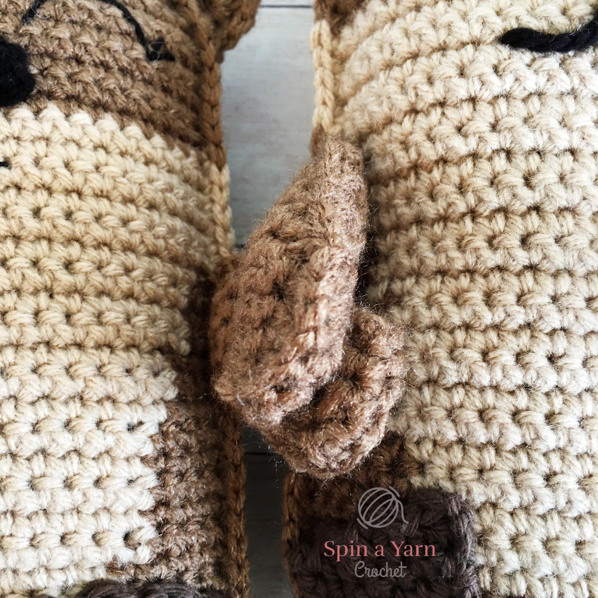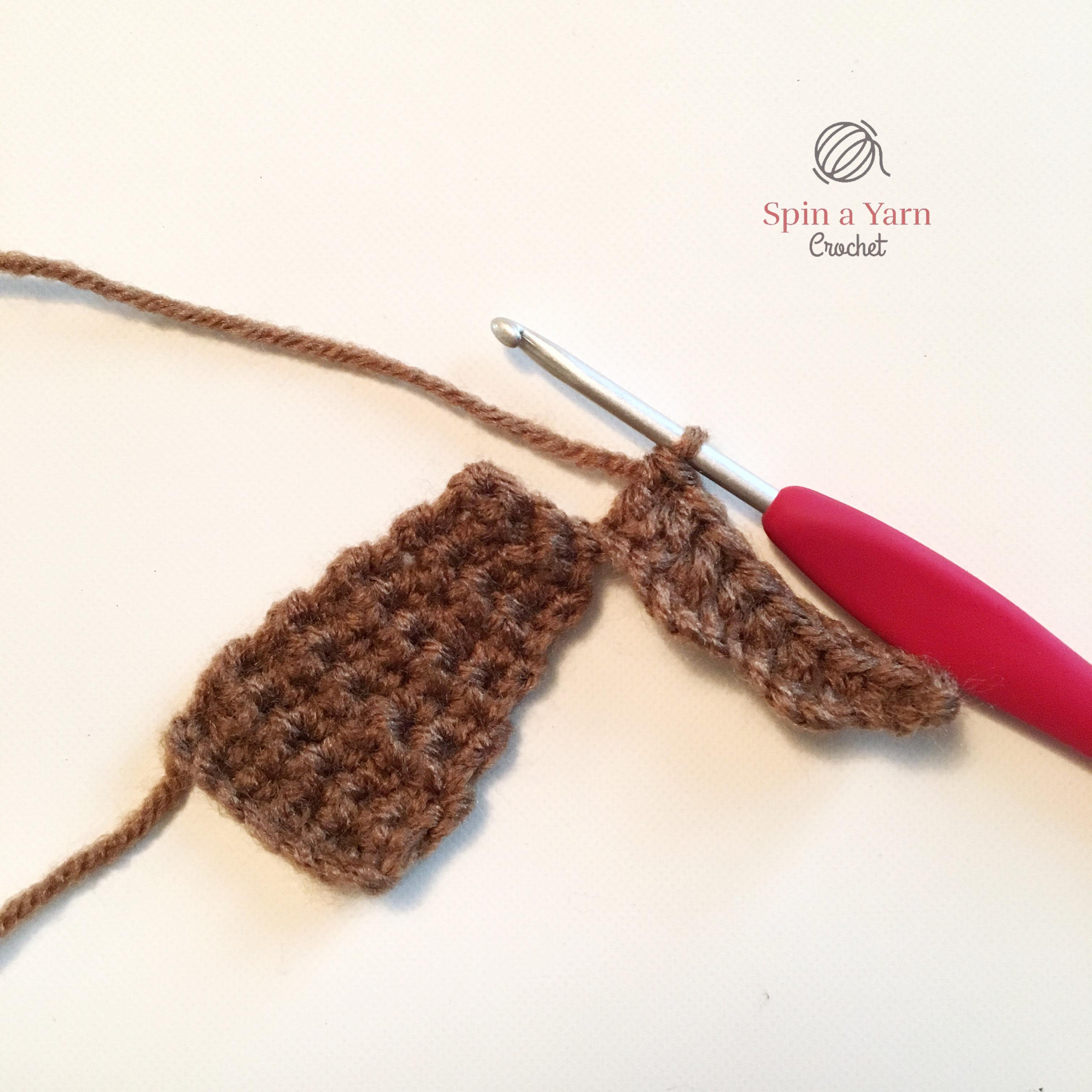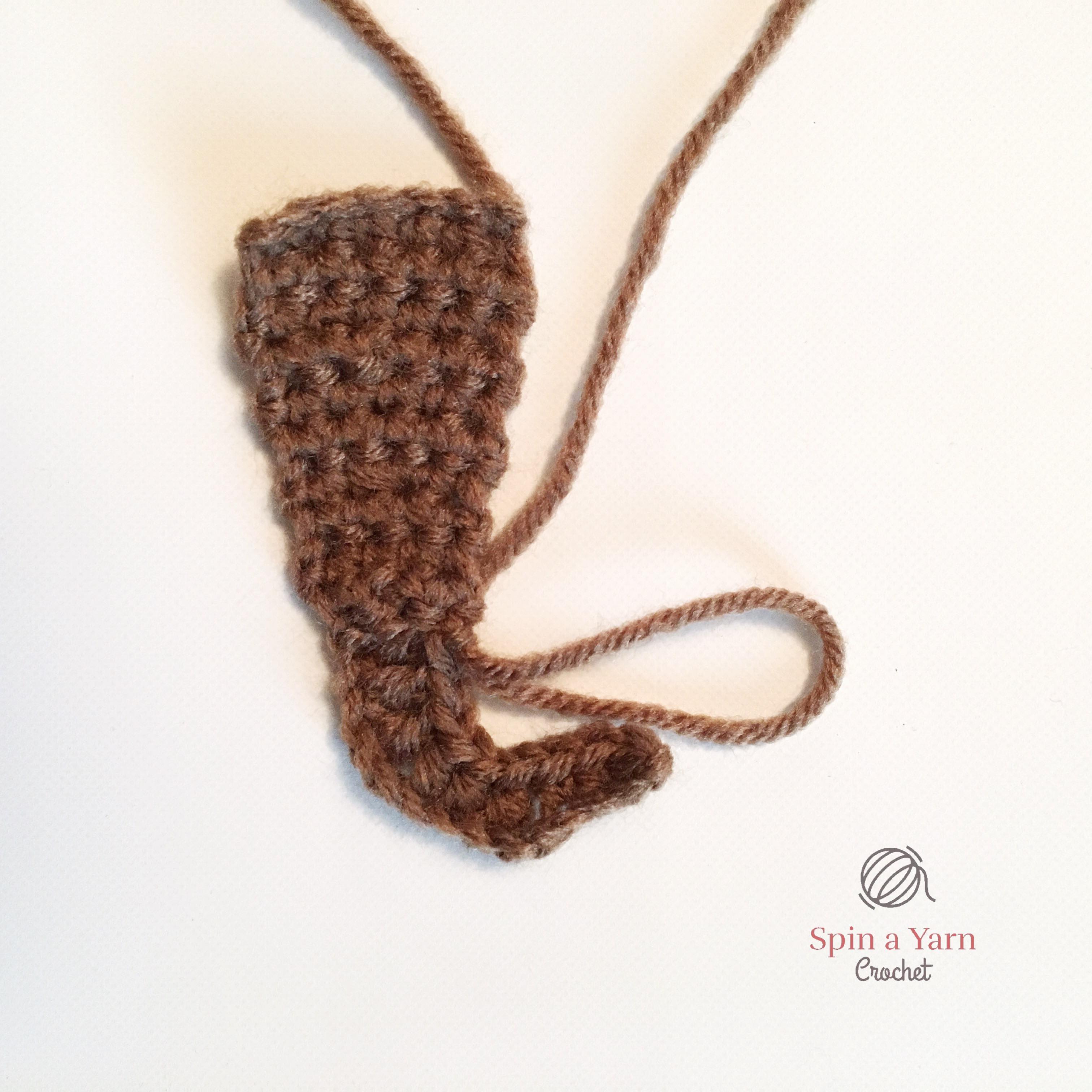 Tie off. Repeat rows 1-9 for the second panel but do not tie off second panel. Place both panels together, matching up all sides, and begin attaching the panels together by chaining 1 and single crocheting around the edge of the panels in Cafe Latte. (Sc, ch, sc) in the bottom corners (i.e. the end that will attach to the body, not the paw end). Stuff when you’ve crocheted about two-thirds of the way around.