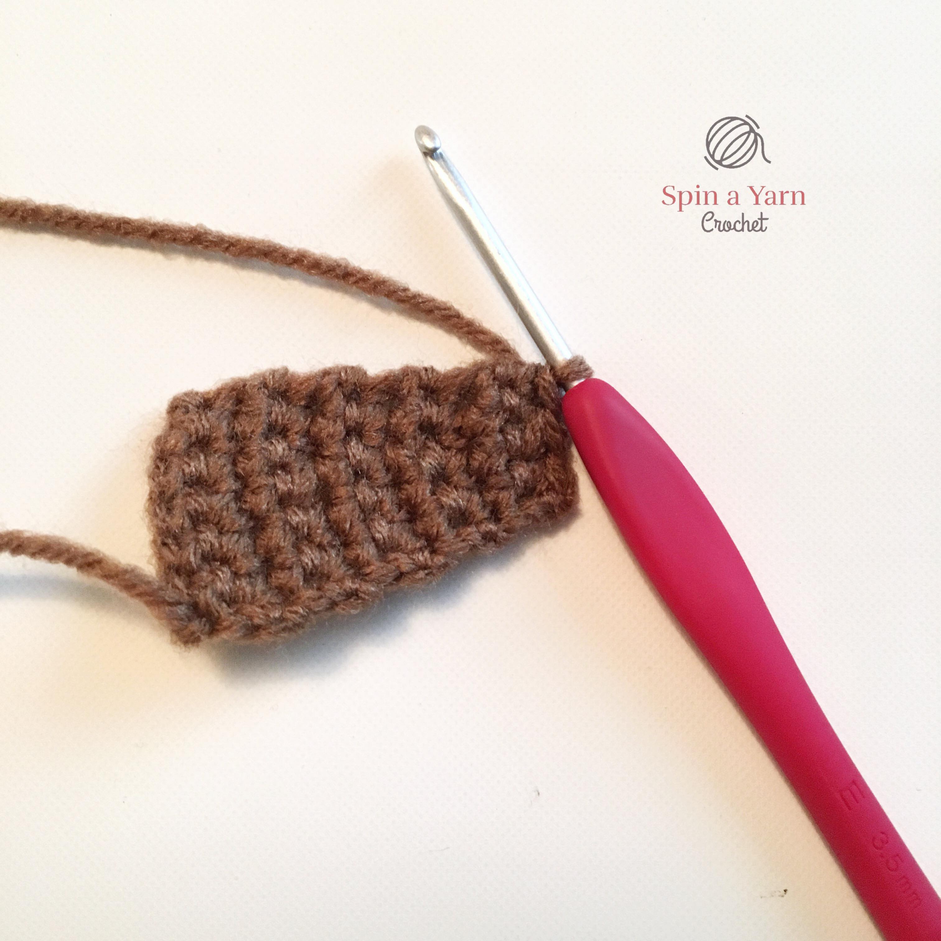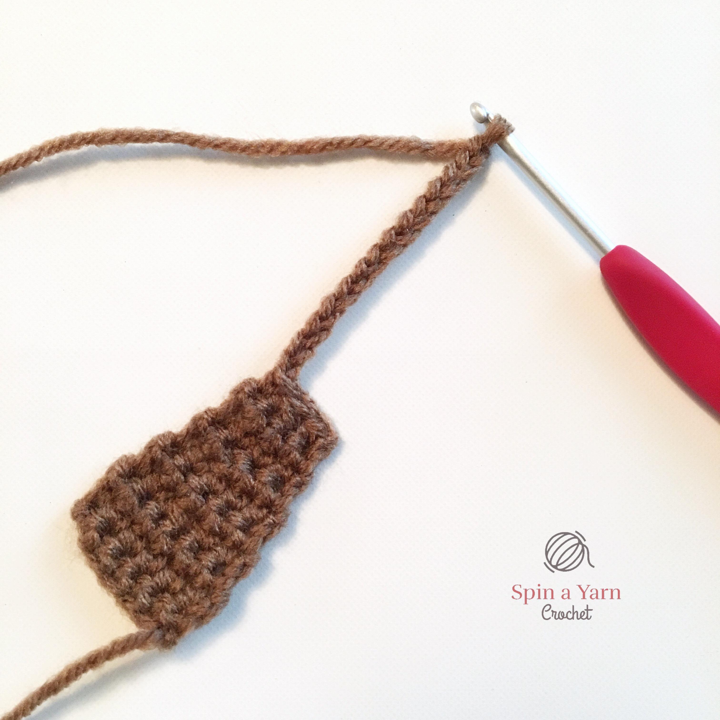 Tie off. Repeat rows 1-2 for the second panel but do not tie off second panel. Place both panels together, matching up all sides, and begin attaching the panels together by chaining 1 and single crocheting around the edge of the panels in Cafe Latte. (Sc, ch, sc) in the bottom corners (i.e. the end that will attach to the head). I did not stuff the ears. Slst to first st. Tie off and poke the yarn tail back inside. Repeat for second ear. Set aside for assembly later.