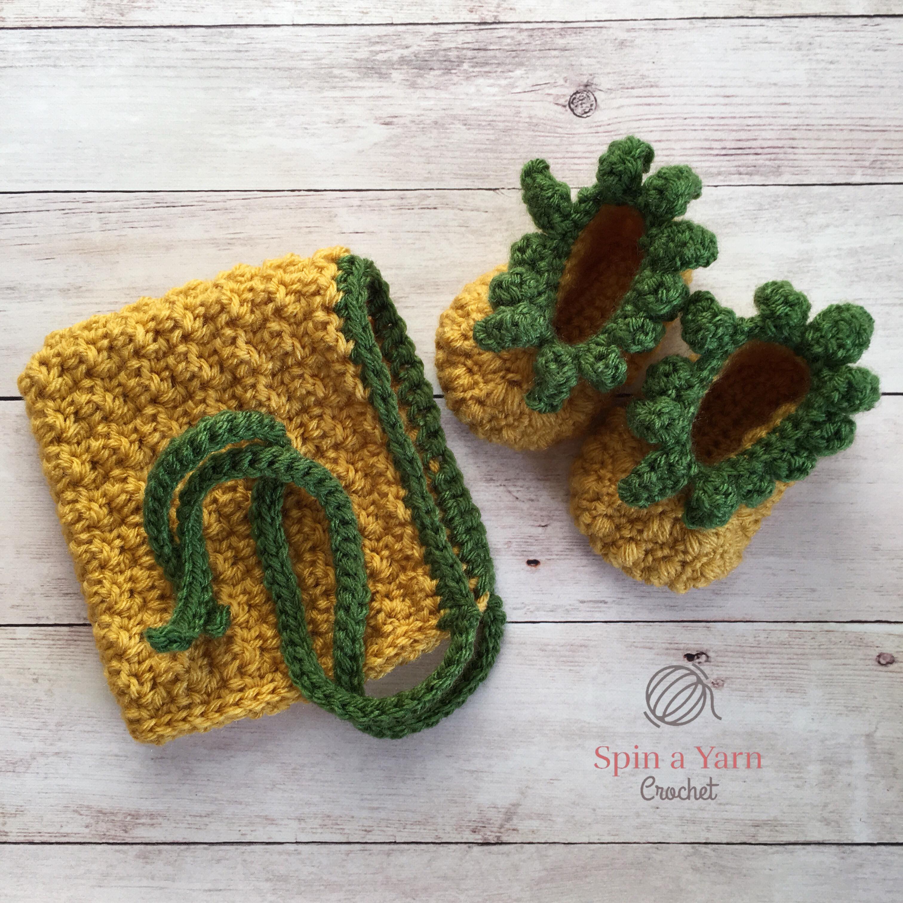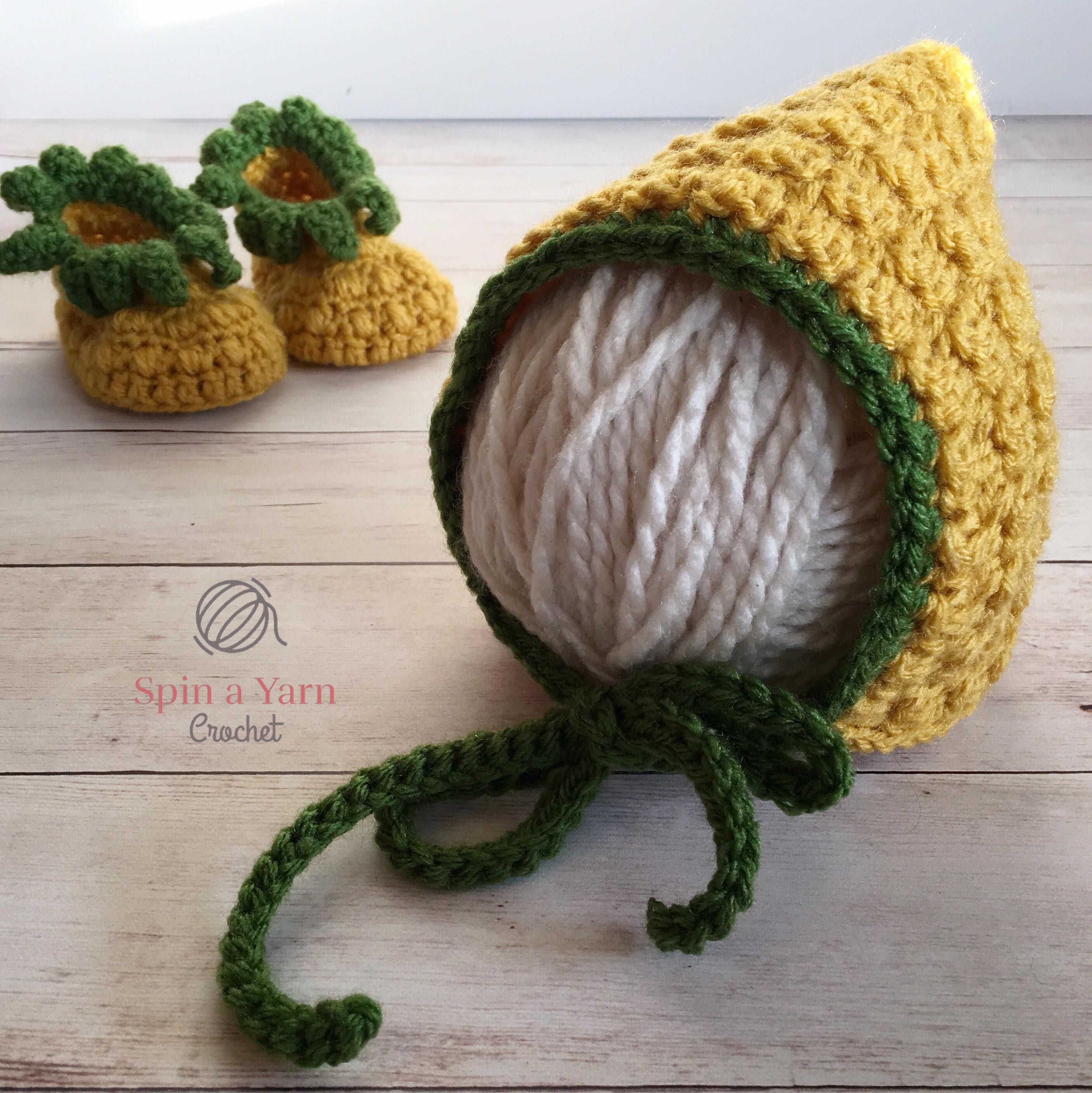 I was also asked by a friend to make some sweet little pineapple booties. The pattern is a paid pattern by Mama Zady Stitches and can be found HERE. Since I had more than enough yarn left over, I also whipped up another pixie bonnet in the same colours to make a set. I love how it turned out!