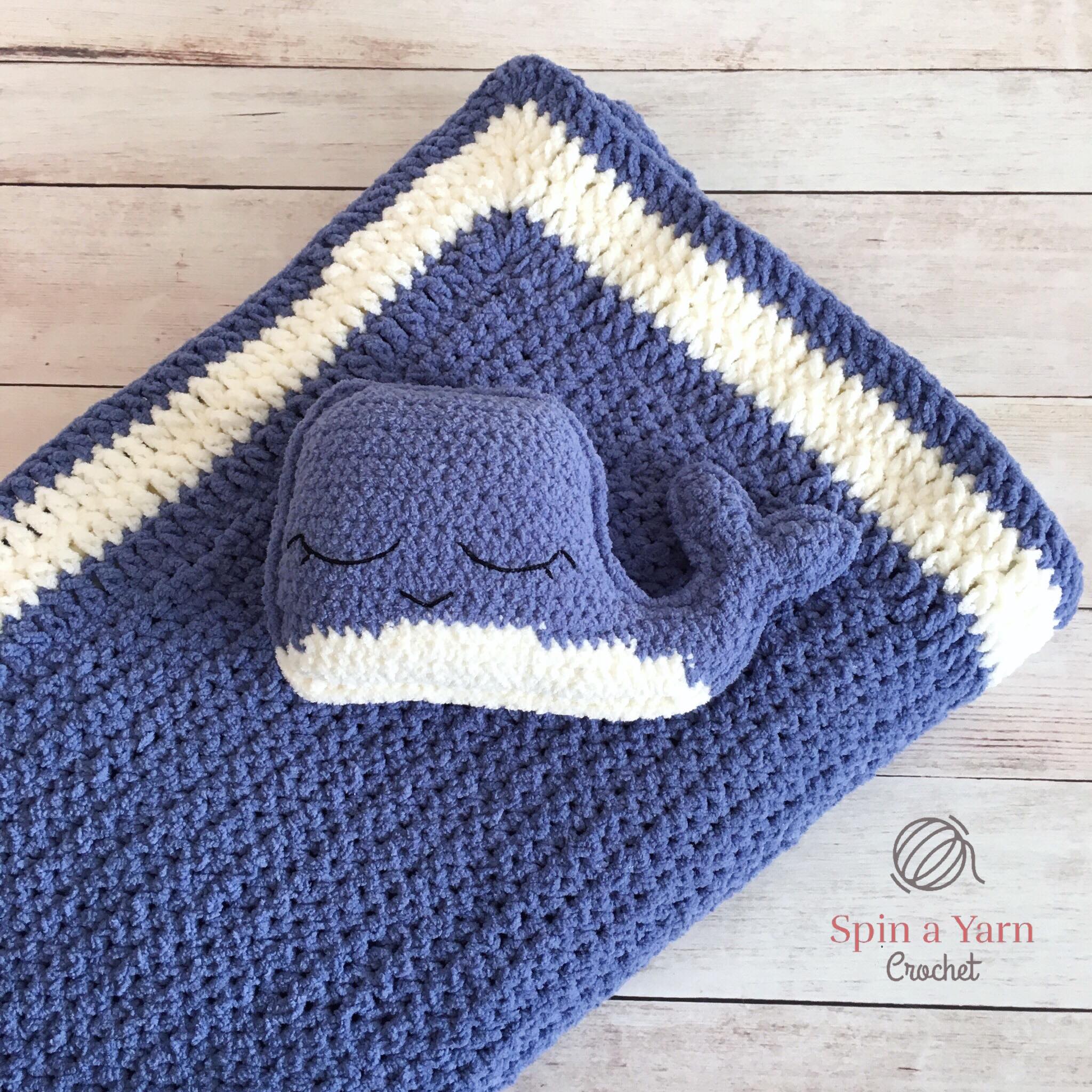 I had ordered quite a bit of extra yarn to be on the safe side, so once I had the blanket finished, I decided to whip up a matching plushie (since that’s kind of my jam). The colours were perfect to make my Whale Amigurumi pattern. I stitched on the eyes and mouth and left off the spout/hat/moustache to make it more baby-friendly, and I also added a little rattle inside (check out the video at the bottom to listen. You might need to turn the volume way up; it’s subtle). The Bernat Blanket Tiny yarn makes amigurumi so soft and squishy; perfect for little hands.