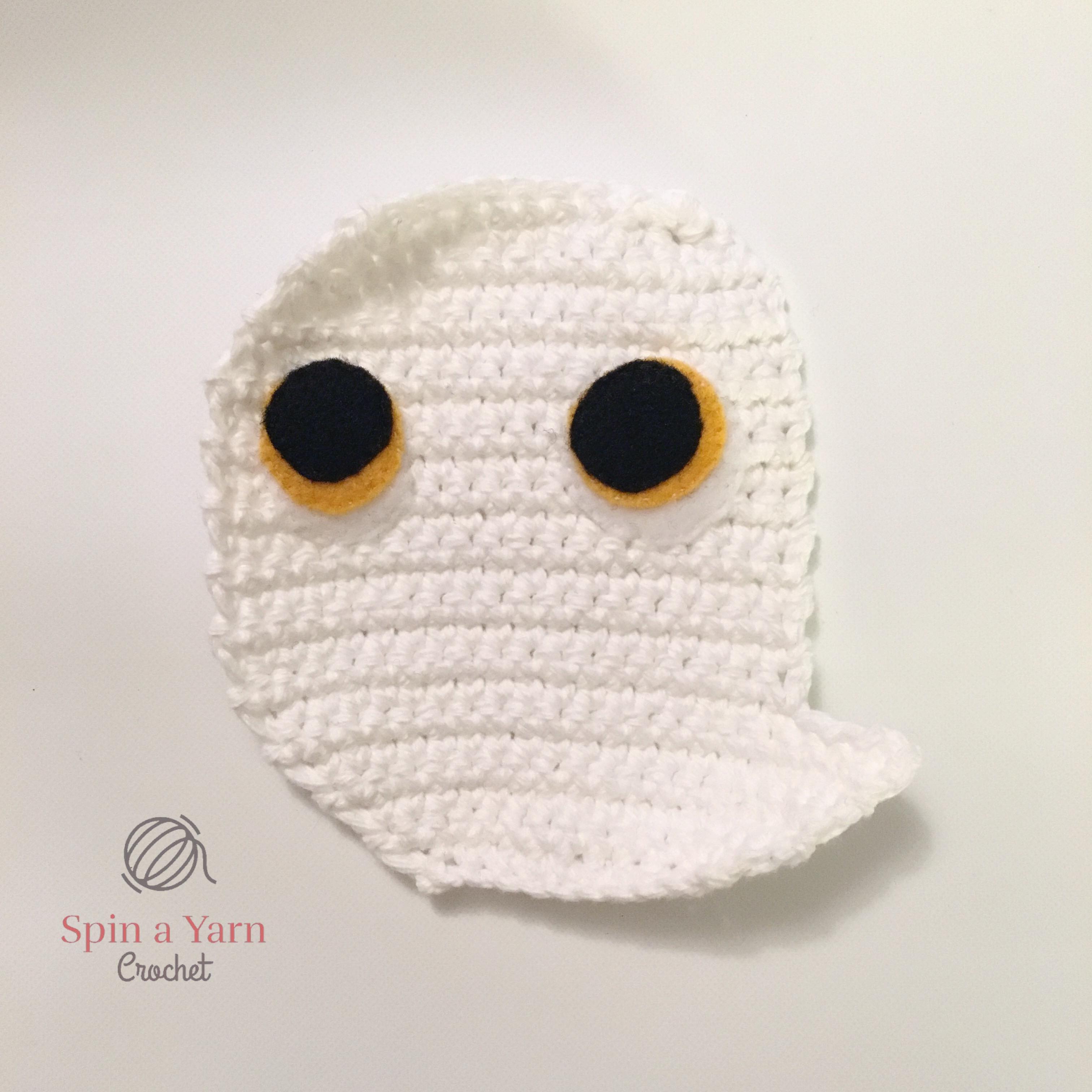 Finally, using black crochet thread, stitch around the eyes to outline them and make them pop! I also added a small stitch over each eye to match the picture (I think it must be a singular eyelash?).