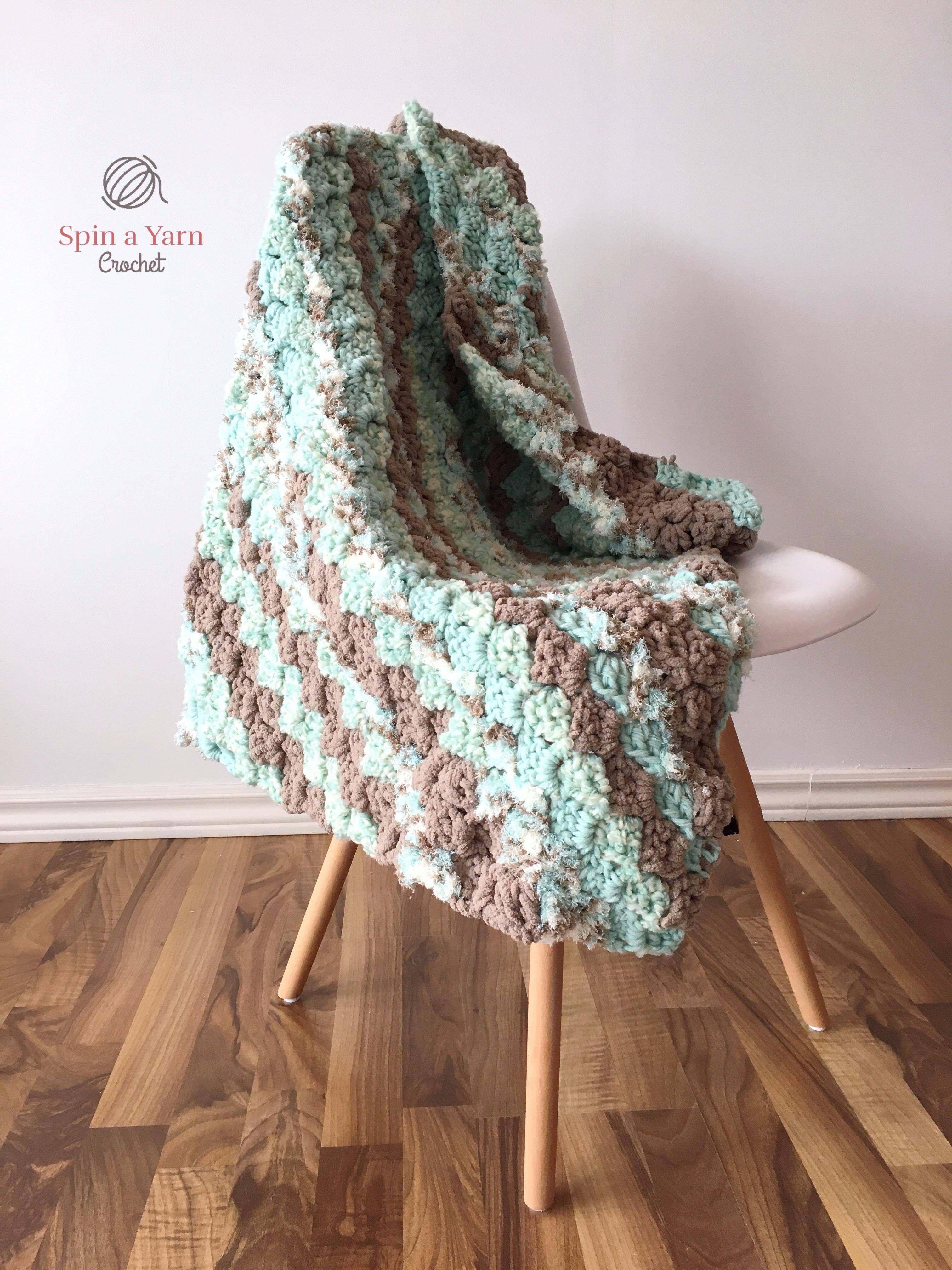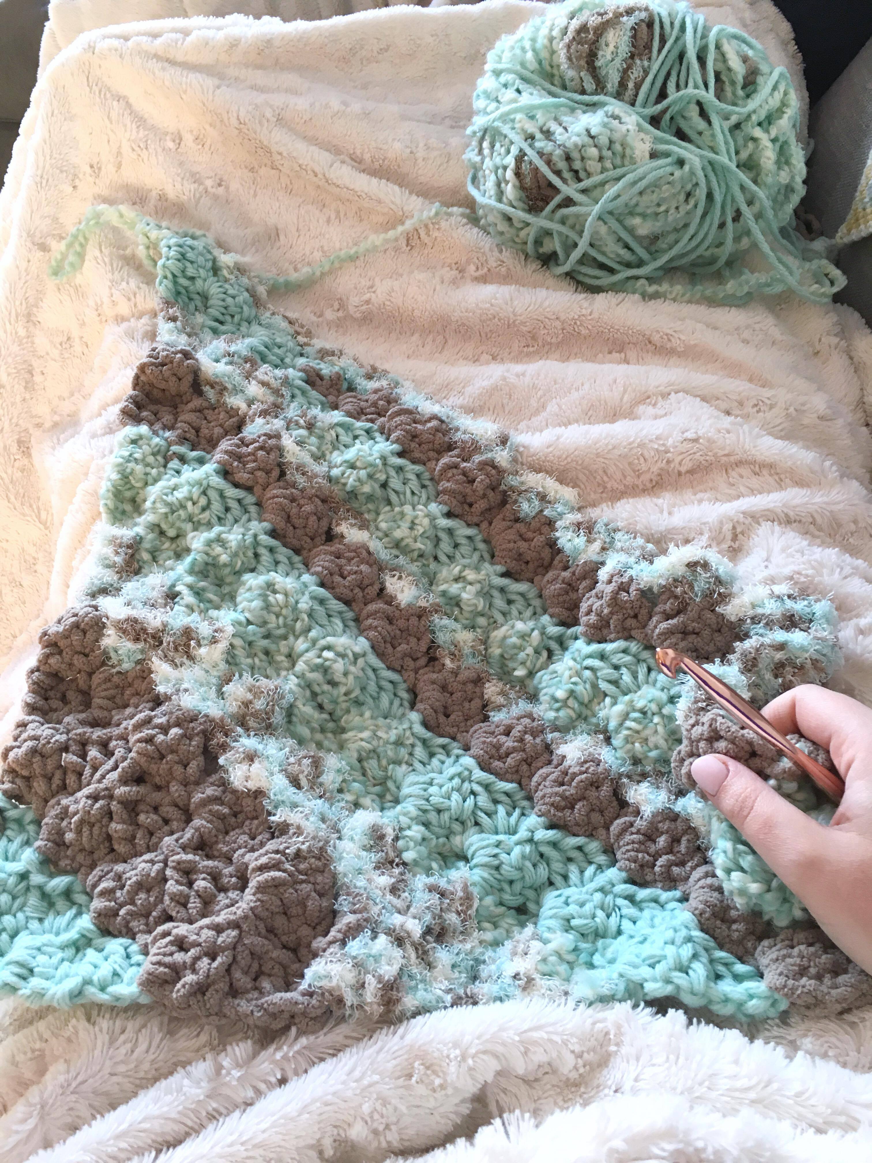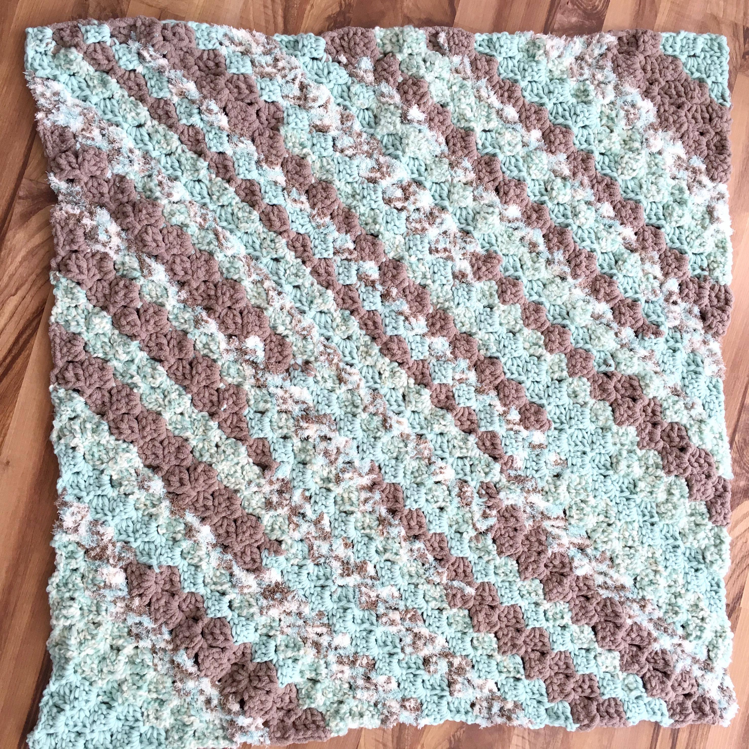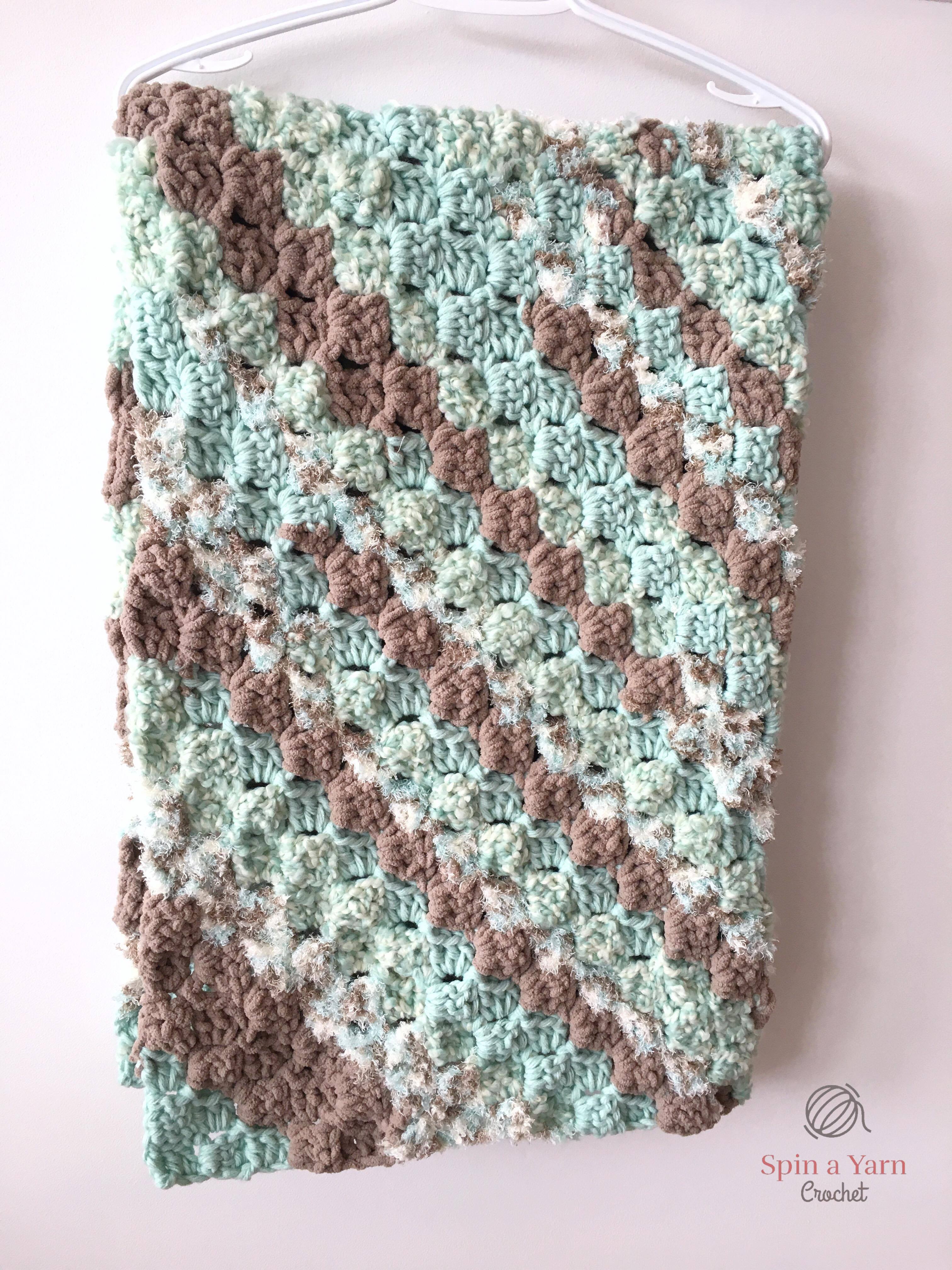 It is a super simple corner-to-corner blanket made using Bernat Baby Bundle yarn. It’s a yarn that is made up of four different types of yarn, giving the finished blanket a really fun texture and look. It is super squishy (perfect for babies, as advertised!) and really soft with beautiful drape. I was afraid the C2C stitch would be too dense, causing the blanket to be a bit stiff, but it isn’t at all.