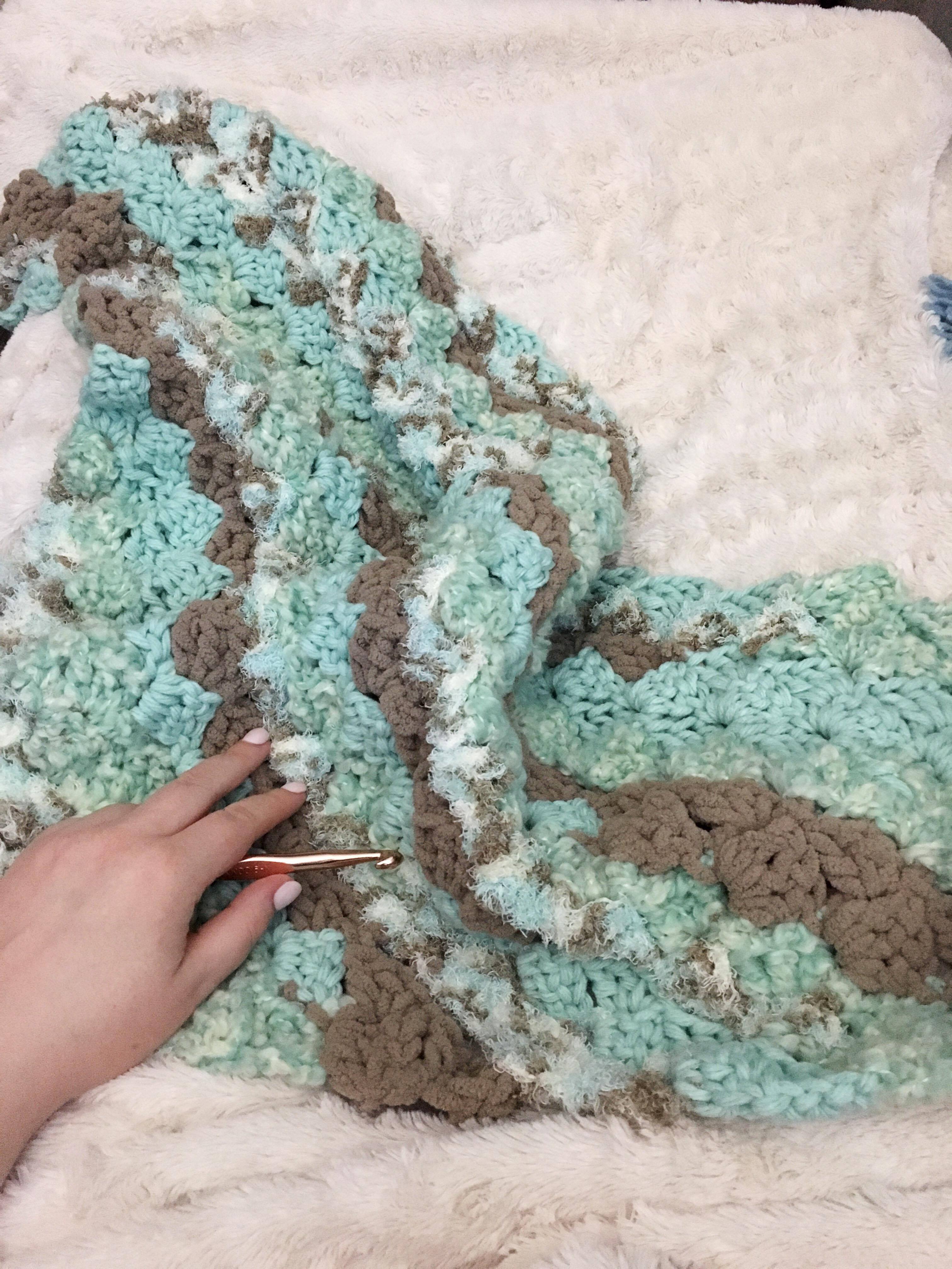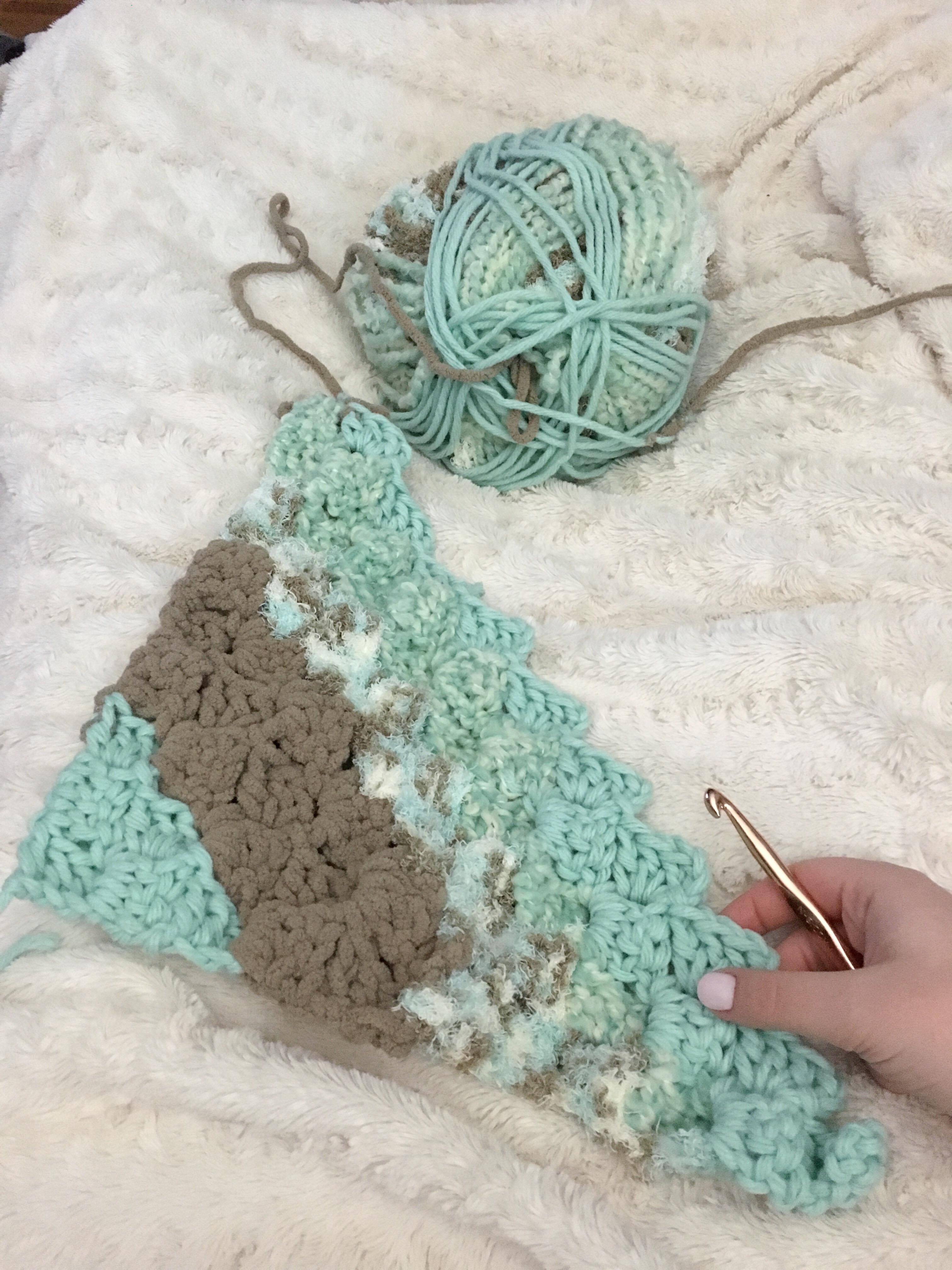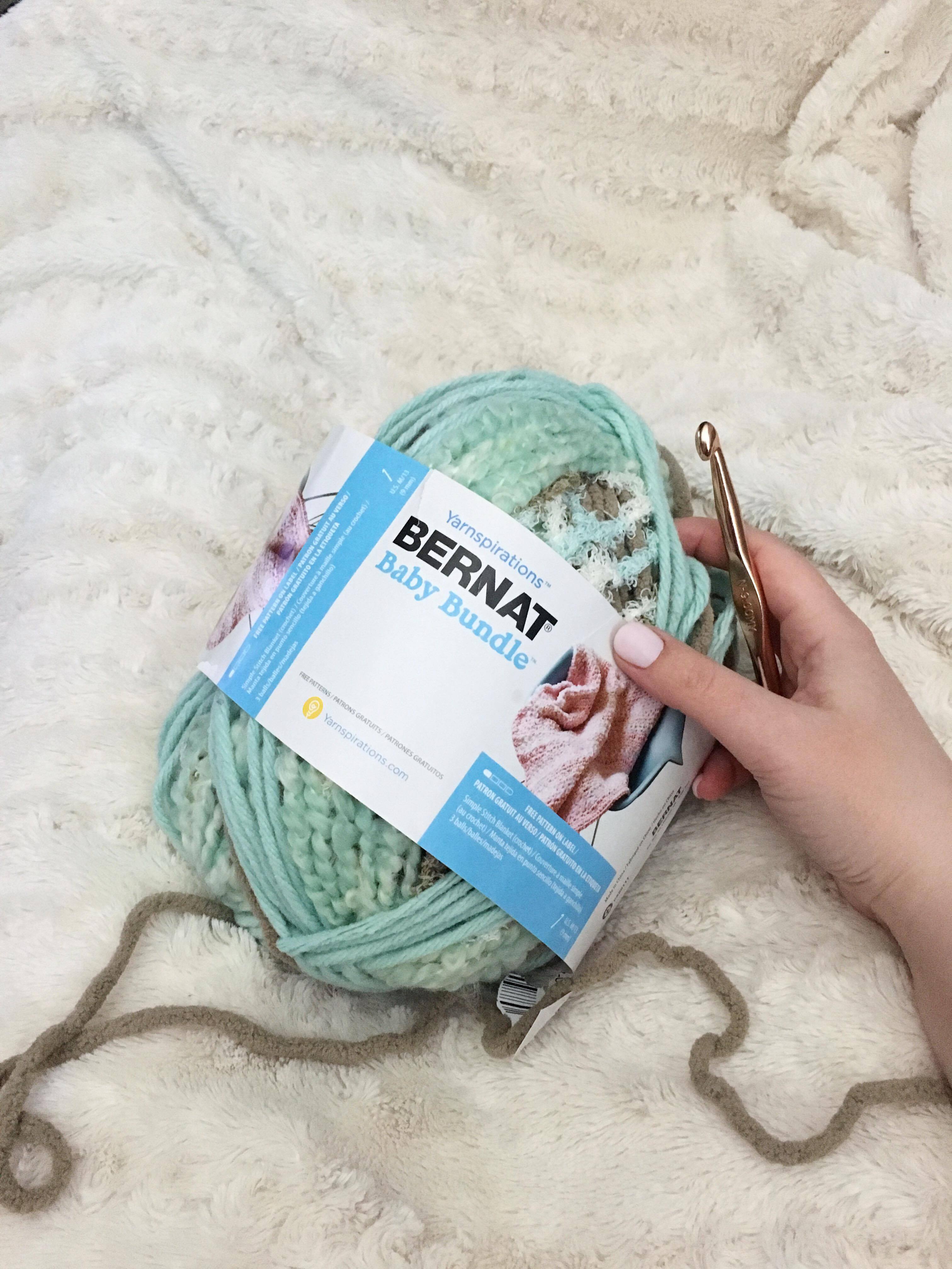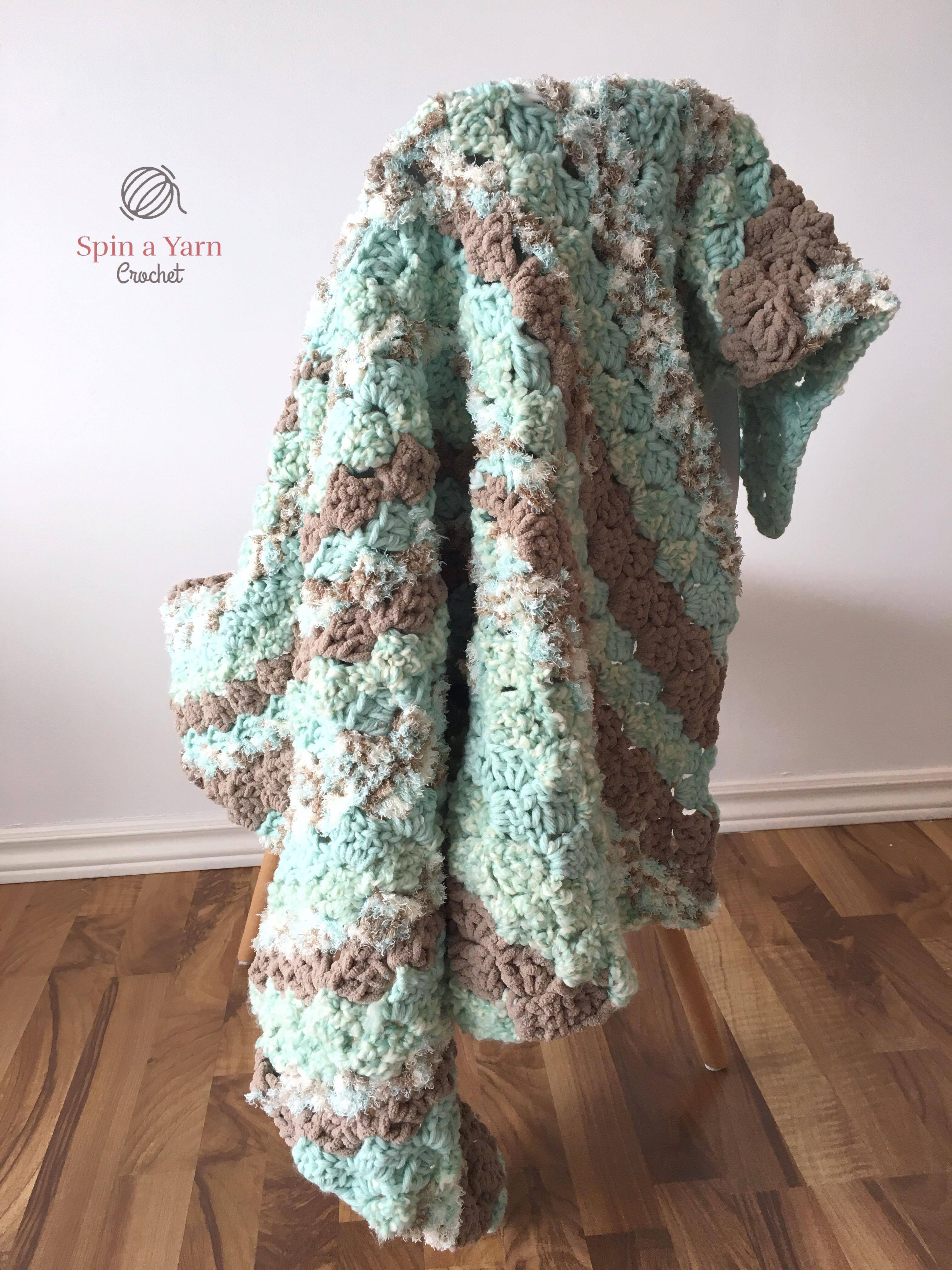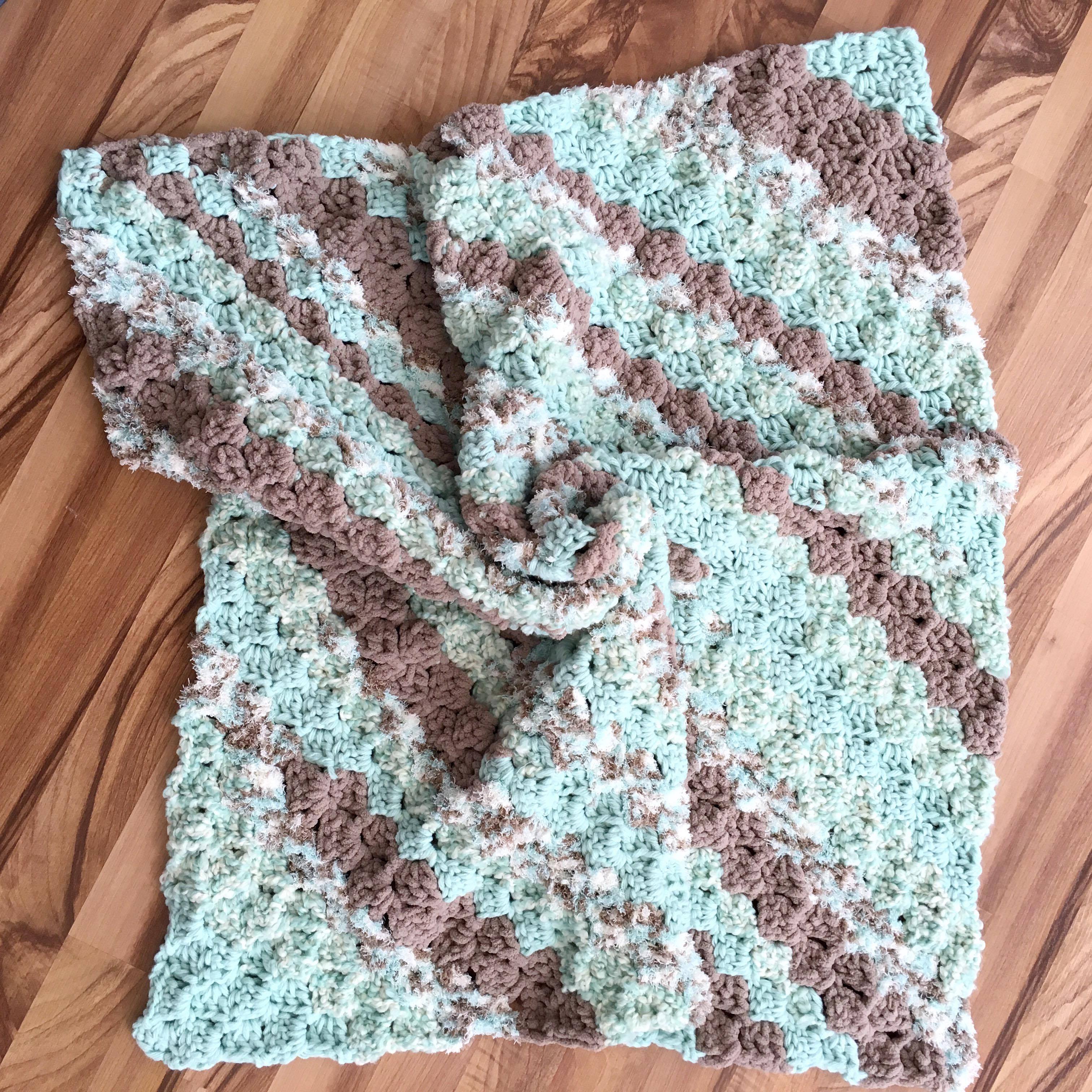 It is a super simple corner-to-corner blanket made using Bernat Baby Bundle yarn. It’s a yarn that is made up of four different types of yarn, giving the finished blanket a really fun texture and look. It is super squishy (perfect for babies, as advertised!) and really soft with beautiful drape. I was afraid the C2C stitch would be too dense, causing the blanket to be a bit stiff, but it isn’t at all.