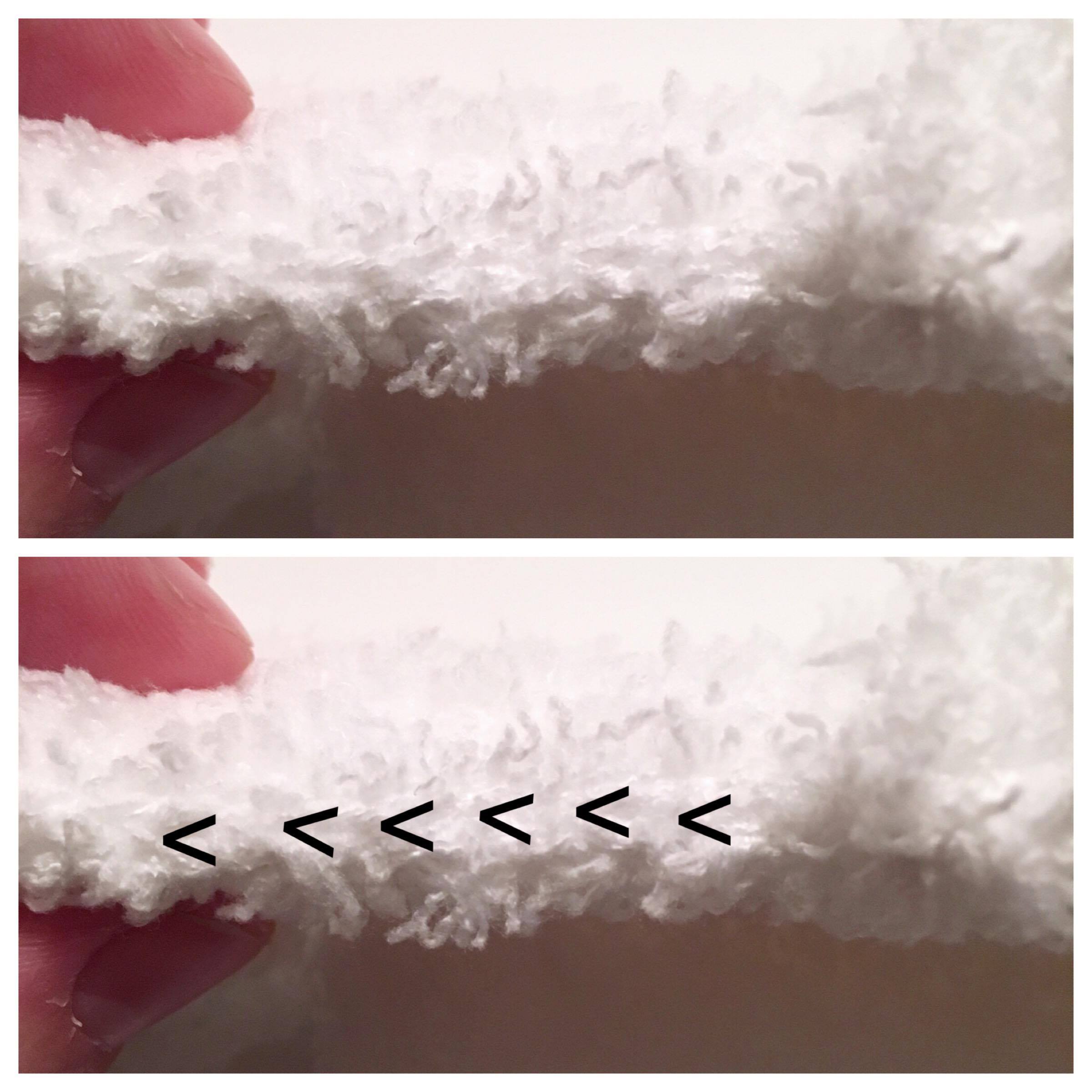 Now, before I leave you too disheartened, here’s my tip for crocheting with this yarn. When I crochet, I’m usually looking at my work from the side, like the first photo below. Ordinarily, you can see exactly where you need to insert your hook from the side. Not so with this yarn. However, if you look directly down at the row from the top, you can more easily see the “V”s of each stitch, like in the second photo below.