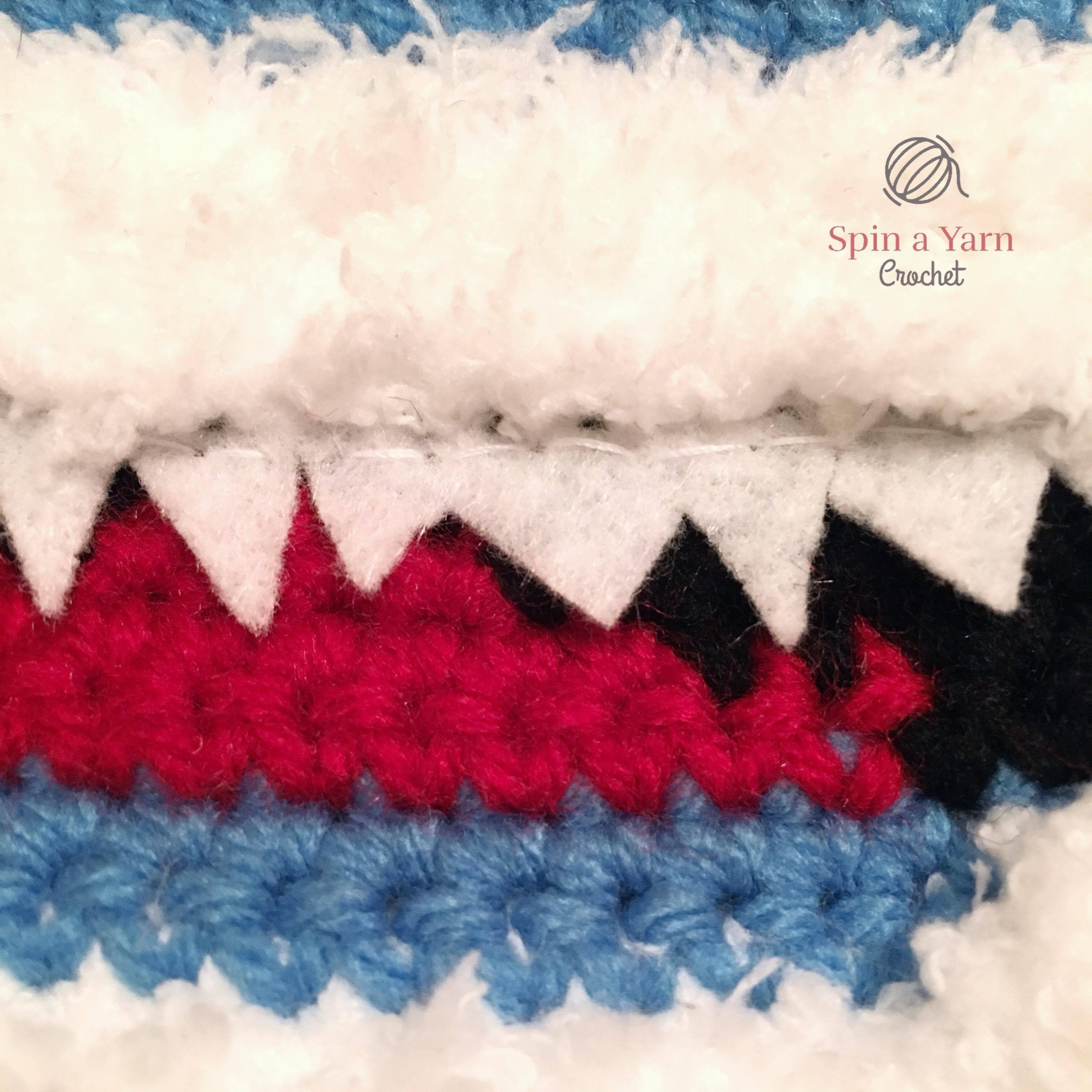 Then, you will line the teeth up with the top of the mouth and stitch them down by stitching straight across the top. The fuzzy yarn above the mouth will hide the stitching! I felt this was secure enough for me, but if you’d like them to be more secure, you can stitch around each tooth as well.