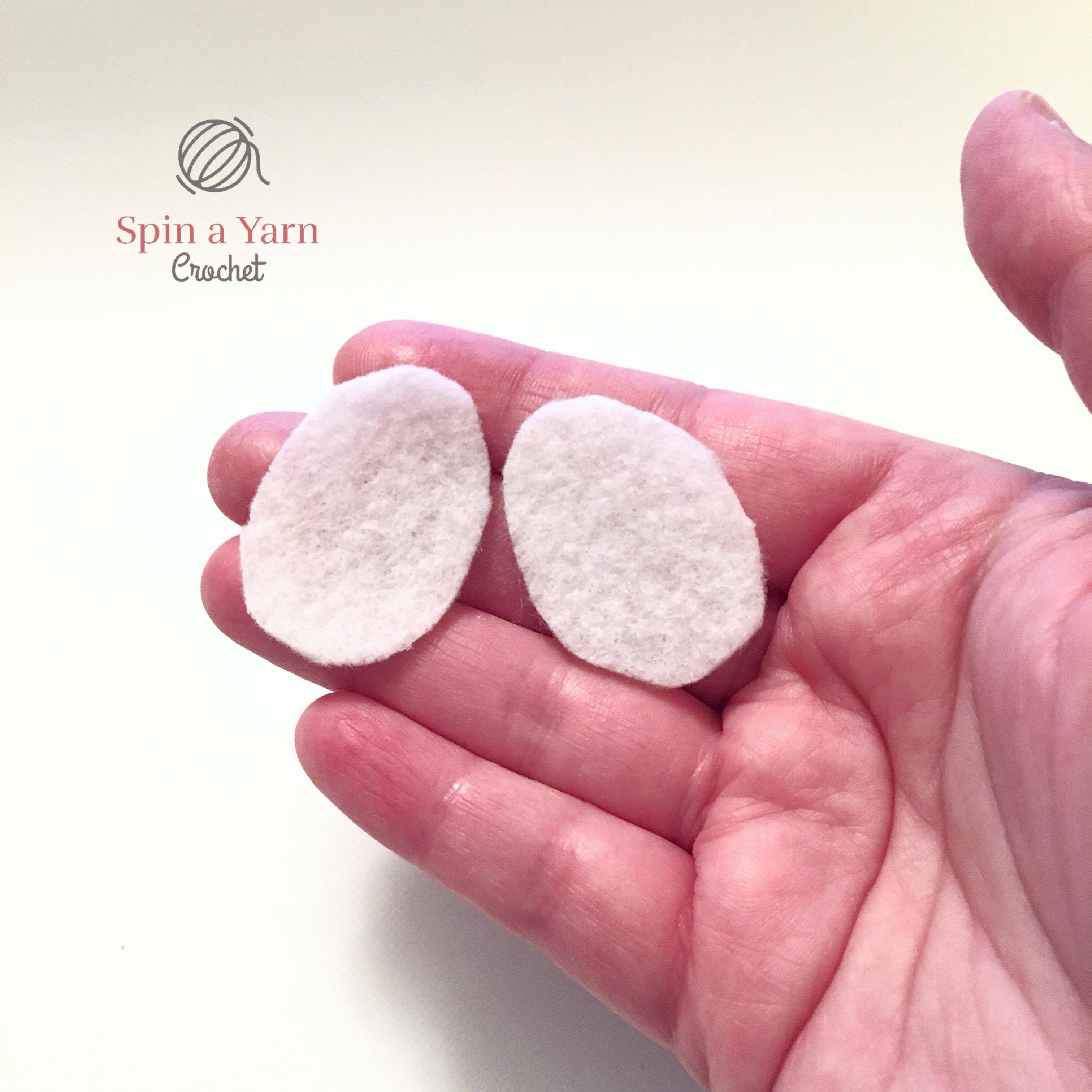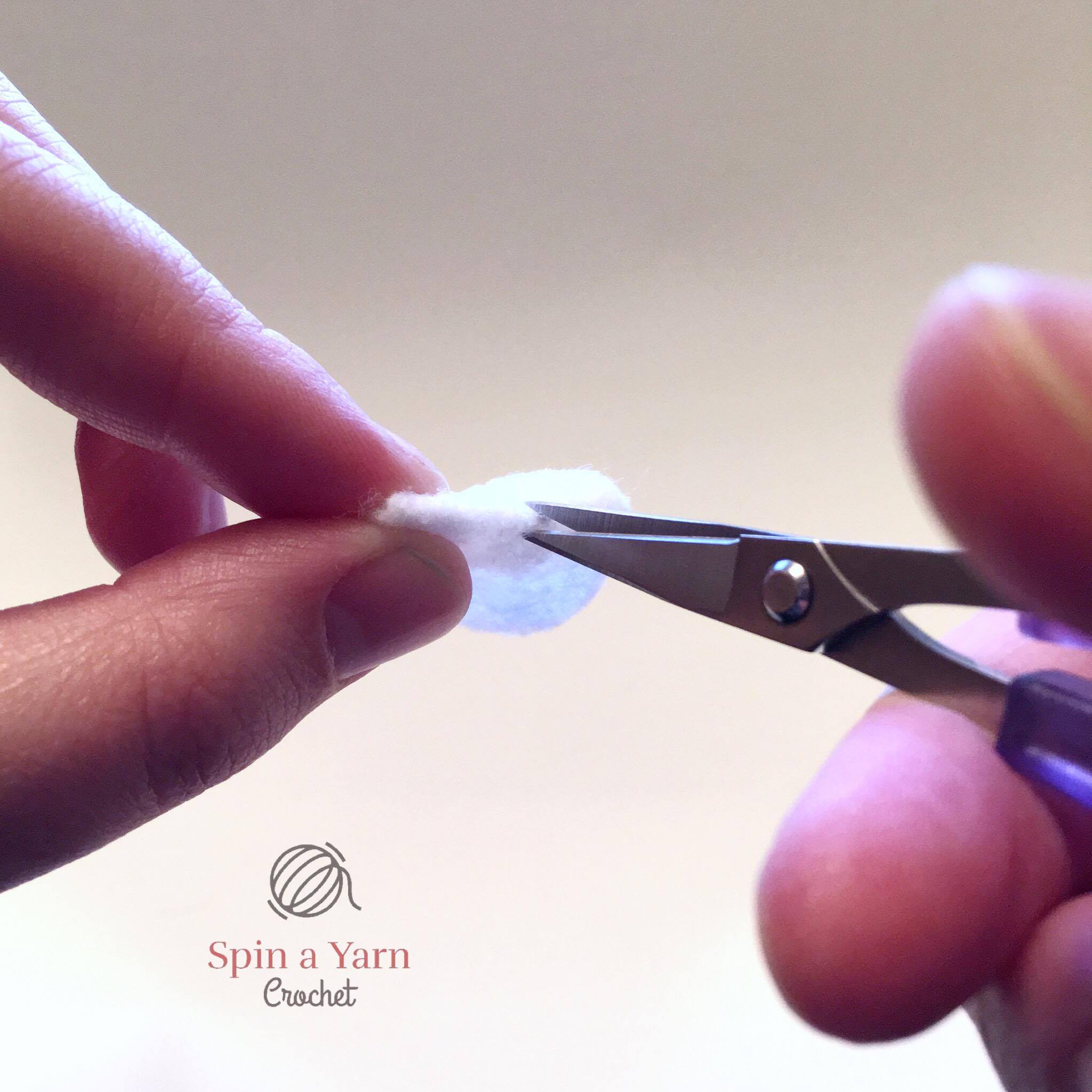 For the eyes, I cut out two ovals, then folded them over to cut a tiny hole toward one end and then inserted the safety eye, like so: