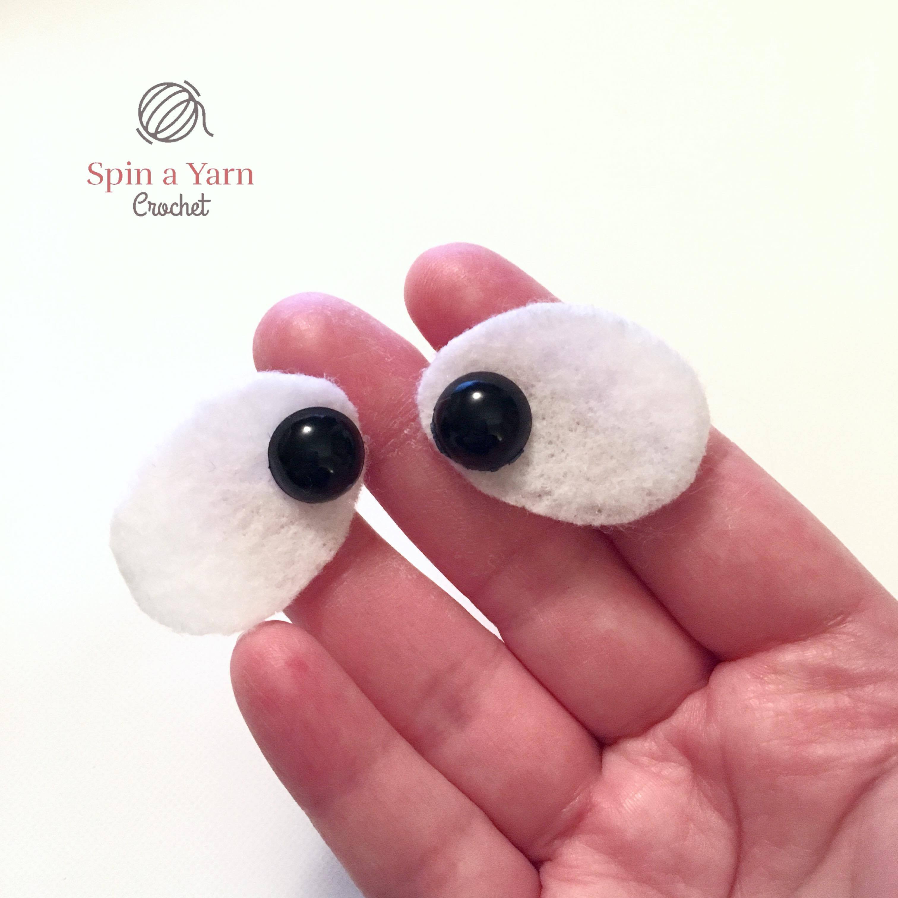 Then, position the eyes on the face and insert the safety eye into the front panel of your Bumble and attach the fastener on the back. Now your eyes are secure and you can stitch around the outside of the felt pieces with a sewing needle and white thread without having to worry about them moving around.