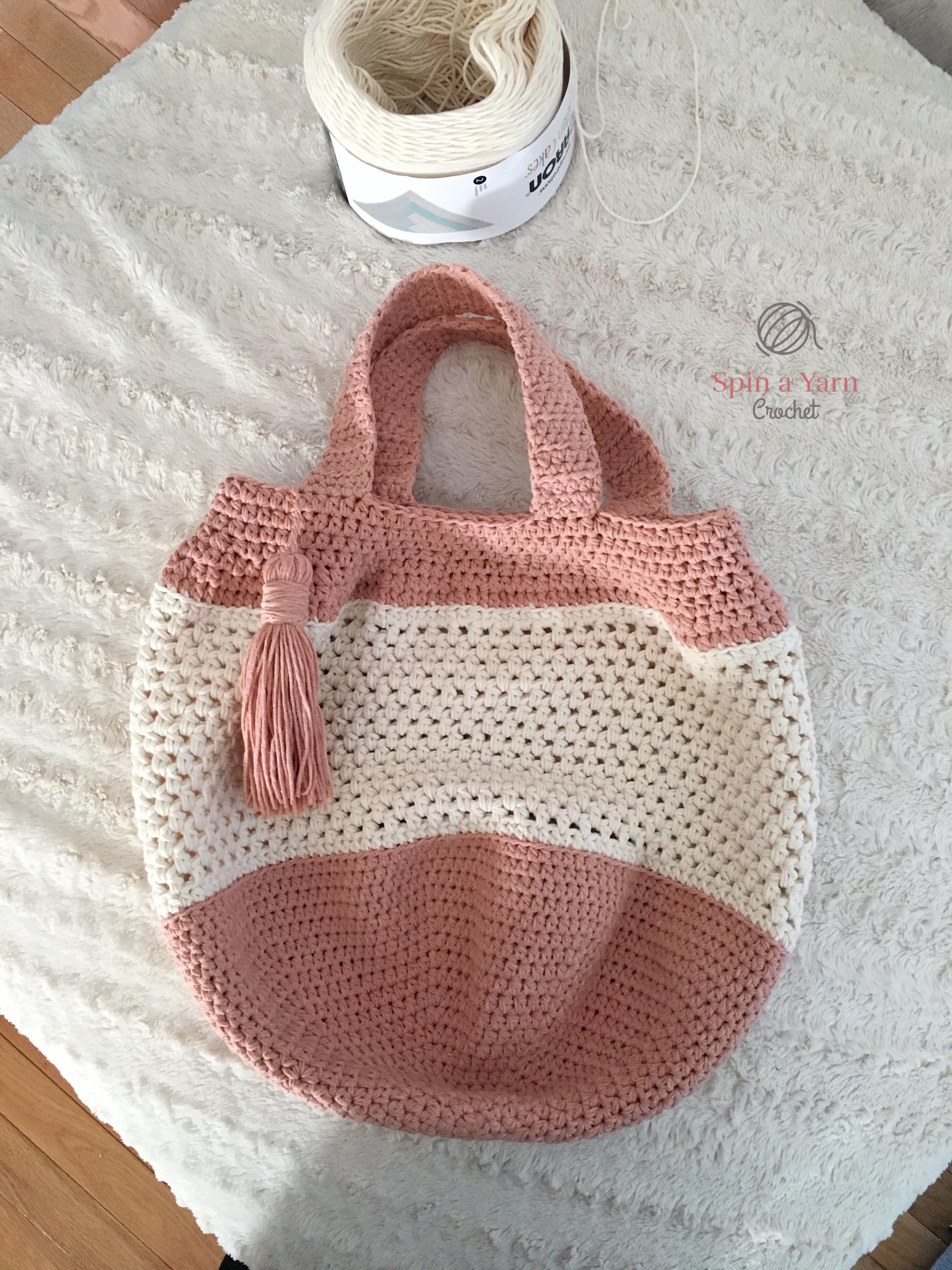 I opted to use Caron Cotton Cakes in the colours Cream and Coral (which I love; every time I go to Michael’s I want to pick more up but I have no projects in mind to make! Suggestions welcome so I have an excuse to buy more.) I was a little concerned that the Caron Cotton Cakes yarn might not be stiff or durable enough for this bag, since the pattern calls for mercerized cotton, which I didn’t have (lookin’ at you with heart-eyes, 24/7 Cotton) . So, I made an executive decision and doubled up the yarn for this bag. I really love how it came out! The stitch work is really enhanced with the doubled yarn and it makes the bag super durable for everyday use.