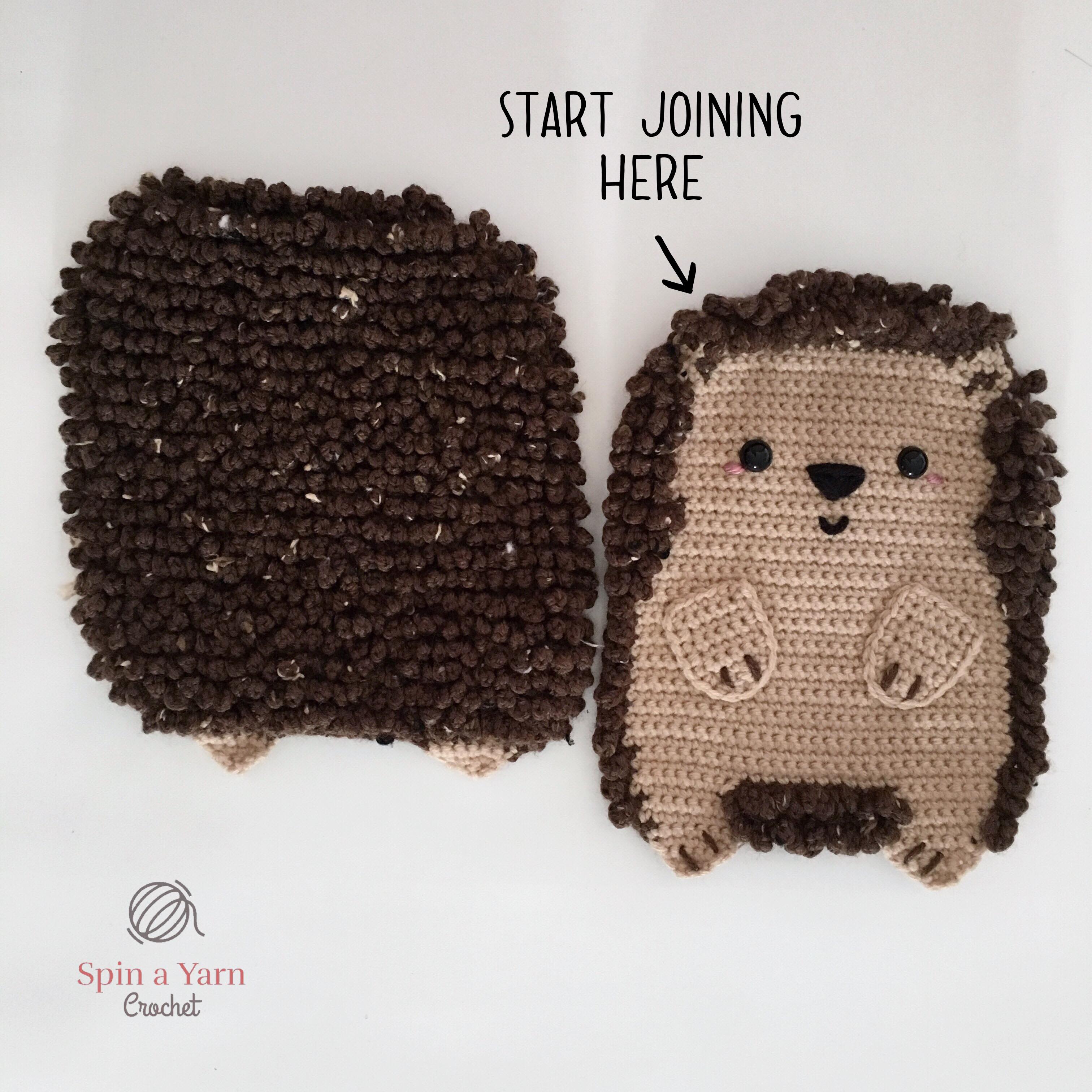 Starting on the top of the head on the left side (see photo above), begin attaching the panels together by chaining one and single crocheting around the outside of the panels in Brown.