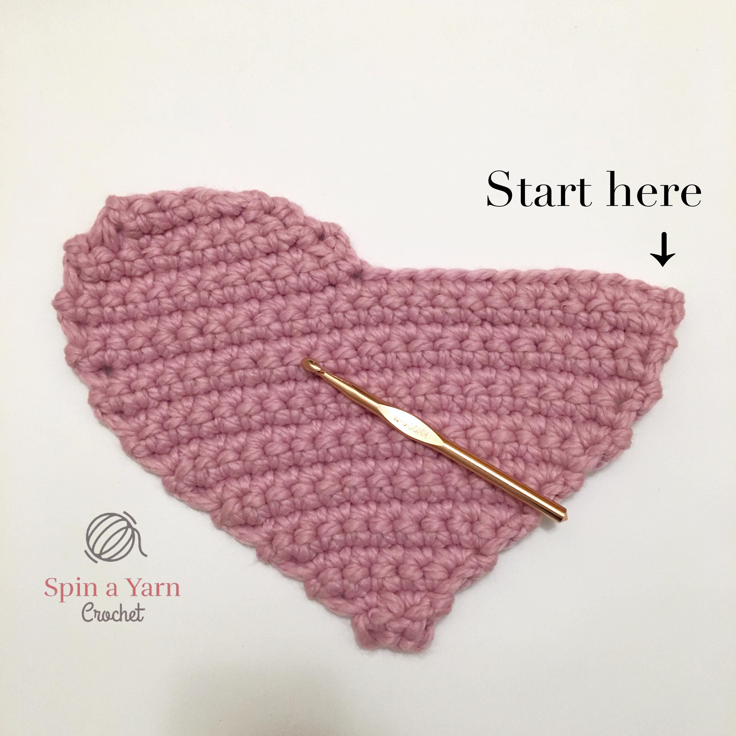 Crochet all the way down and around the heart and up the opposite side. Stop here and pull up a long loop.