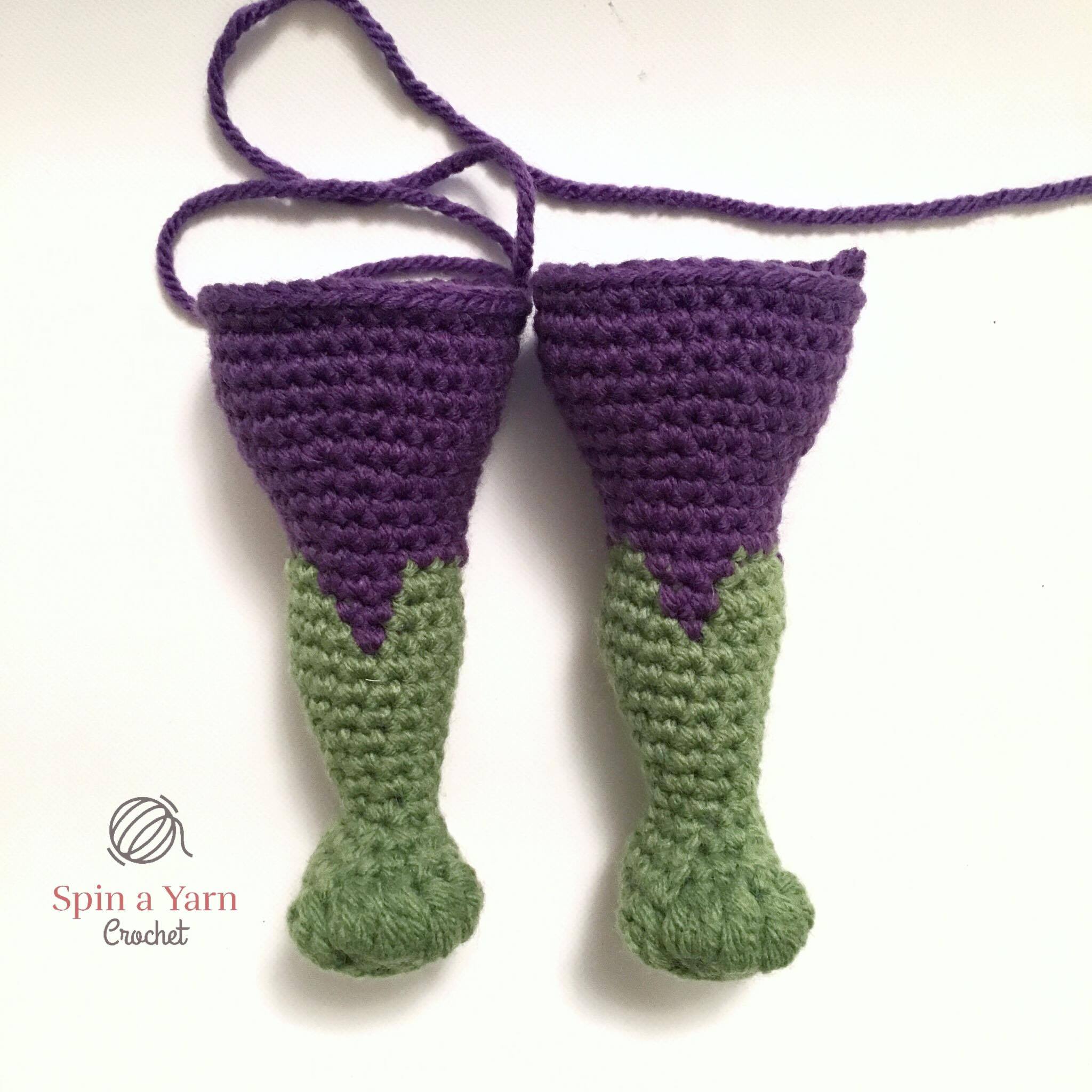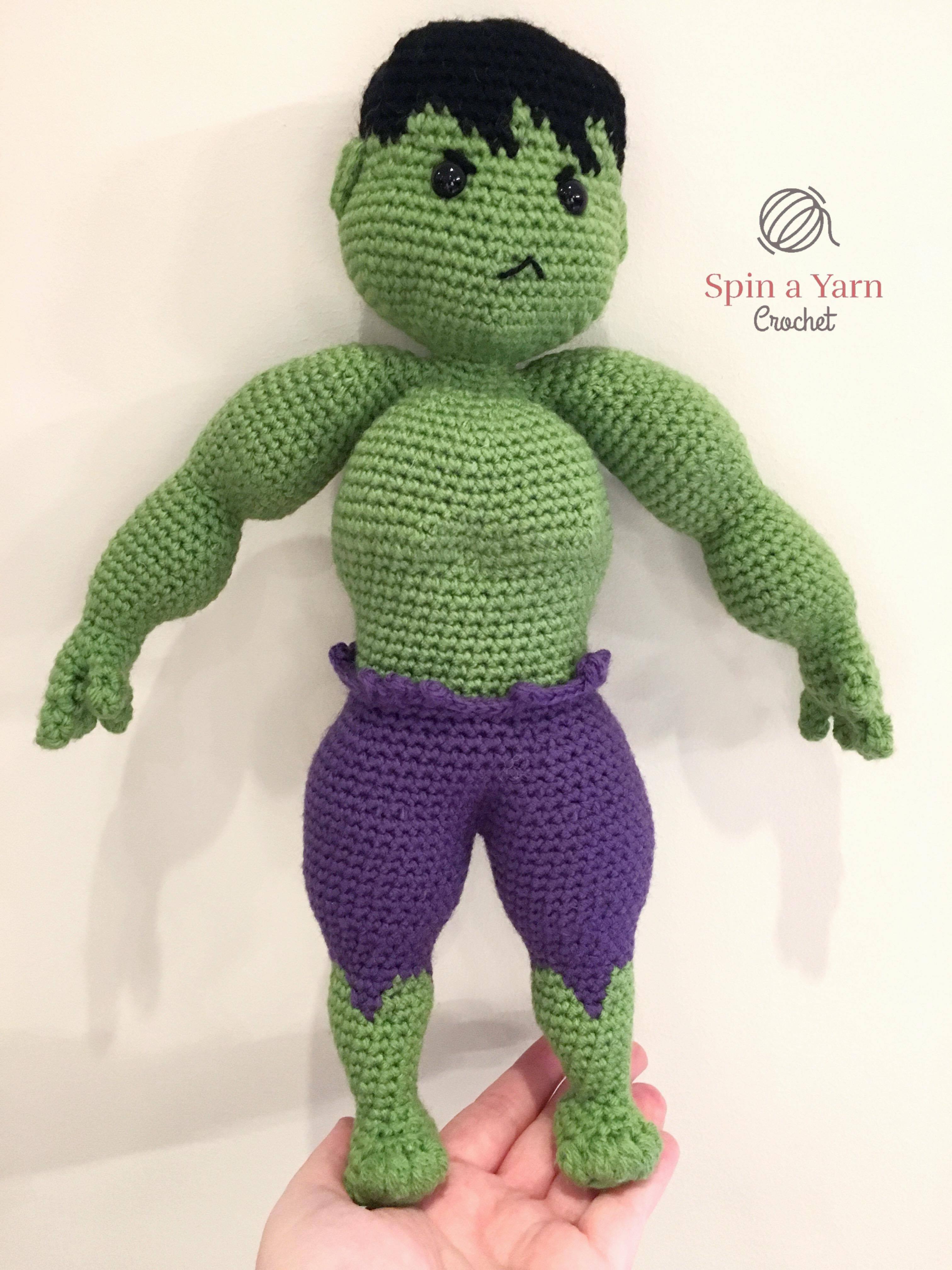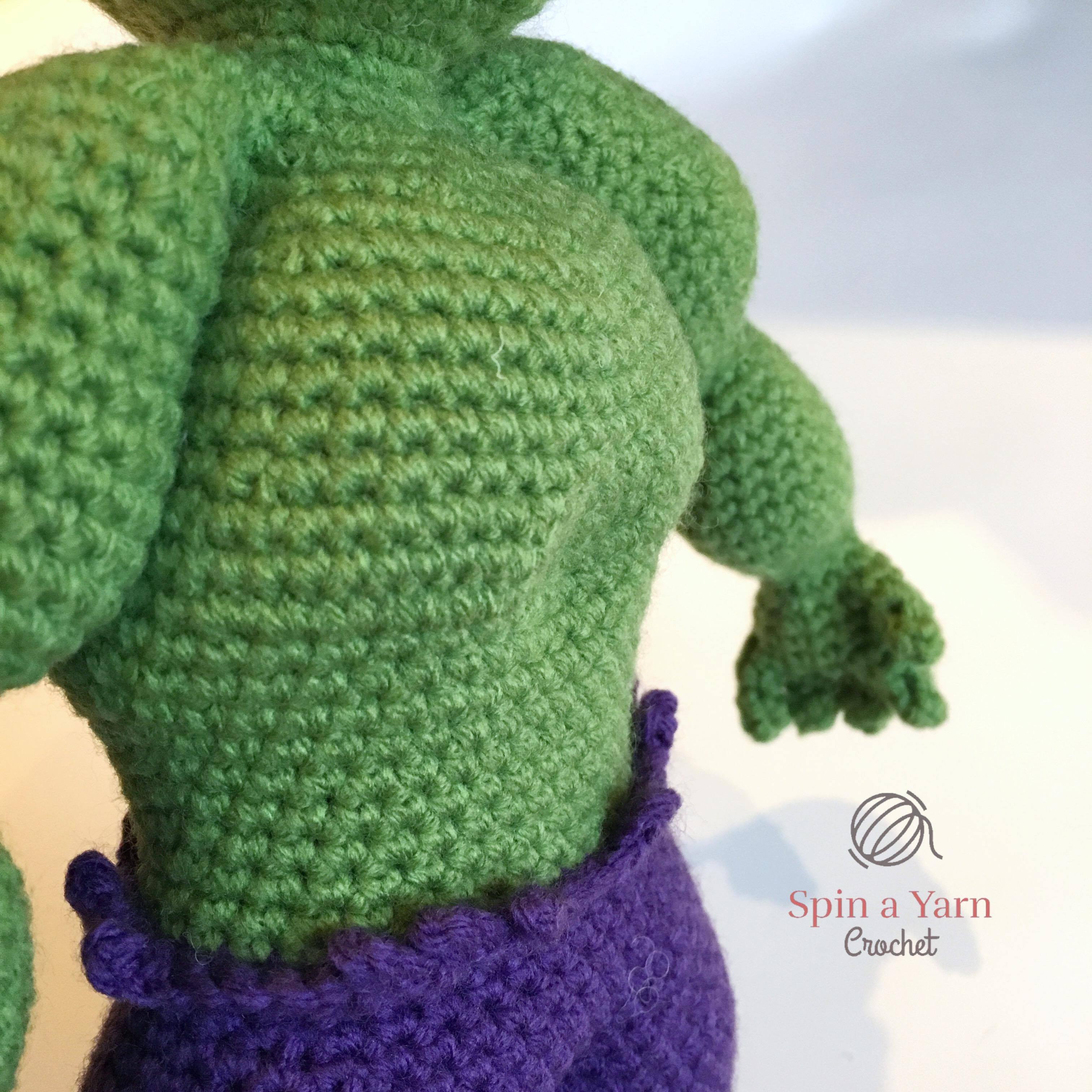 I didn’t have a specific size in mind when I started designing but, in order to design and include the musculature shaping, my Hulk ended up being freaking huge, which I guess is fitting. I totally forgot to measure him before sending him off to his new owner, but I would guesstimate his finished measurement to be approximately 33cm/13″ from top to bottom. You can size him down by going down a hook size, or going down in both hook and yarn size.