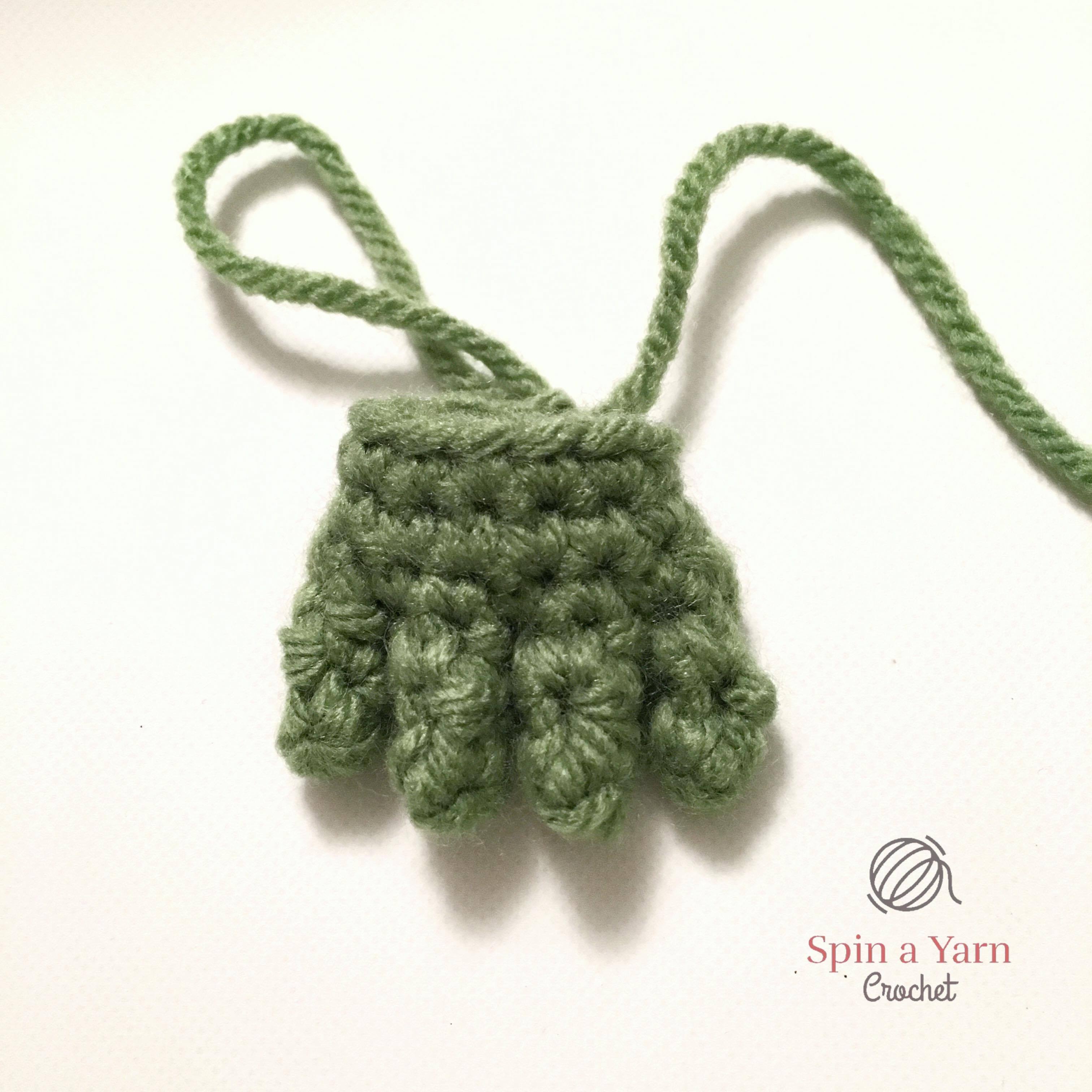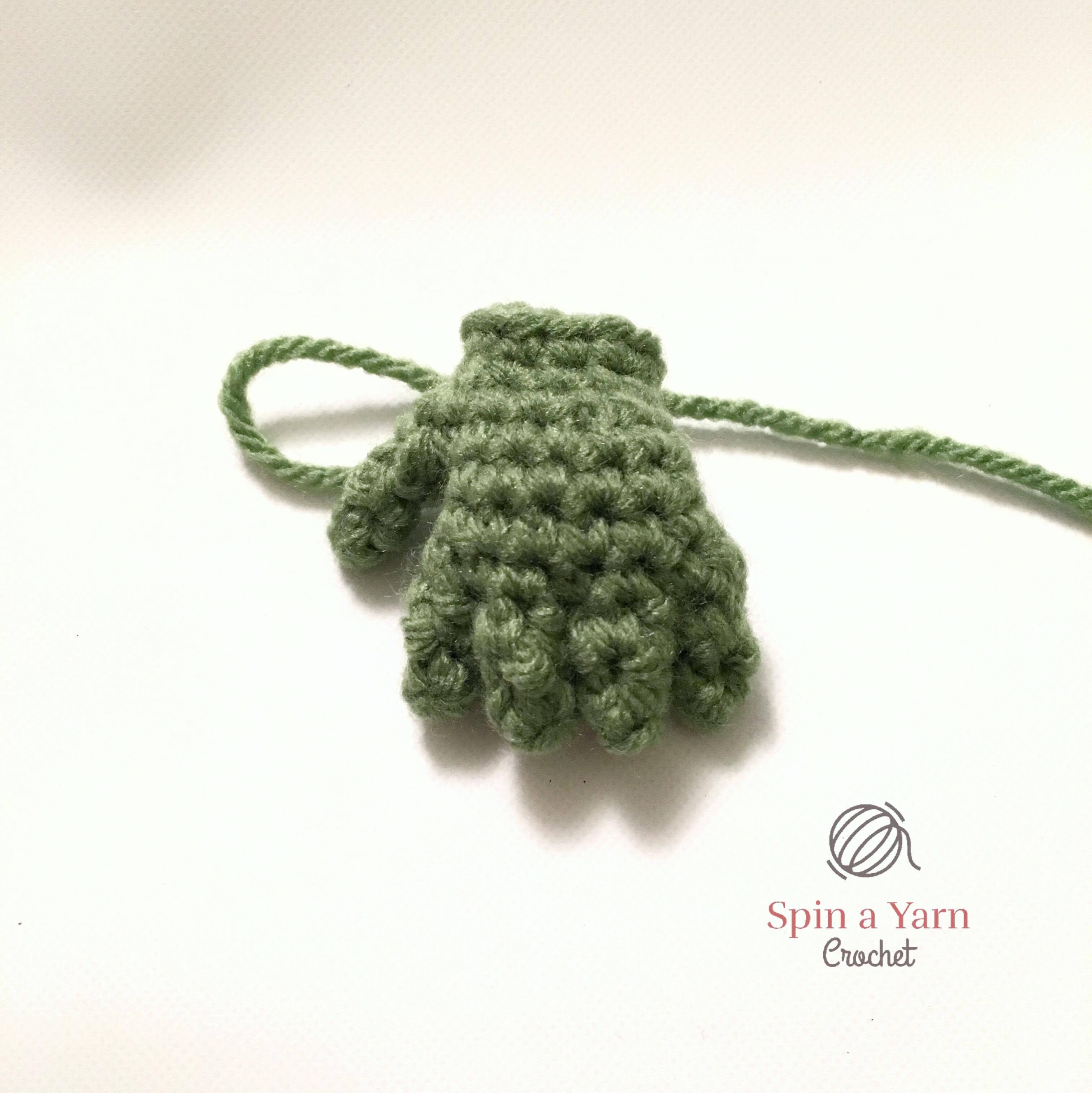 Rnd 4: Sc 8 around the hand, then join the fifth finger by sc around the 3 sts of the finger, then sc 4 of rem sts of the hand (15 sts)
