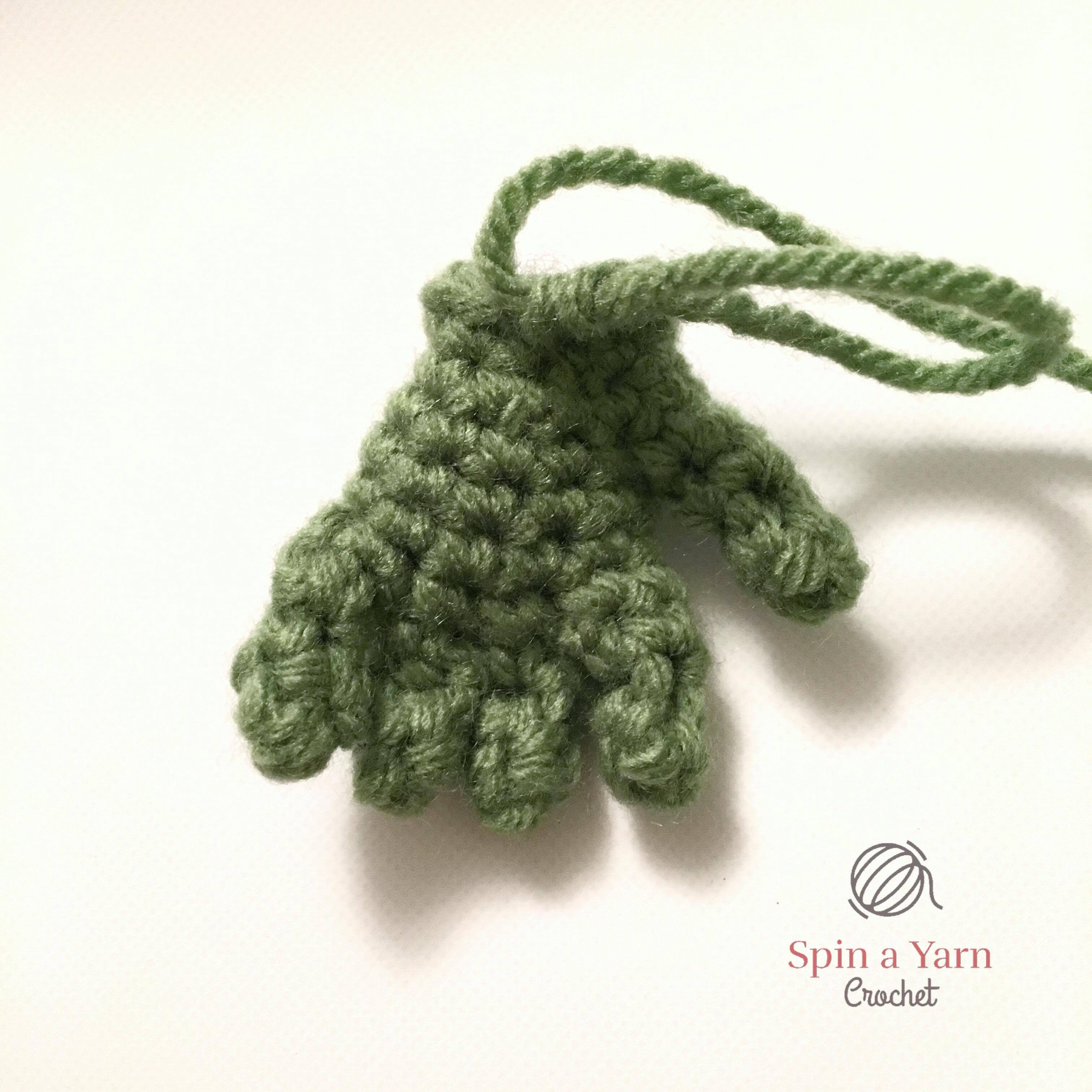 Tie off. You should now have the original tail from your MR sticking out the opening of your finger. Now you can pull it tightly to securely close the starting MR. Trim the MR tail so it’s not in your way from here on out. If you want, you can weave in all the tails from the last stitch on each finger now as well. I chose to leave these until later and simply poked them back into the hand once it was completed.