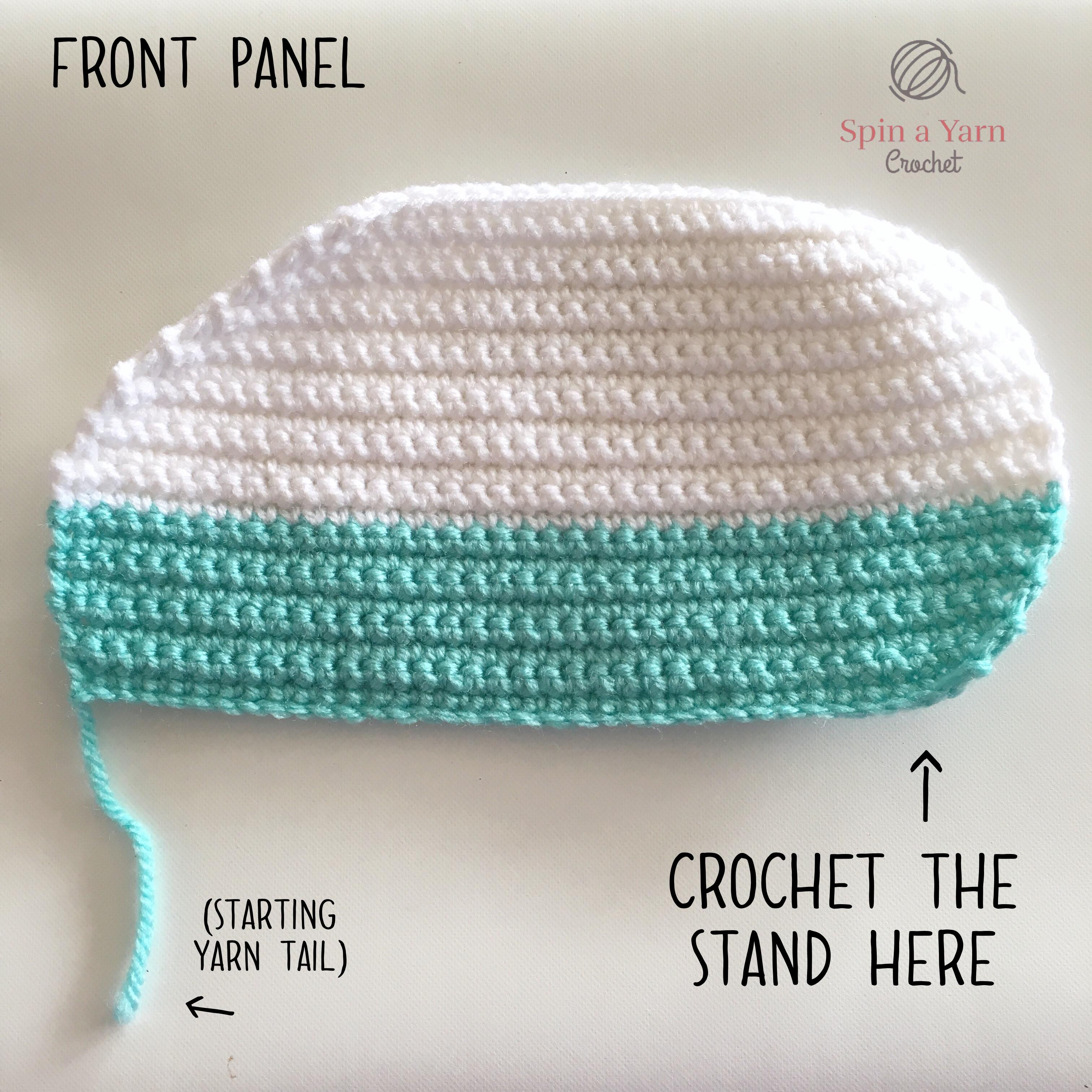 Repeat rows 1-23 (plus rows 1-3 for the stand) for the back panel, but make sure any yarn ends on the back panel are facing the opposite side than they were for the first panel. Since the panels are not perfectly symmetrical, you will need to do this to ensure all the yarn tails are facing the inside when we match up the panels later (so, the “right side” of the front panel becomes the “wrong side” for the back panel and vice versa).
