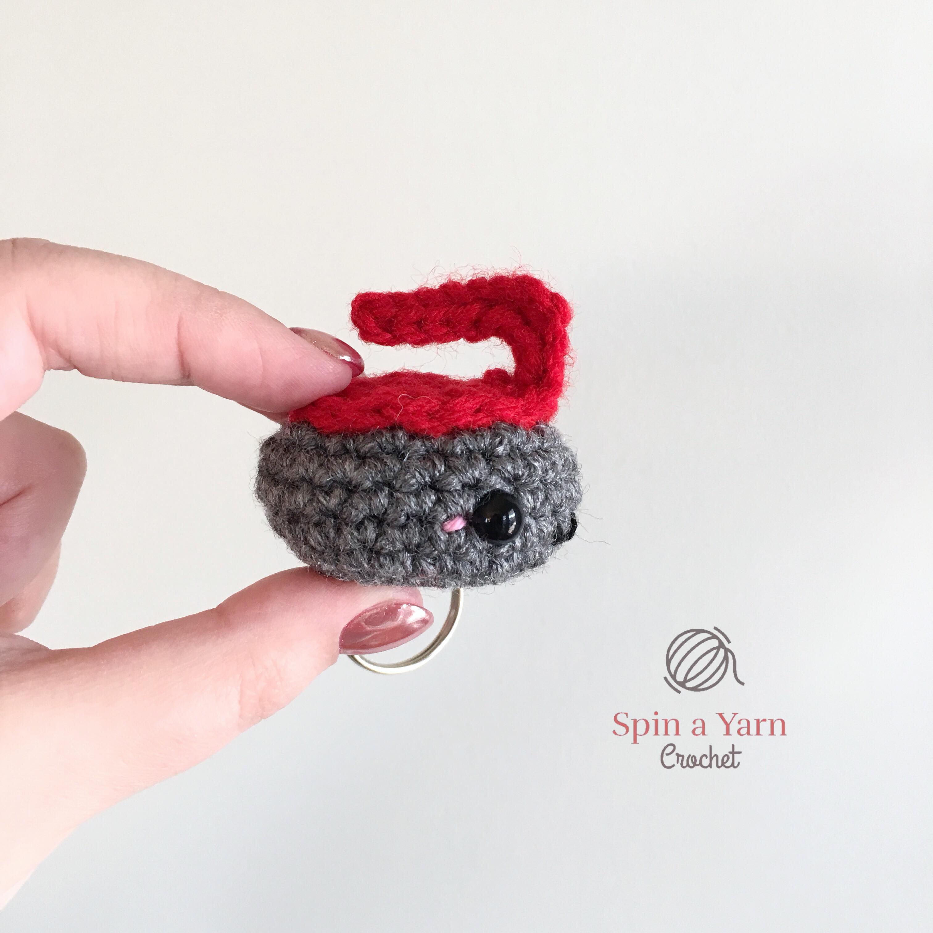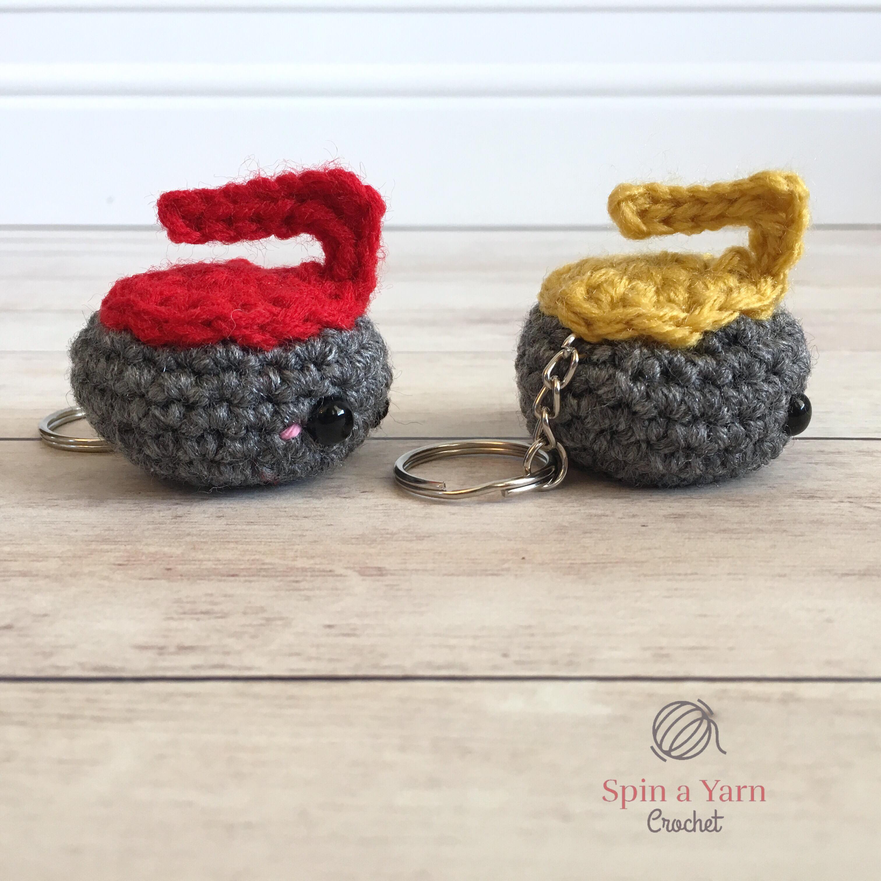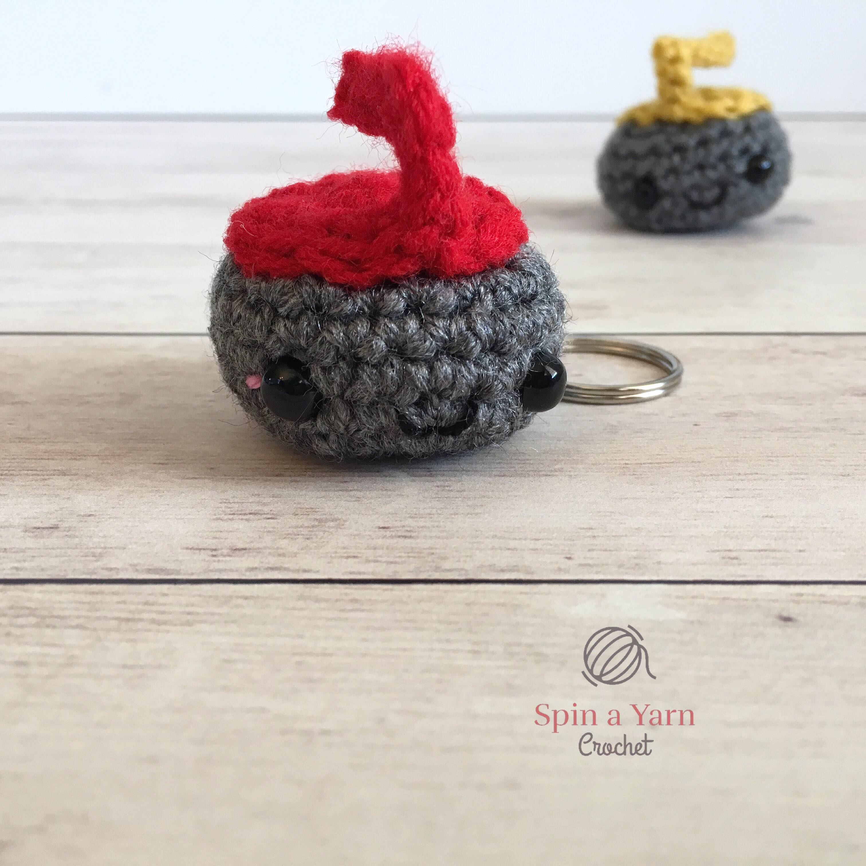 This is a really quick and fun project. They are super tiny and make perfect keychains or bag charms. I’m going to add one to my keychain and give the other one to my fiancé for him to put on his keys. He also suggested that I attach them together with a length of yarn (or chain sts more likely) so he can hang them over the rearview mirror in his car, fuzzy dice style, which is probably the most hilarious and very best use for crocheted curling stones that I’ve ever heard of. Curling fans for life!