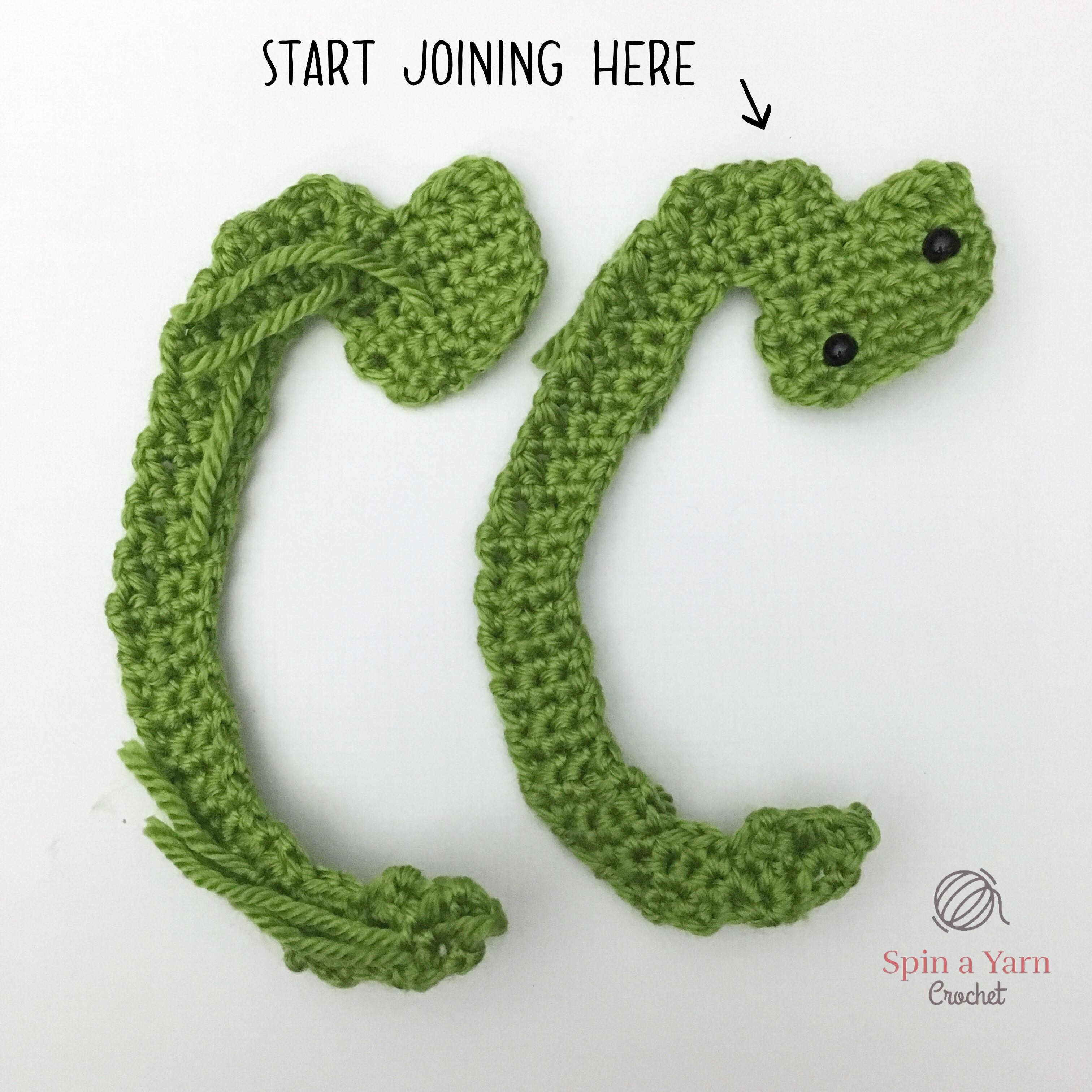 Repeat the above for the second panel of the snake. Insert 6mm eyes onto the front panel. Feel free to make a little tongue in pink or red yarn by making 3 chain sts and tying off. Stitch the tongue to the inside of the top panel.