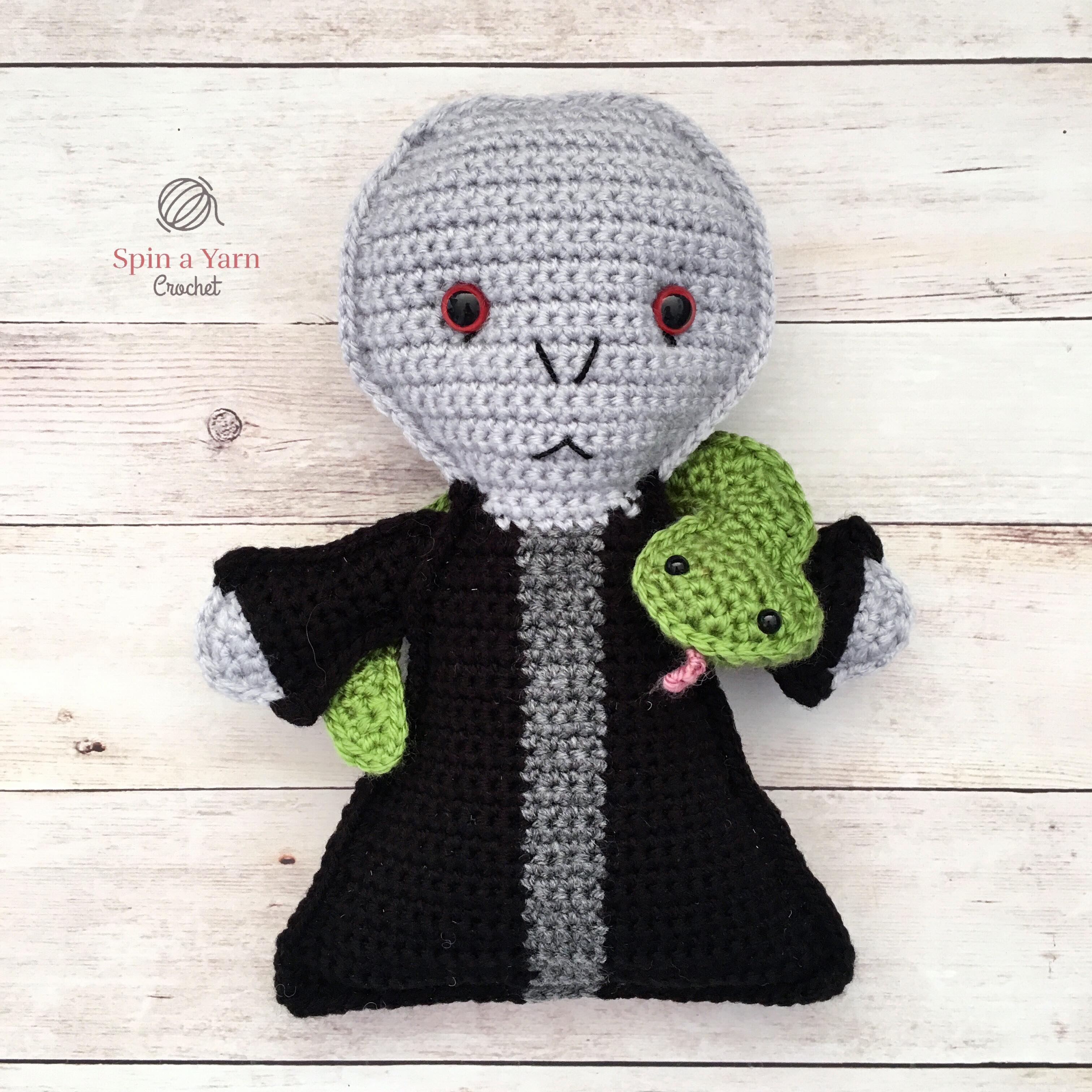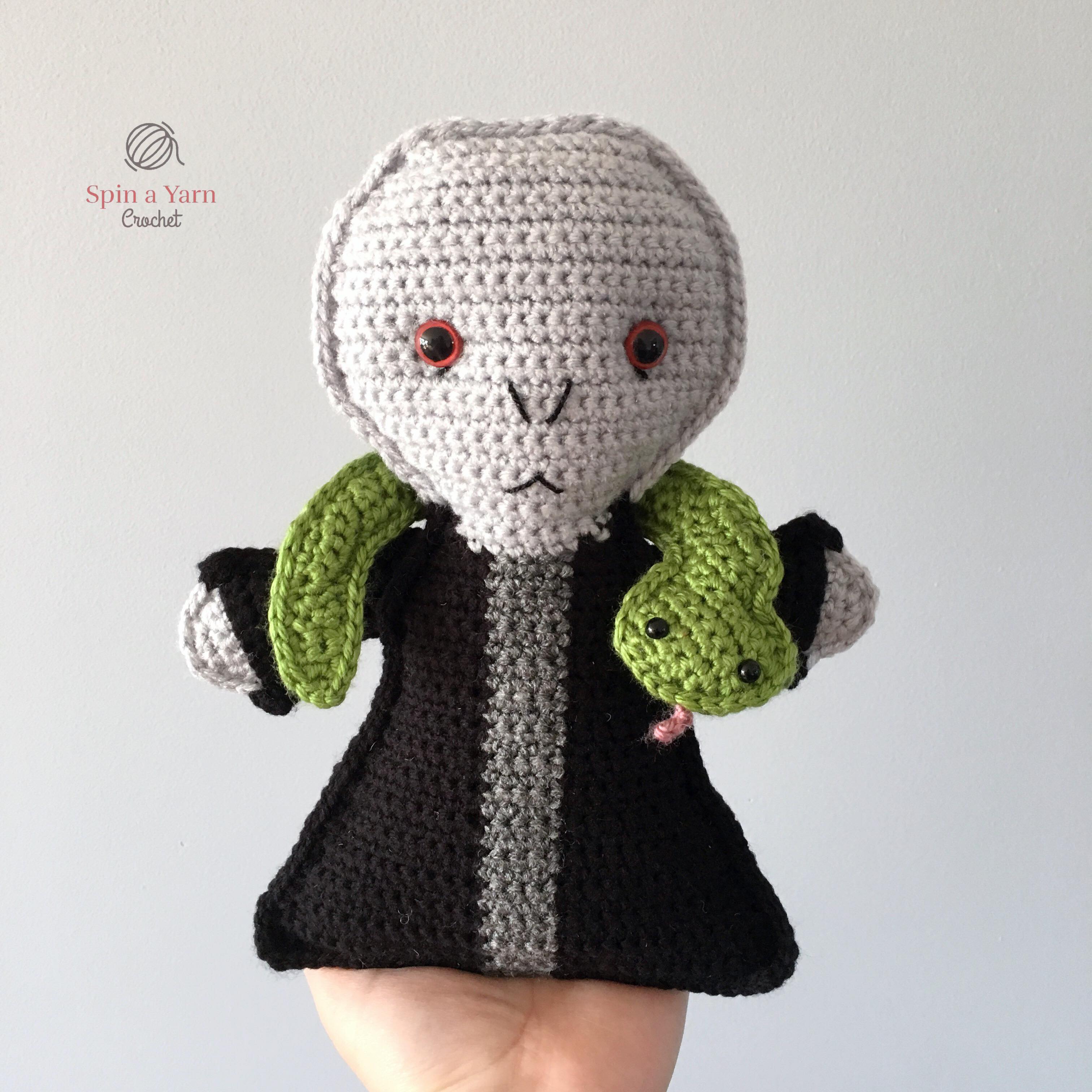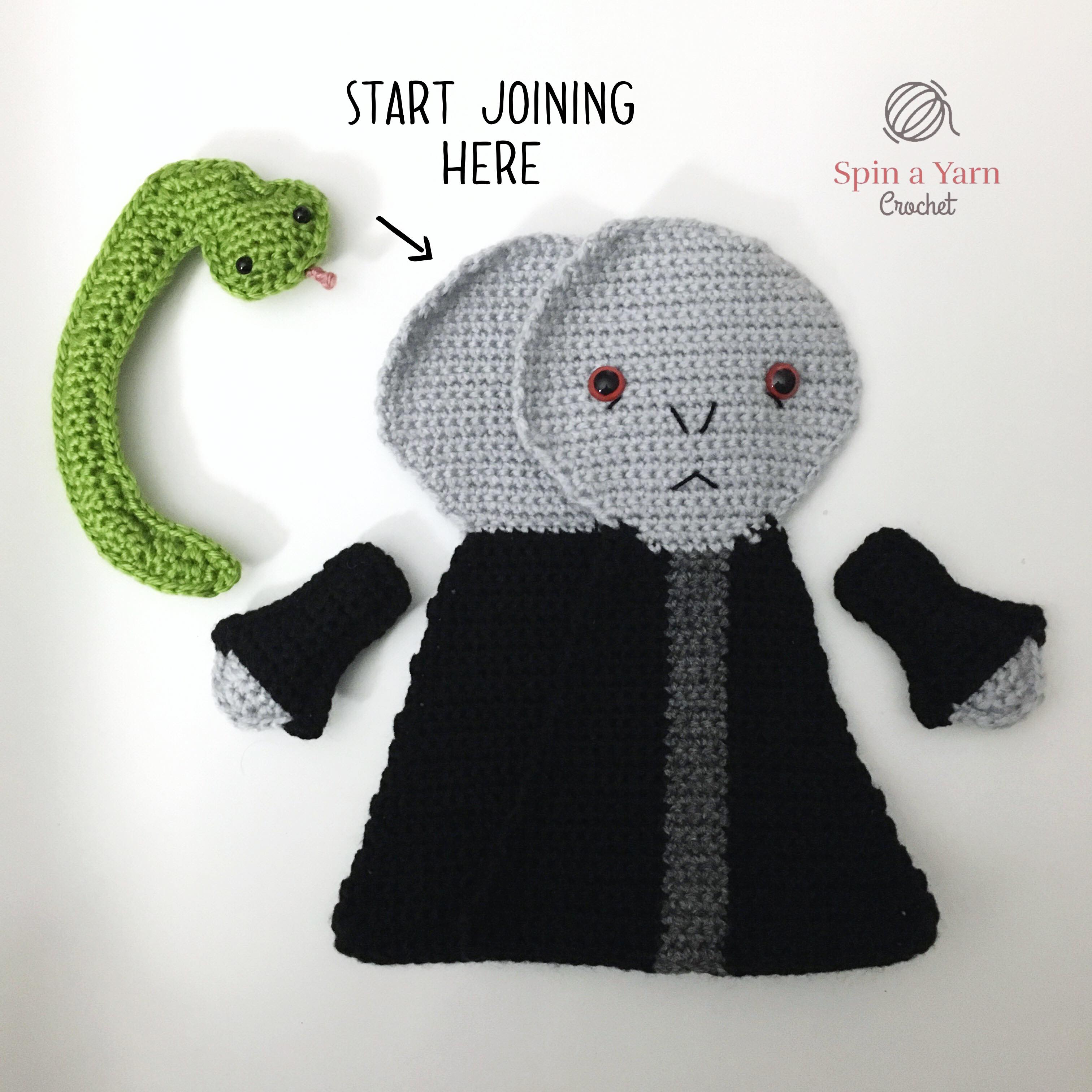 When you are satisfied with the stuffing, close with a slst to first st. Tie off. With your tapestry needle, poke the yarn tail back inside the piece. Finish with some needle sculpting for the eyes, place Nagini around his shoulders/arms, and you’re done!