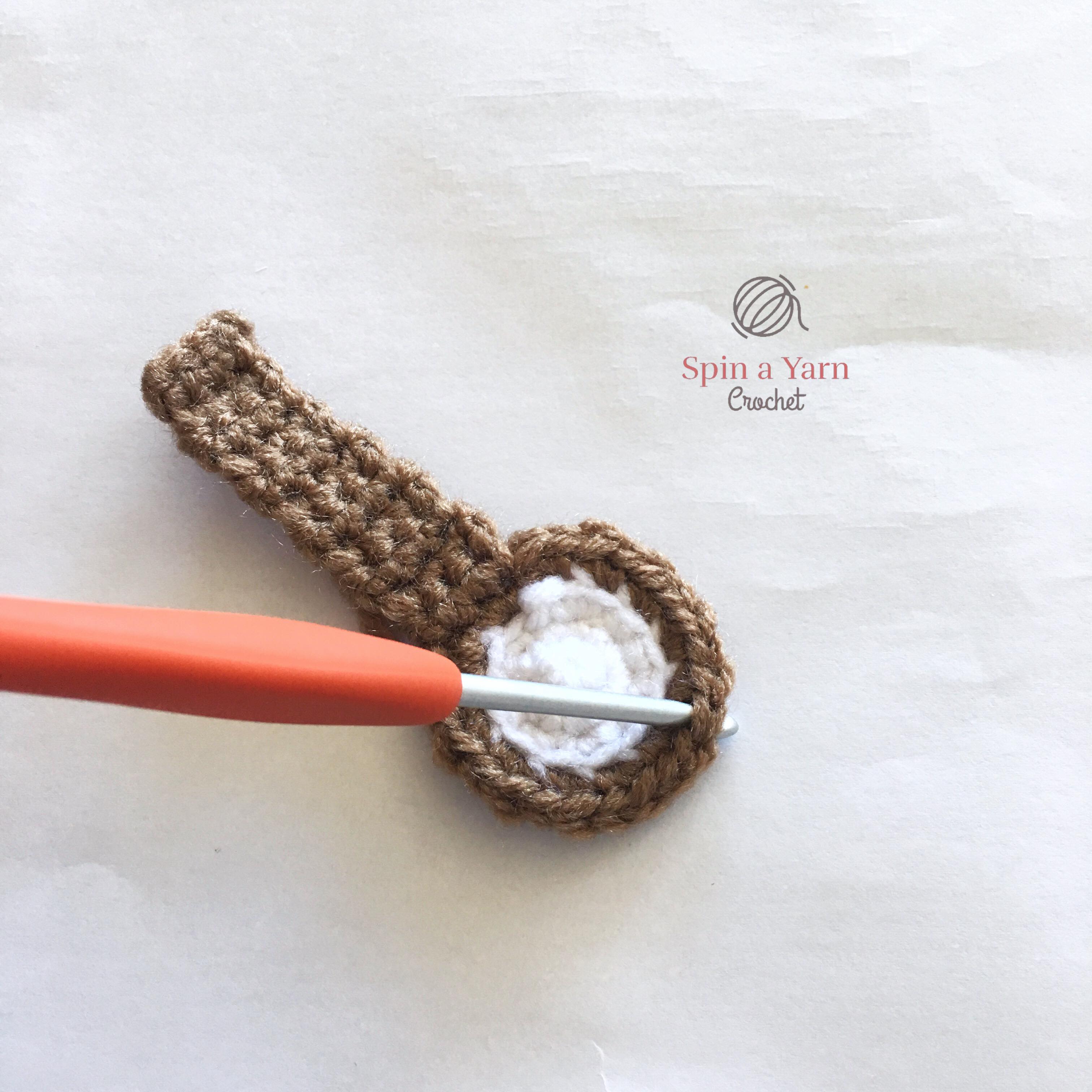Using Light Brown yarn, stitch around the strap starting at the long end, down the strap, around the round eye piece, around the other strap, and back to the beginning. Tie a knot in the yarn tails on the back of the panel to secure.