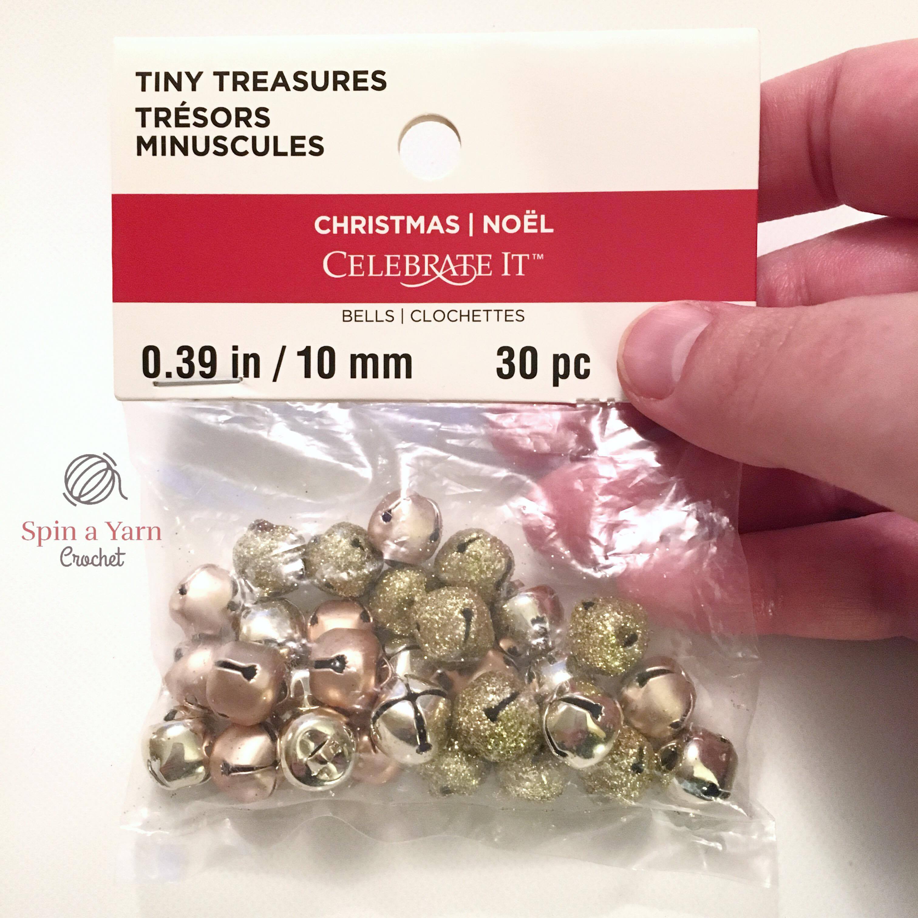My inspiration came when I was browsing the yarn aisles at Michael’s (what else is new) and I came across a display full of sweet little holiday bits and bobs. There were tonnes of all kinds of different buttons, from reindeer to Santa and Mrs. Claus, and snowflakes and gingerbread men and on and on! I saw some little Christmas light buttons and, without having anything specific in mind, I picked them up, as well as a package of gold bells, and bright, colourful beads. When I got home, I realized they would look great on miniature Christmas trees!