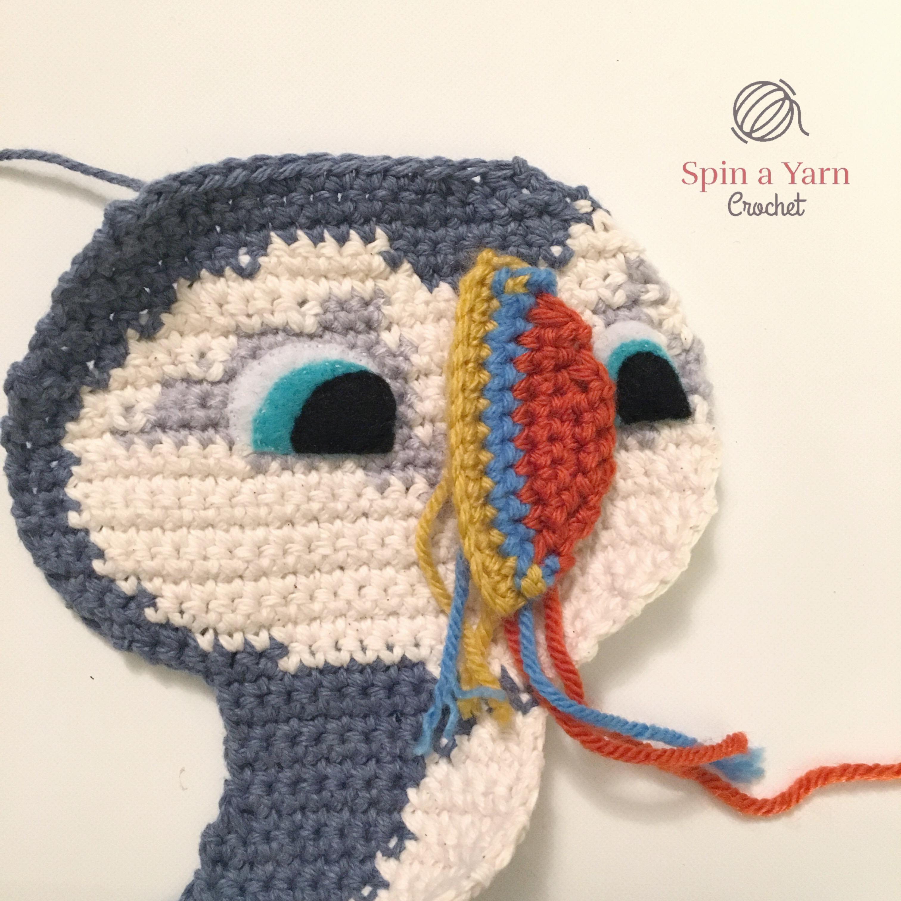 Crochet down the side of the head and body. (Sc 2, ch 1, sc 2) in the tip of Oona’s tail.