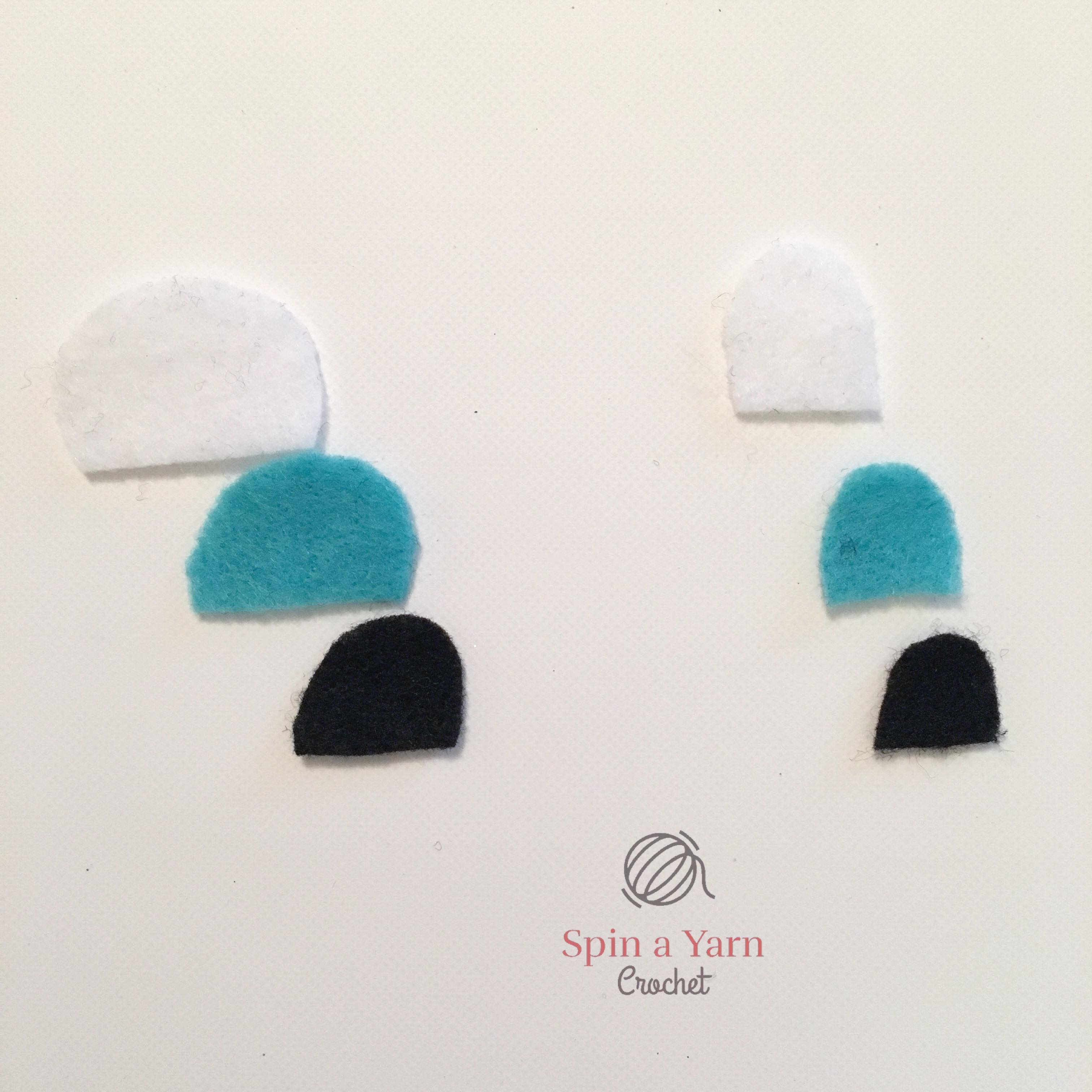 So, first thing’s first, for the left eye, cut the white felt piece in a dome shape. I did this by tracing a circle on the felt and cutting it in half. Keep trimming it down until it fits comfortably within the light grey eye-patch area on the front panel. Next, grab your blue felt and trace the exact same shape as the white piece. Trim it on the left side to be slightly smaller so that the white piece underneath is showing. Finally, repeat with the black felt.