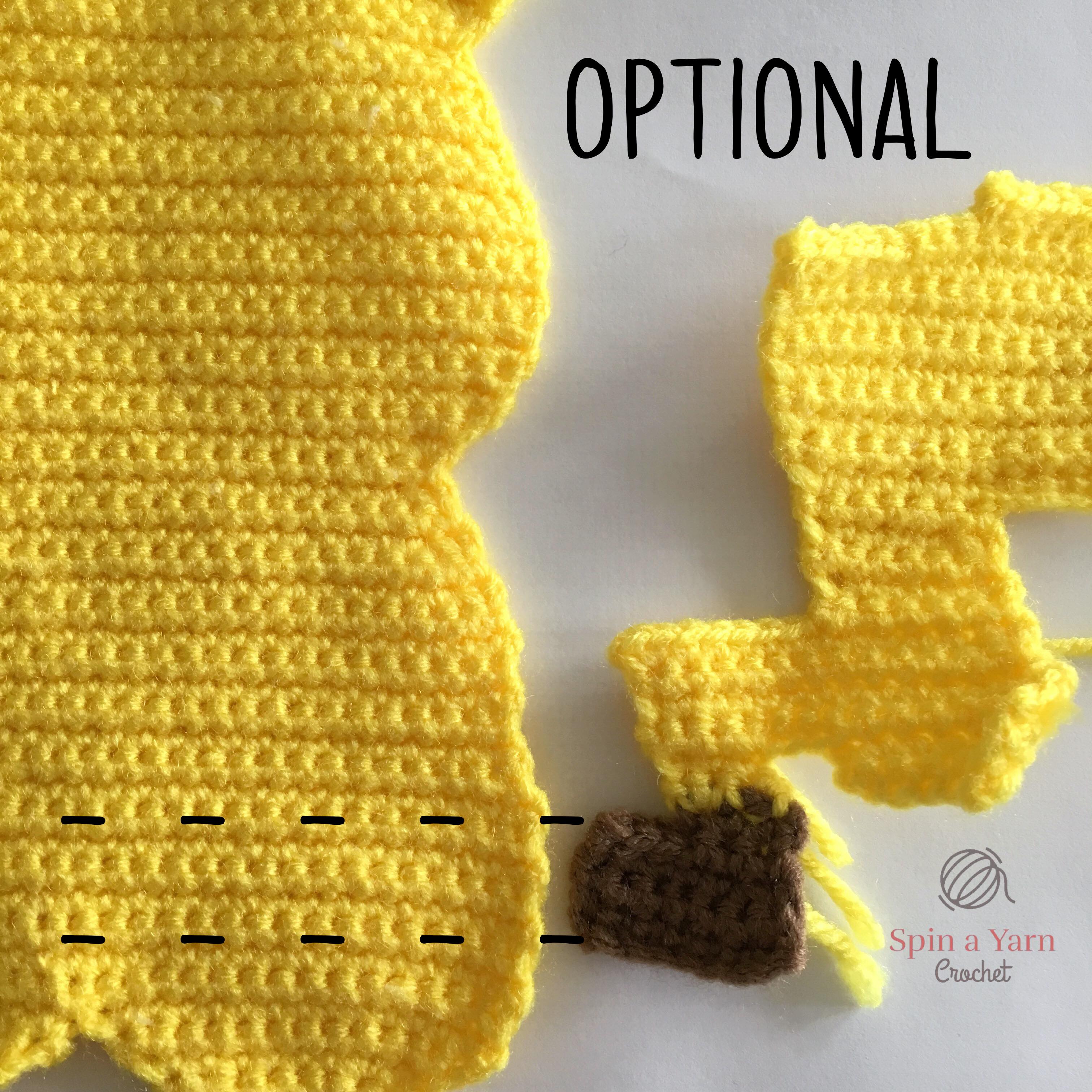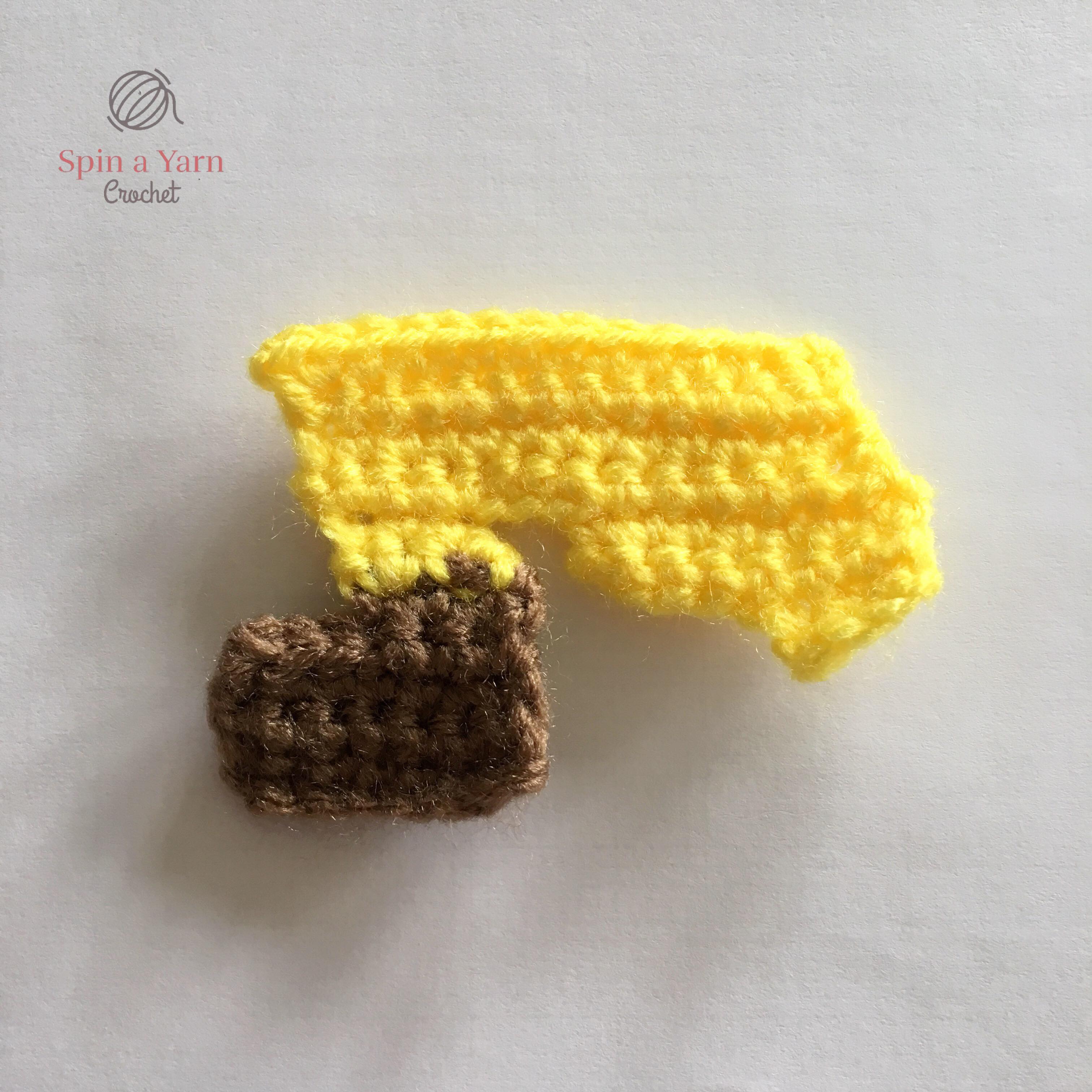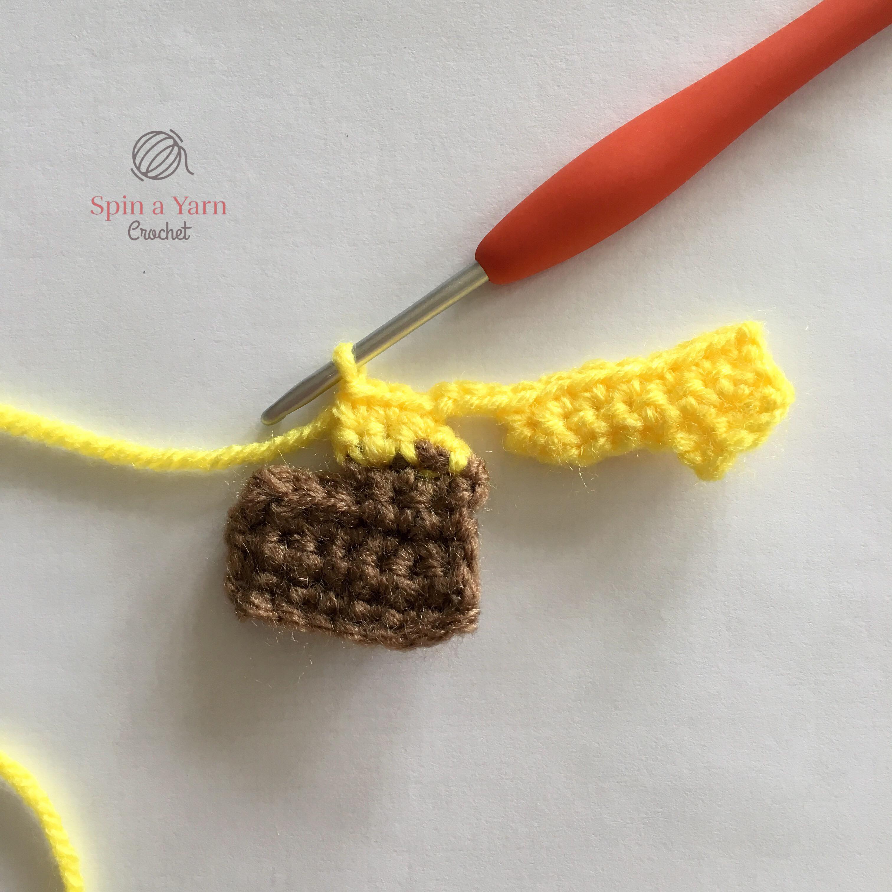 Tie off. Repeat for the back panel of the tail. Place both panels together and, starting in the top left corner, starting joining the panels together by crocheting around the outside in yellow. (Sc, ch 1, sc) in each corner. Switch to brown when you get to the bottom. As you crochet up the opposite side, you will want to stuff after every 4 or 5 stitches. Stop when you get to the top and top up stuffing. Be sure to crochet loosely across the top of the tail to get a smooth line. Continue to top up stuffing as you go. Slst to beginning st and tie off. Weave tail inside.