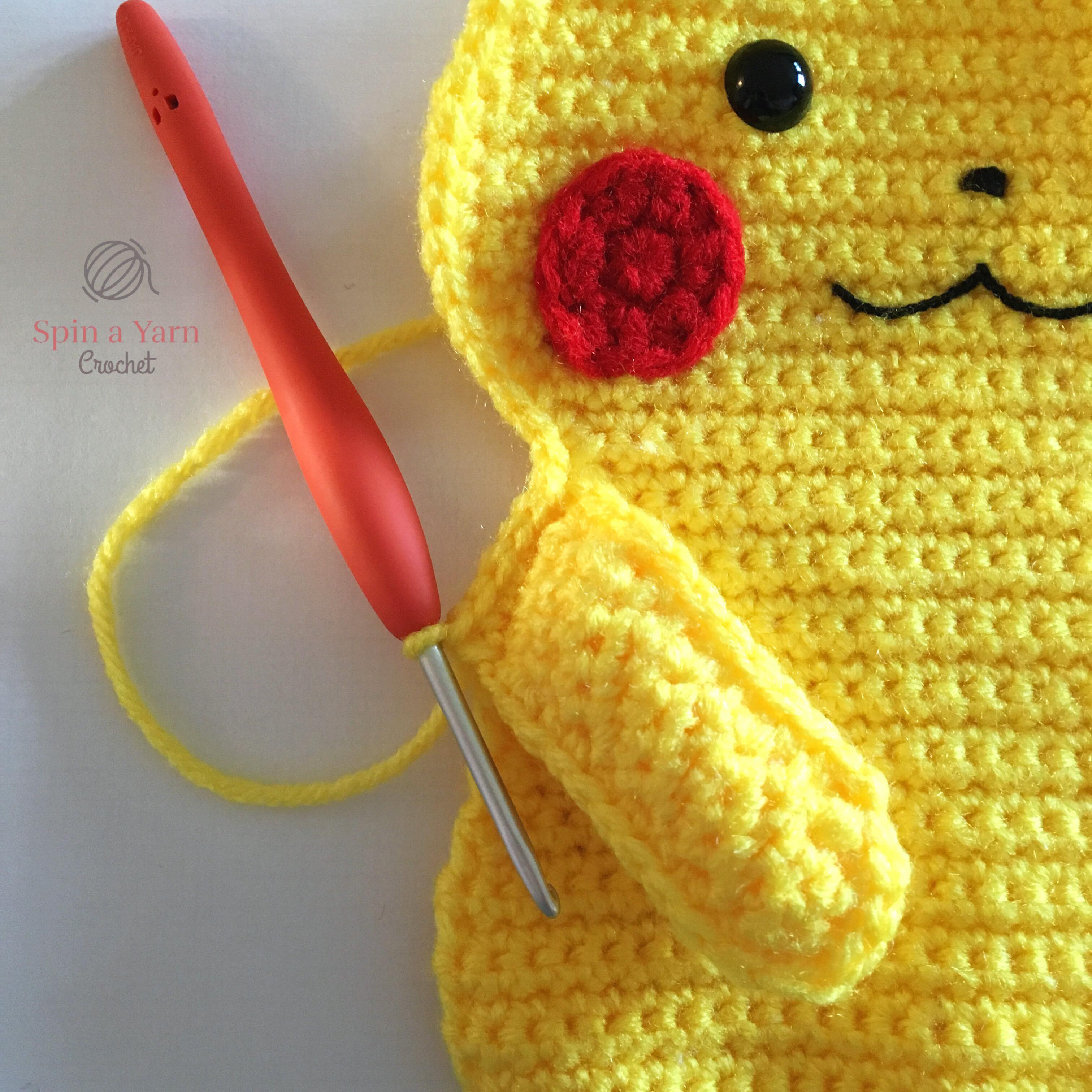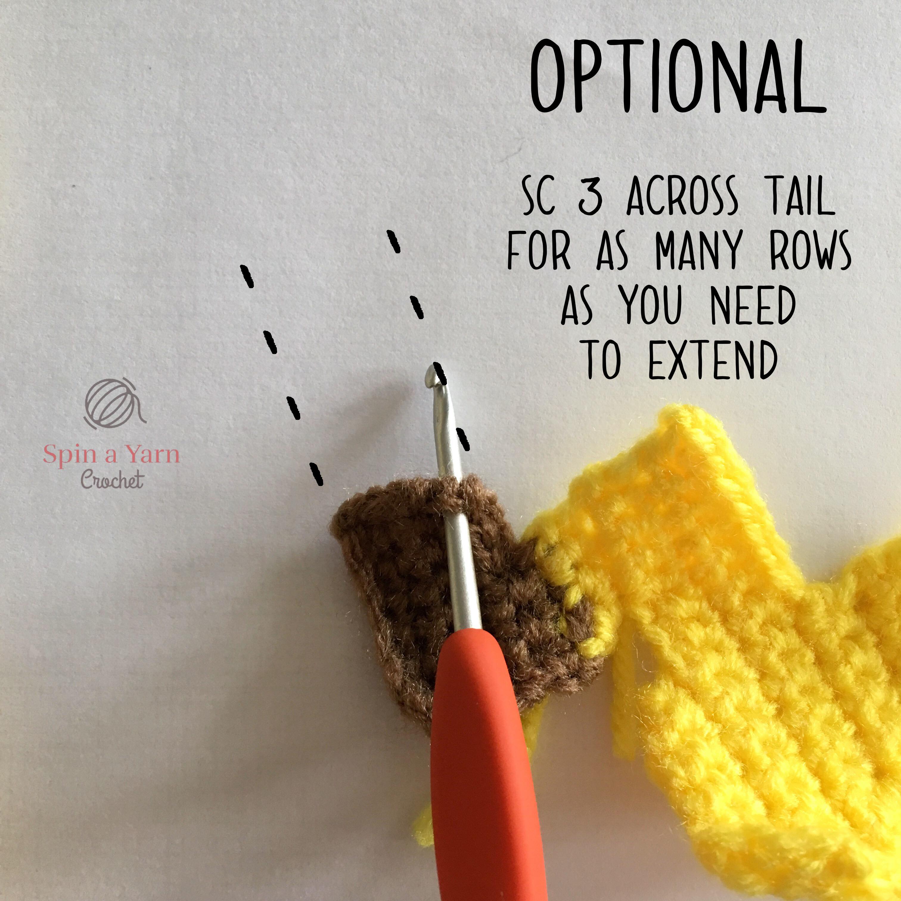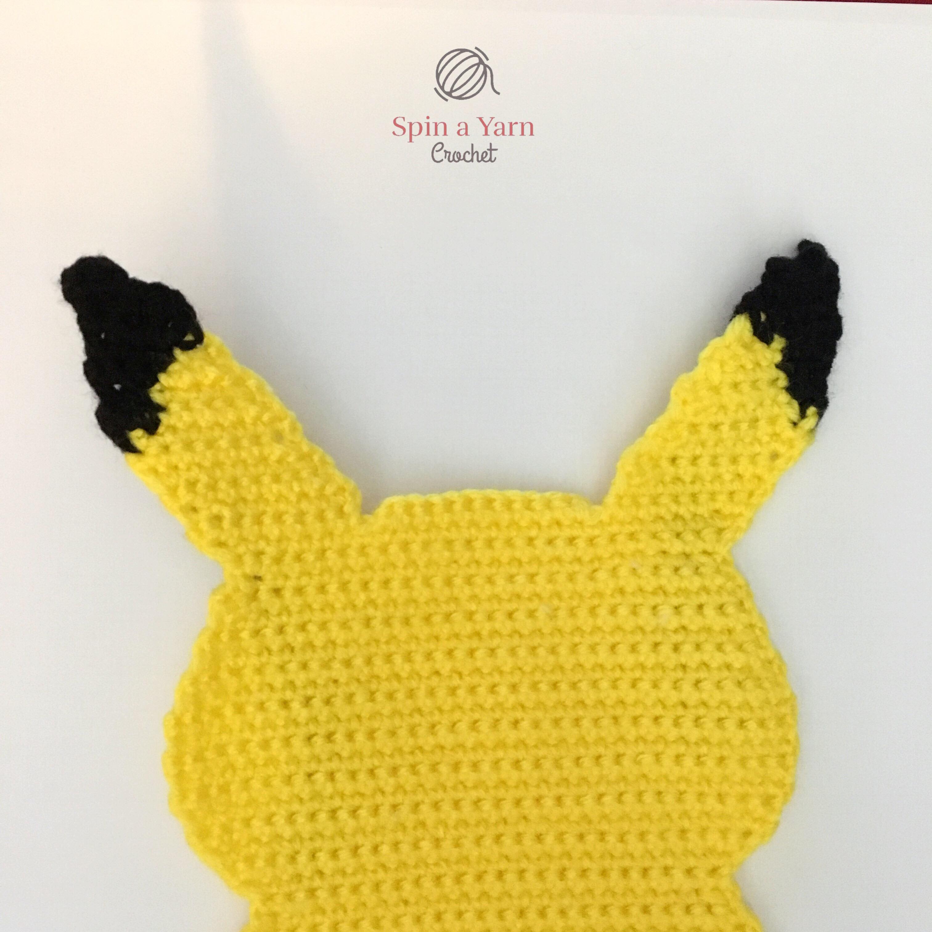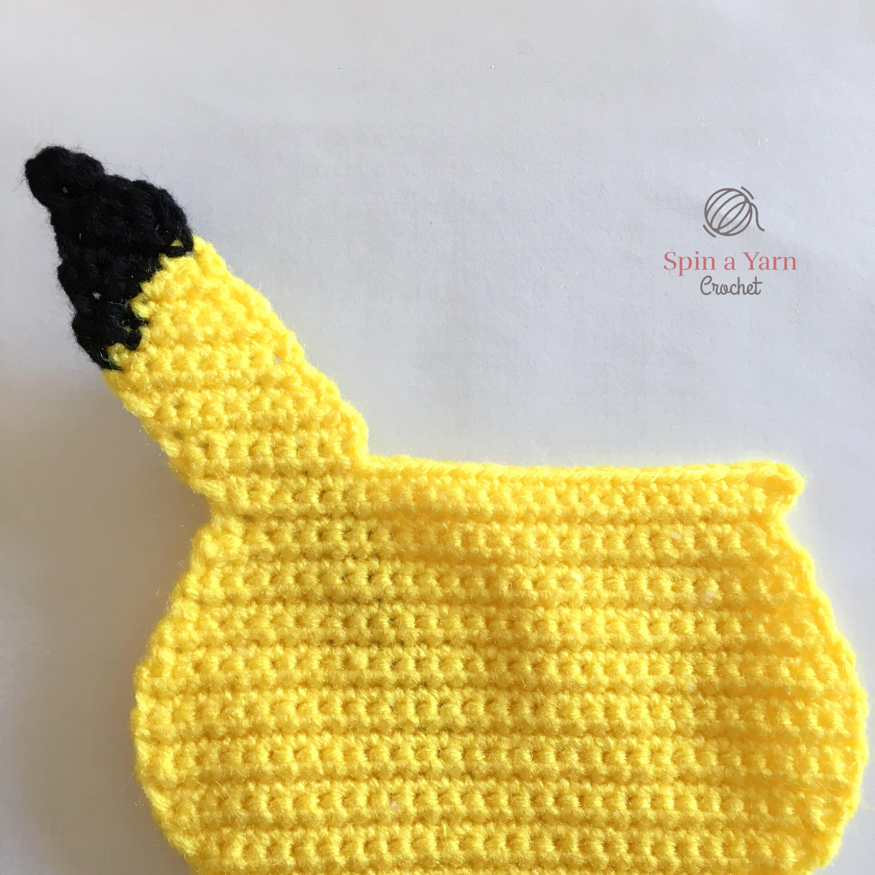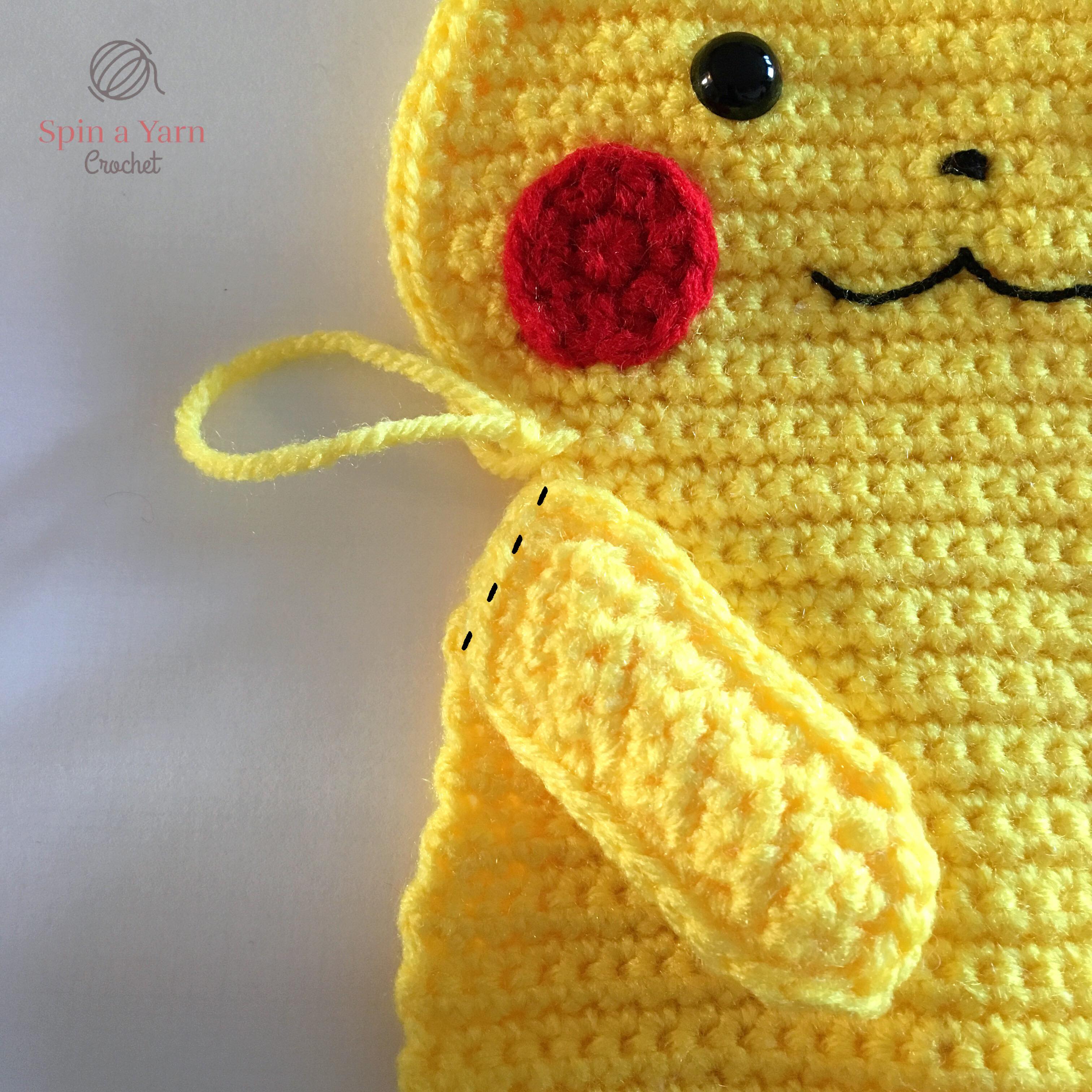 When we get to assembly, the tail will be attached by stitching it to the side of the body. However, if you prefer to have the tail attached to the back of the body, you have 2 options: (1) attach the tail as is to the middle of the back panel at the end of assembly. If you go with this option, you will not be able to see the full tail when looking at Pikachu from the front. The other option is: (2) extend the bottom of the tail by crocheting several rows until it reaches the middle of the back panel.