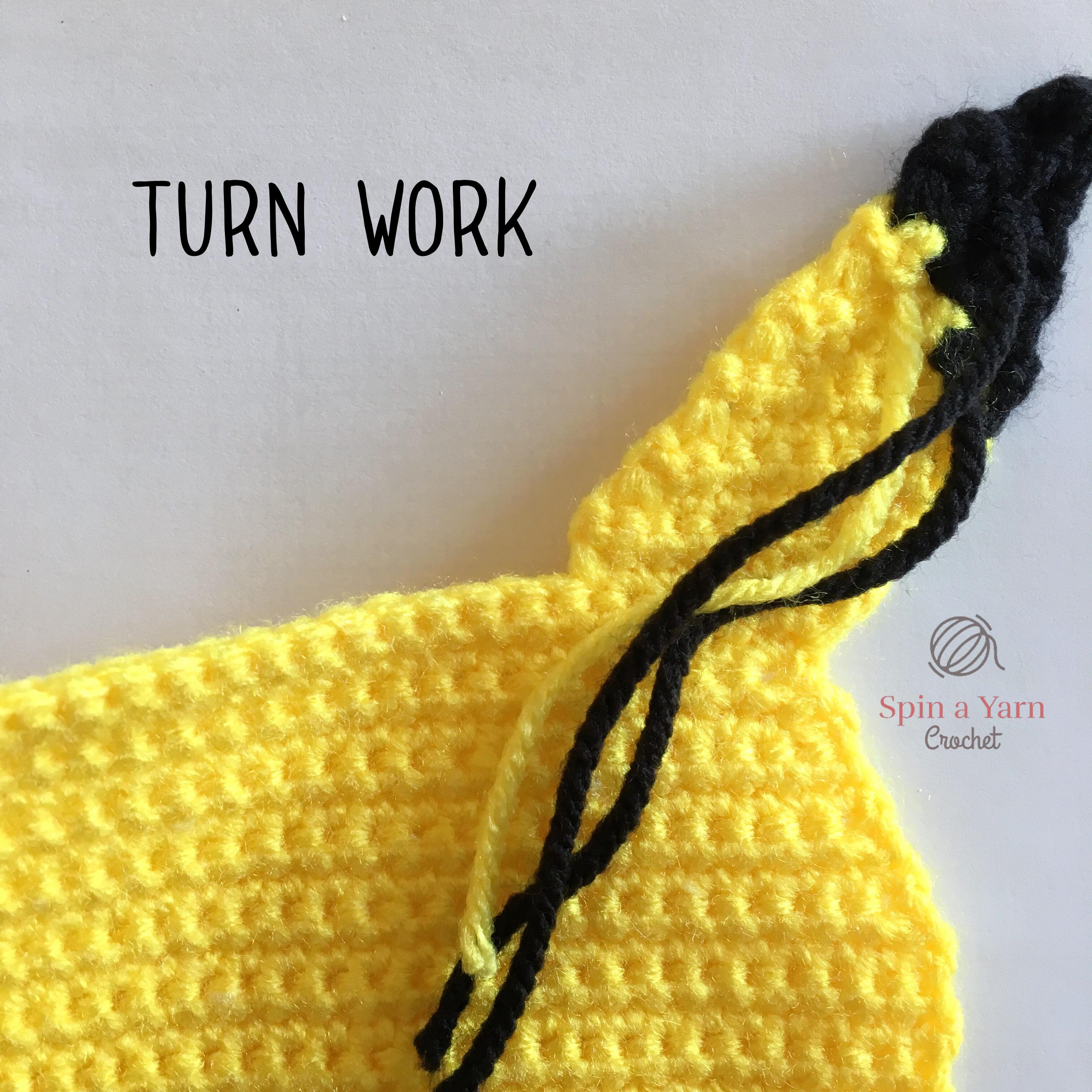 Since the whole pattern is worked in sc stitches, I have omitted the usual “sc” in front of the stitch counts in any rows with colour-changing and used the associated colour letter instead. For example, “B3, Y1” means to work the next 3 stitches in black and the next stitch in yellow. “Ydec” means to work a regular sc decrease in yellow yarn, Binc means to work a regular sc increase in black yarn, and so on.