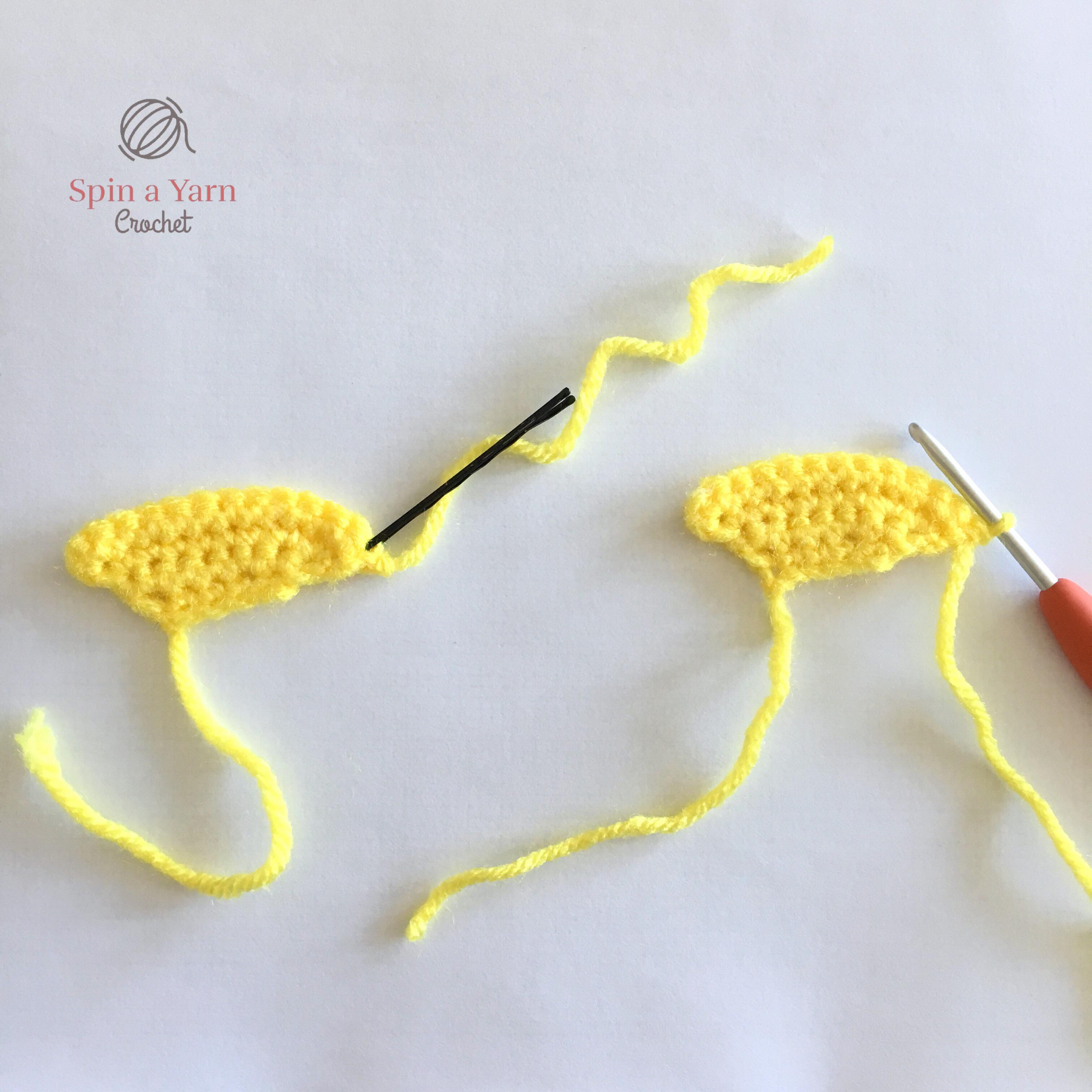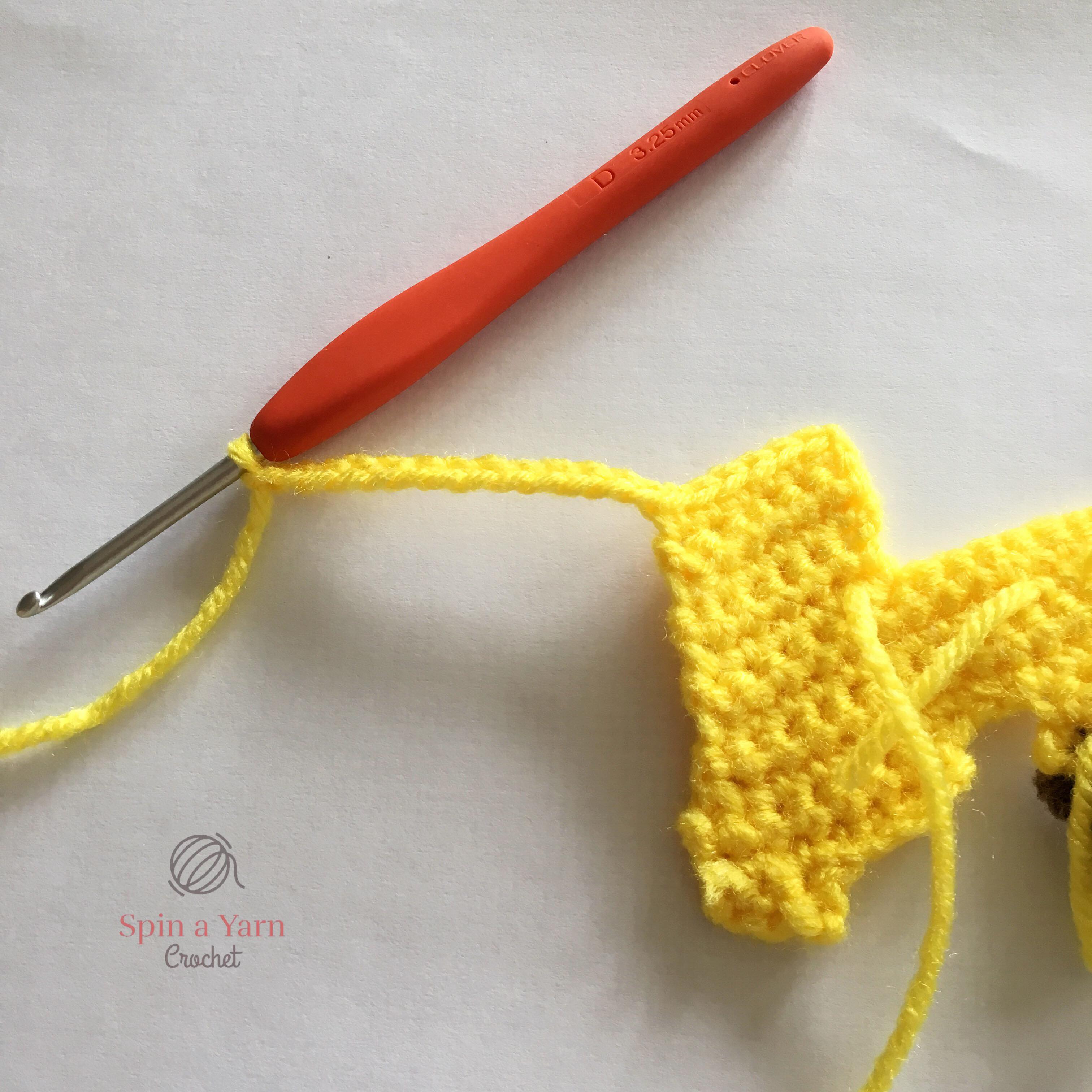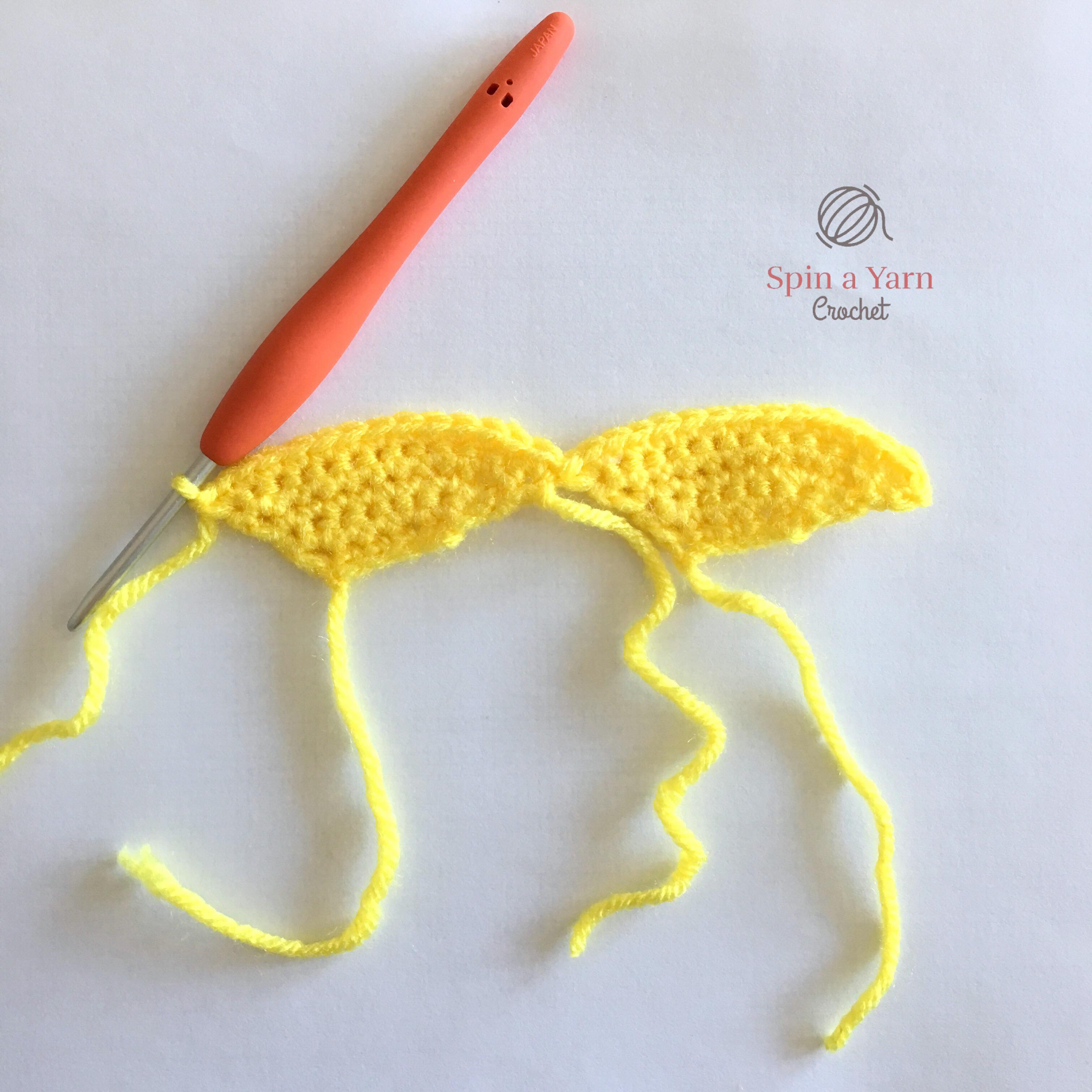 Do not turn work. Skip 1 st and join your yellow yarn in the 2nd st to the left of the head. Now we will start the second ear.