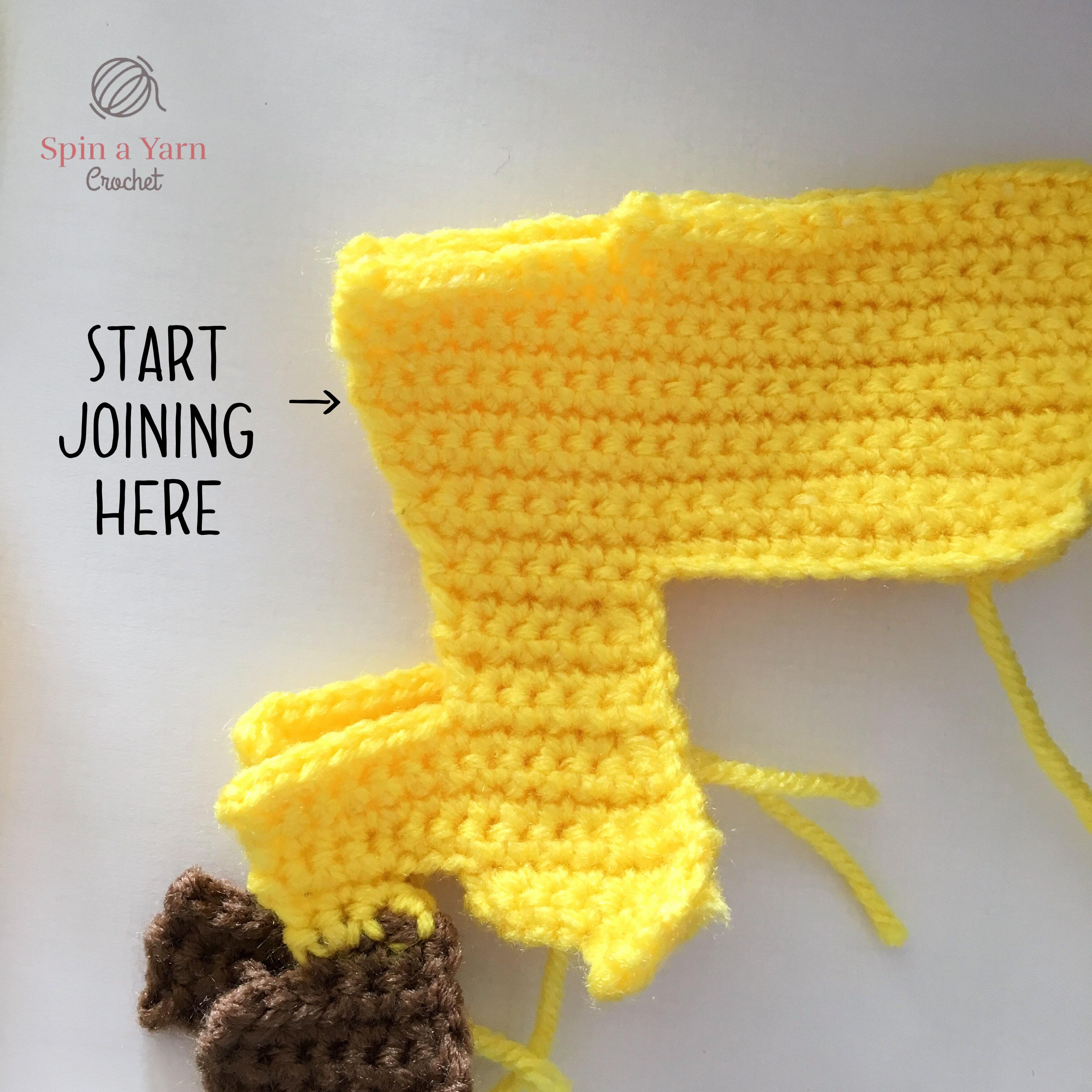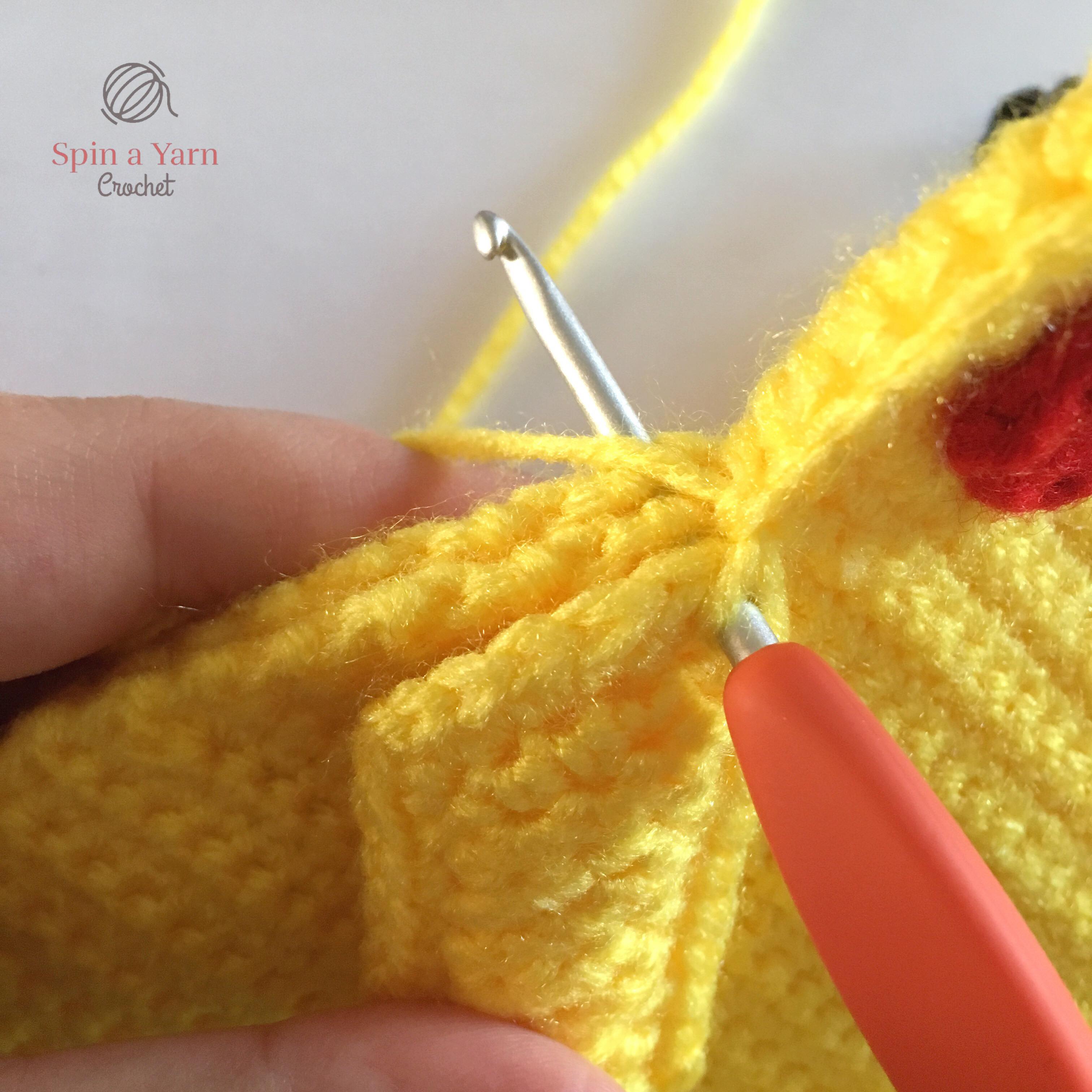 Starting on the left side at the top of the ear, begin attaching the panels together. Insert your hook into both panels, chain 1, and then single crochet around the outside of the panels starting in black. Switch to yellow where appropriate.
