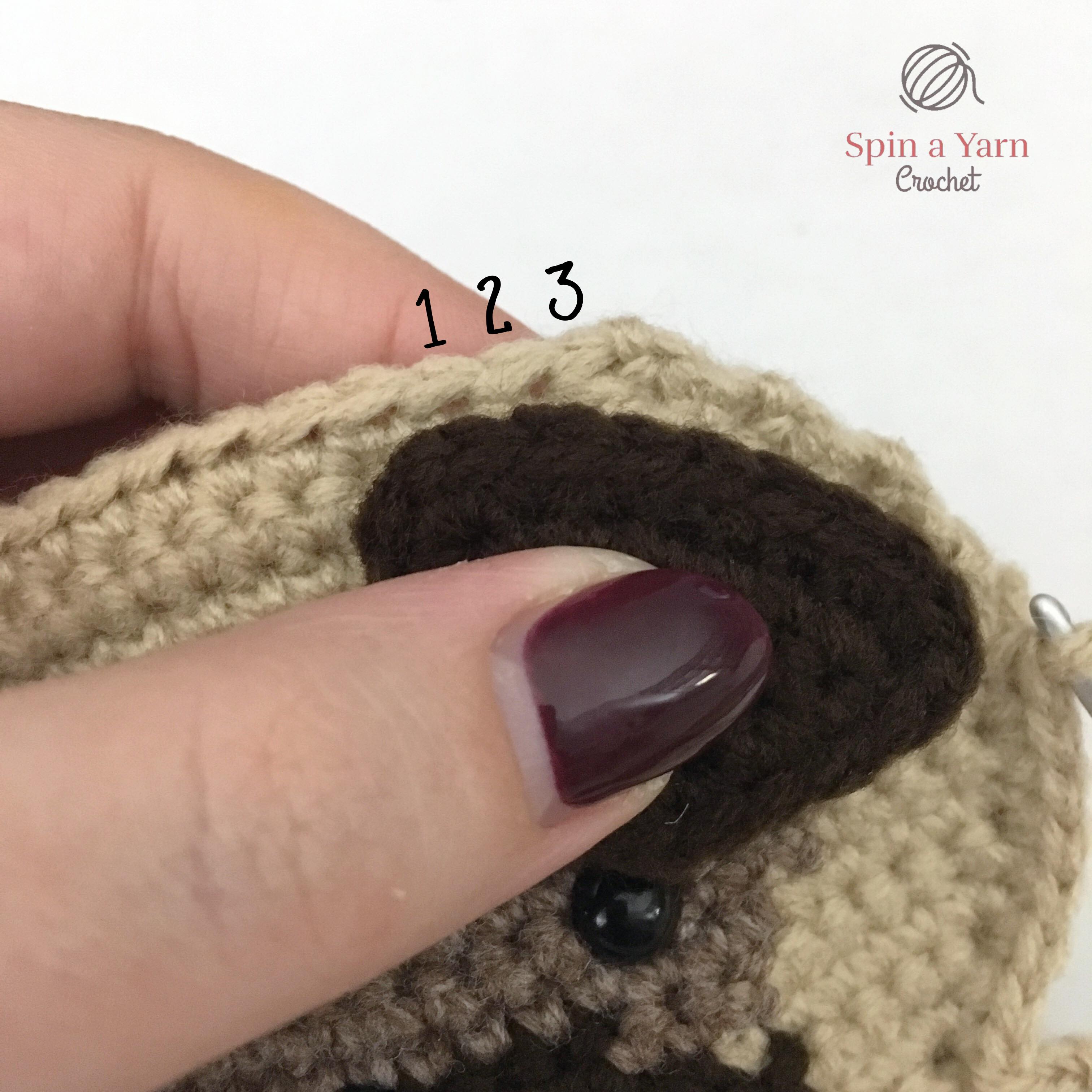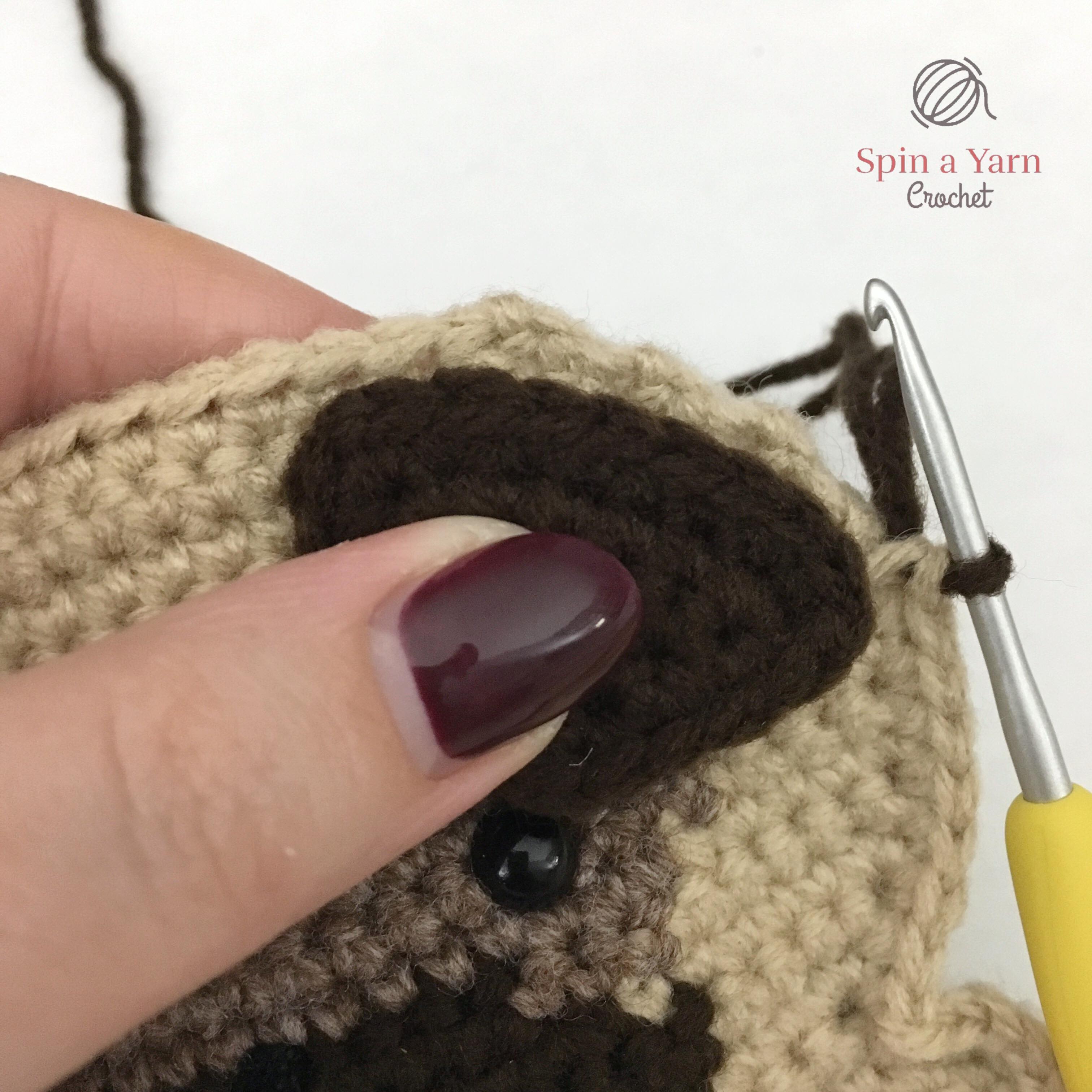 Switch to Dark Brown yarn (when switching colours, insert your hook into the last stitch before the switch with Light Brown but join Dark Brown and finish the stitch with Dark Brown before continuing on with Dark Brown). Attach the ear by crocheting through all three pieces; the ear and both body panels beneath.