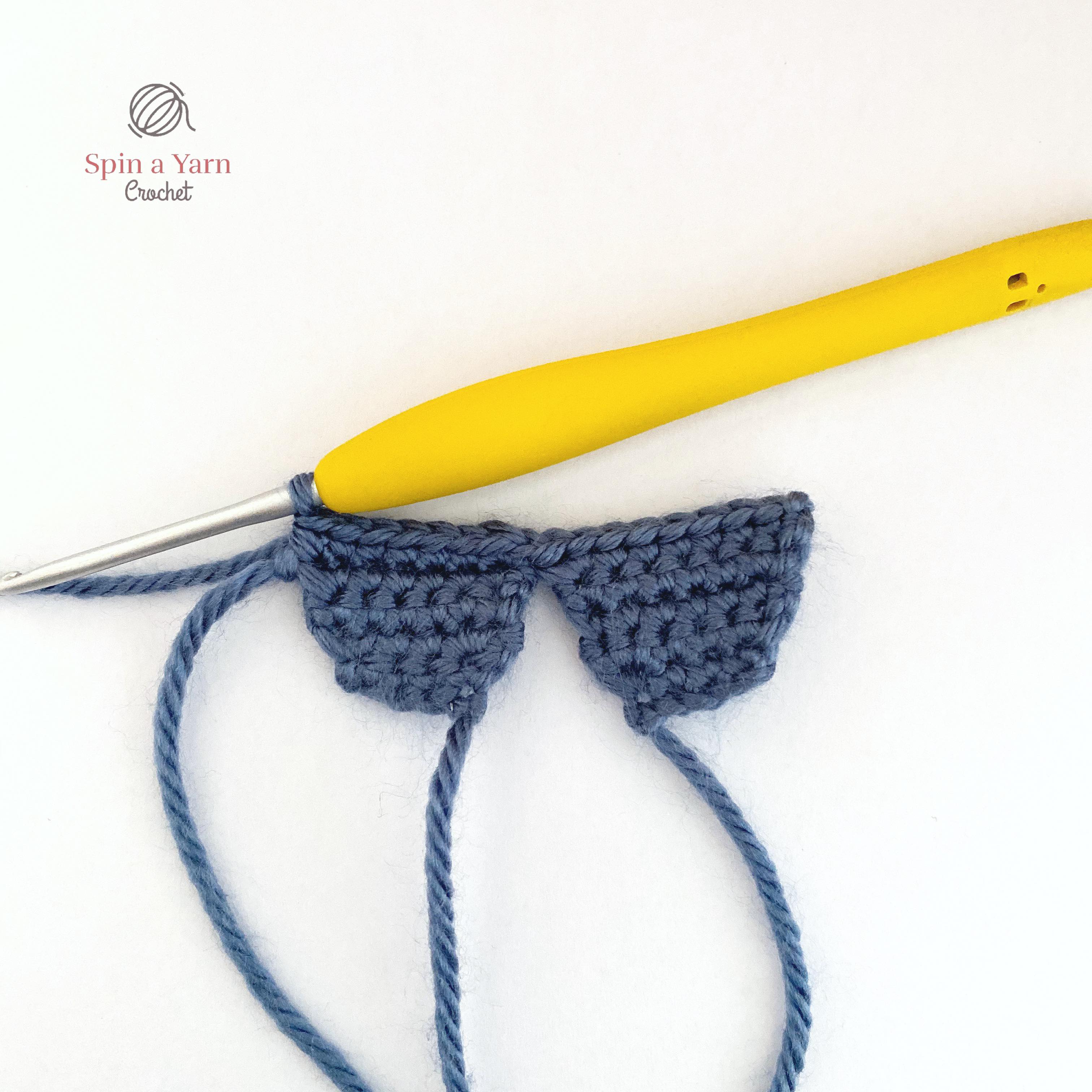 Turn your work. Rejoin your yarn into the space next to the first st of Row 31 on the other side and repeat rows 33-35 for the second ear.
