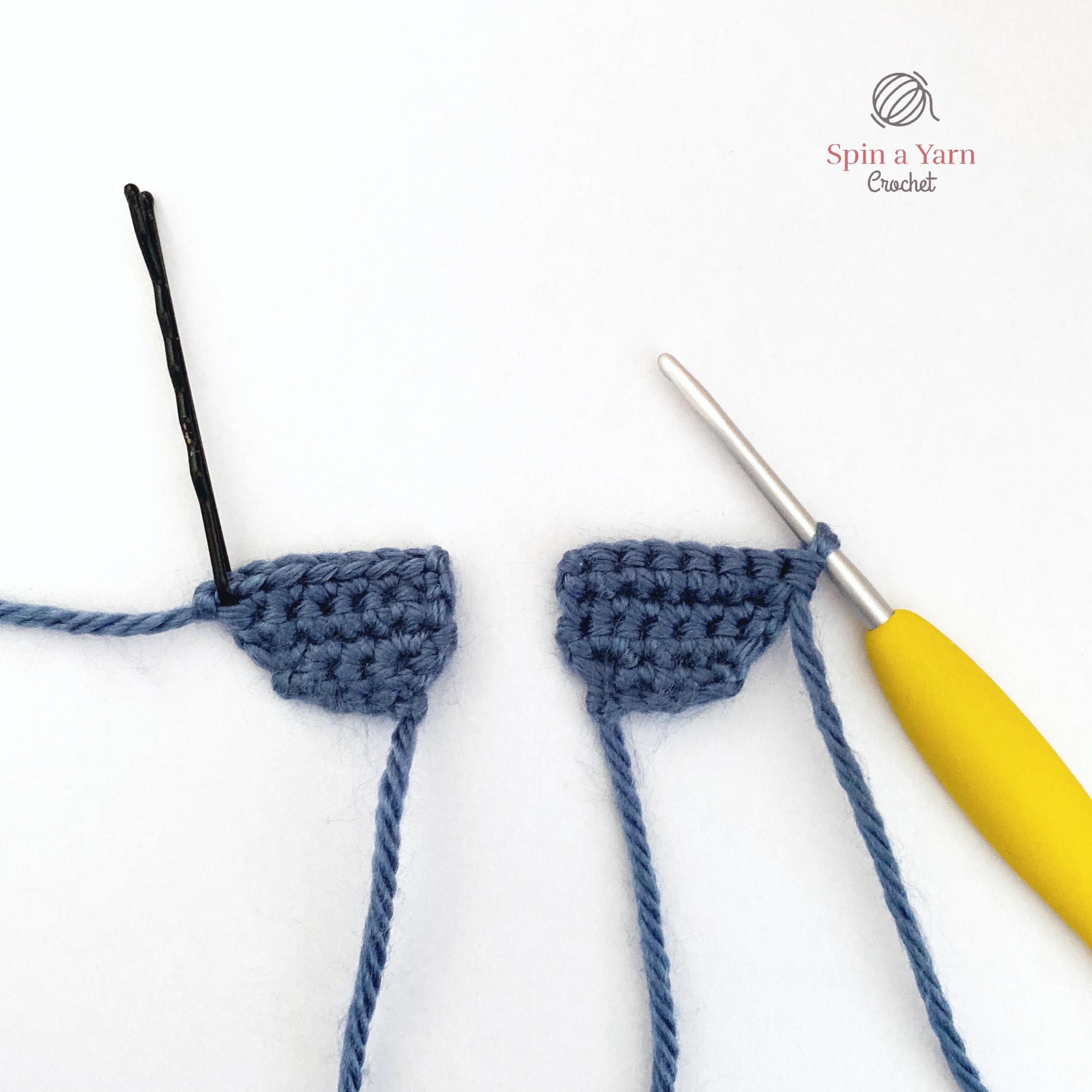 Position the first leg so that the stitch marker from the first leg is facing to the left. On the second leg (the one still on your hook), ch 1 and turn and continue to row 5 where we will crochet across both legs to join them.