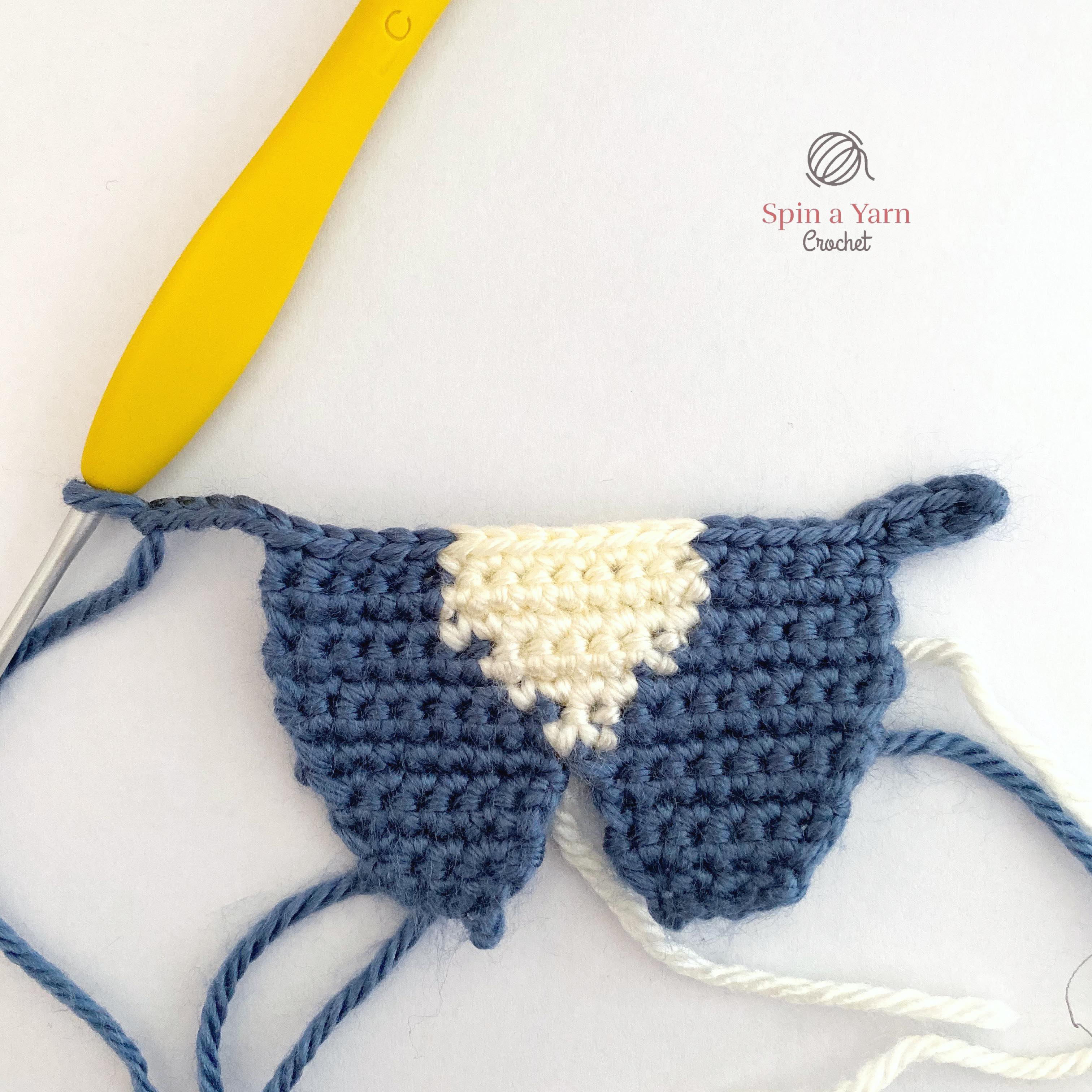 Continue crocheting down the side, up the inside of the first leg and then down the inside of the second leg, then back up the other side.