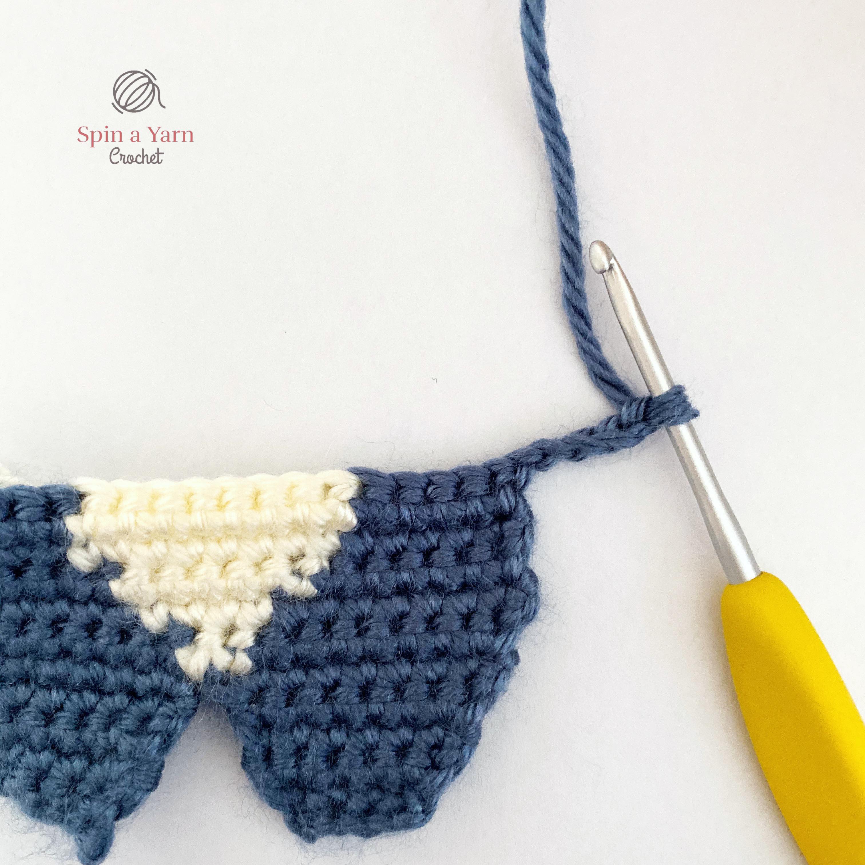 When changing colours, you will insert your hook into the stitch for the last stitch of Colour A and pull up a loop. Then, with Colour B, yarn over and complete the stitch by pulling through both loops with Colour B. Drop your working yarn in Colour A and continue with Colour B. You will pick your Colour A working yarn back up again on the way back in the next row when you need it.