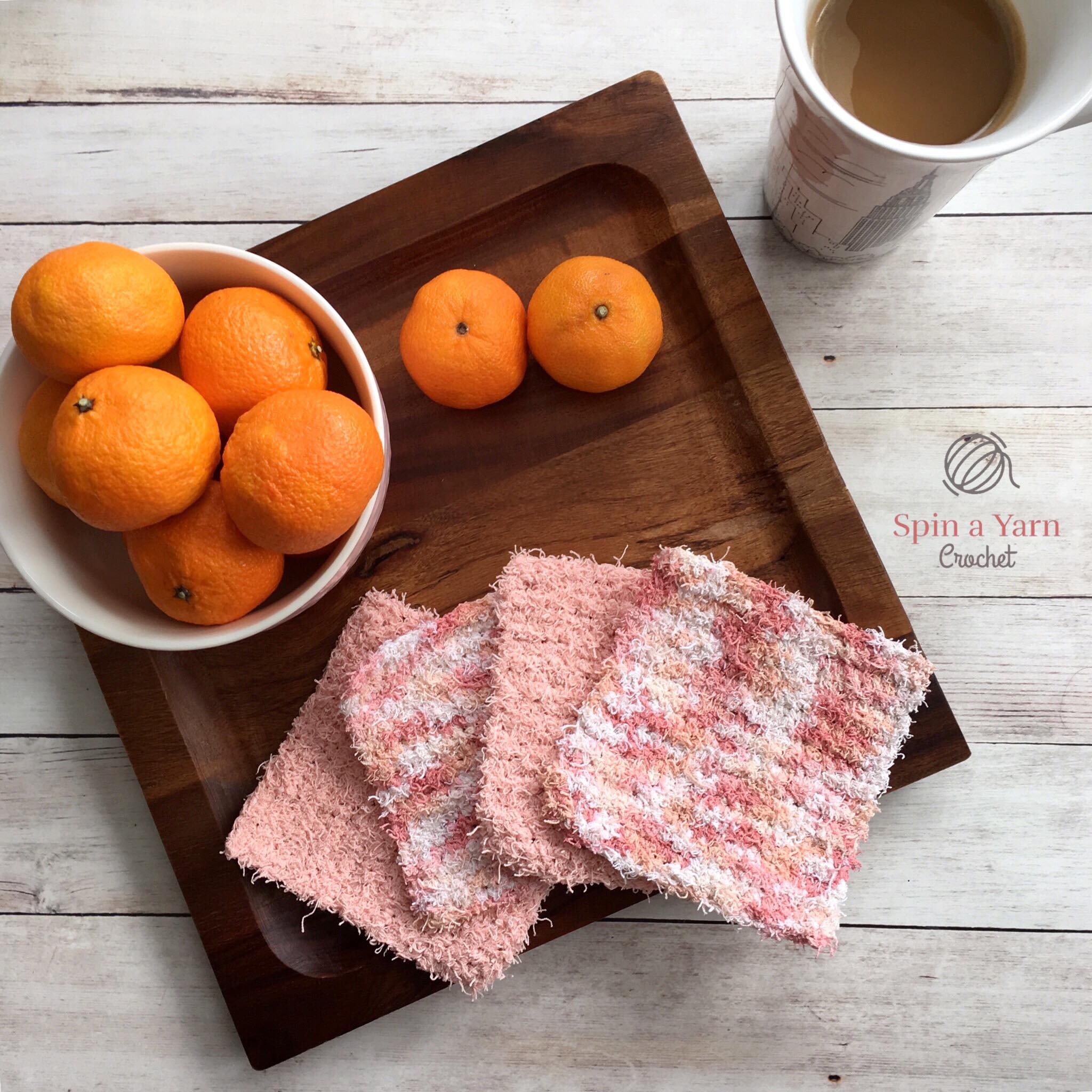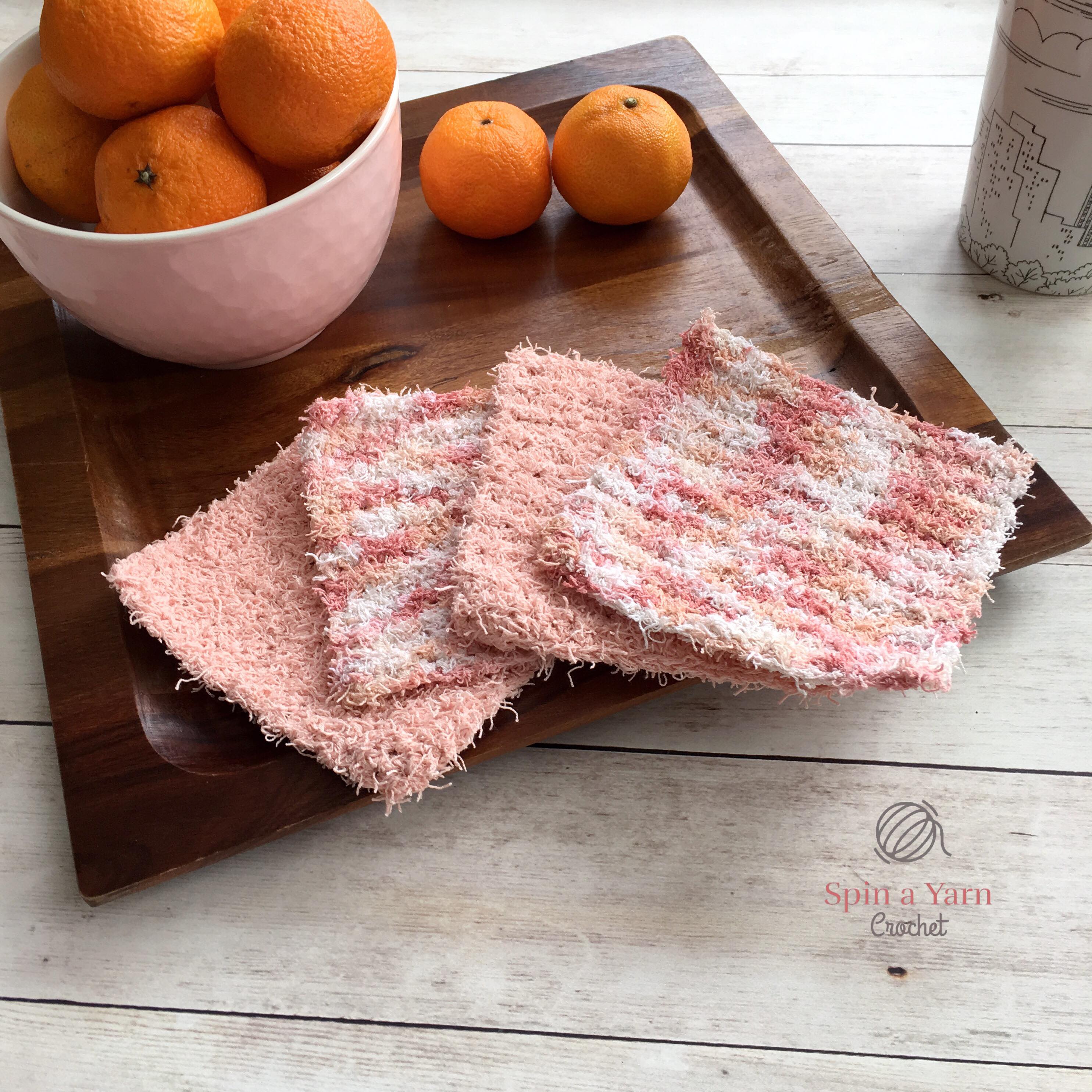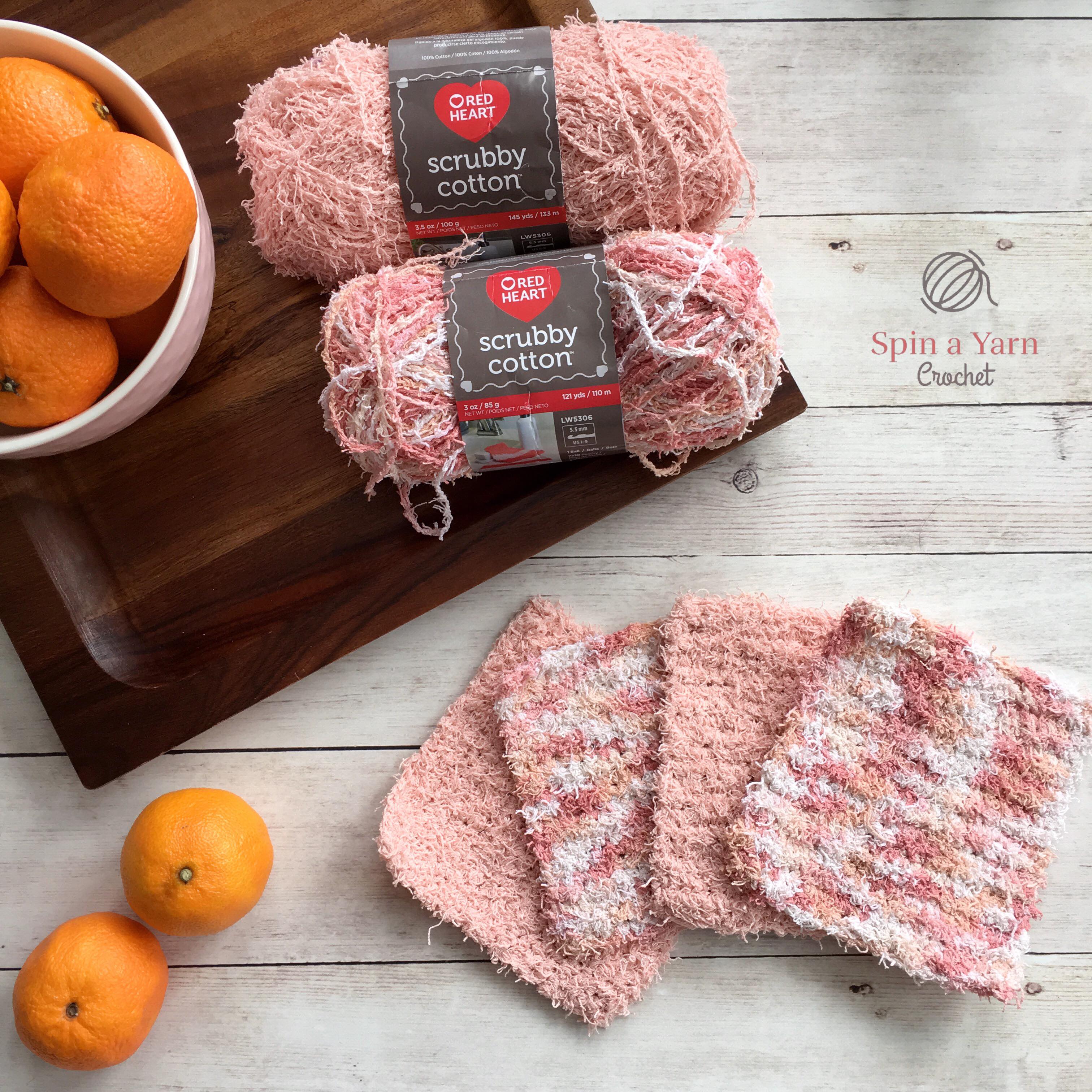 I love these shades of the Red Heart Scrubby Cotton yarn; they compliment each other so well and make a perfect little set; they’d be great to add to a basket with some home-made preserves and a little succulent plant for a house warming gift for a friend or neighbour. The colours are also perfect for a little practical Valentine’s Day project! (…just don’t give them as a Valentine’s gift to your partner; it may not go over well.)
