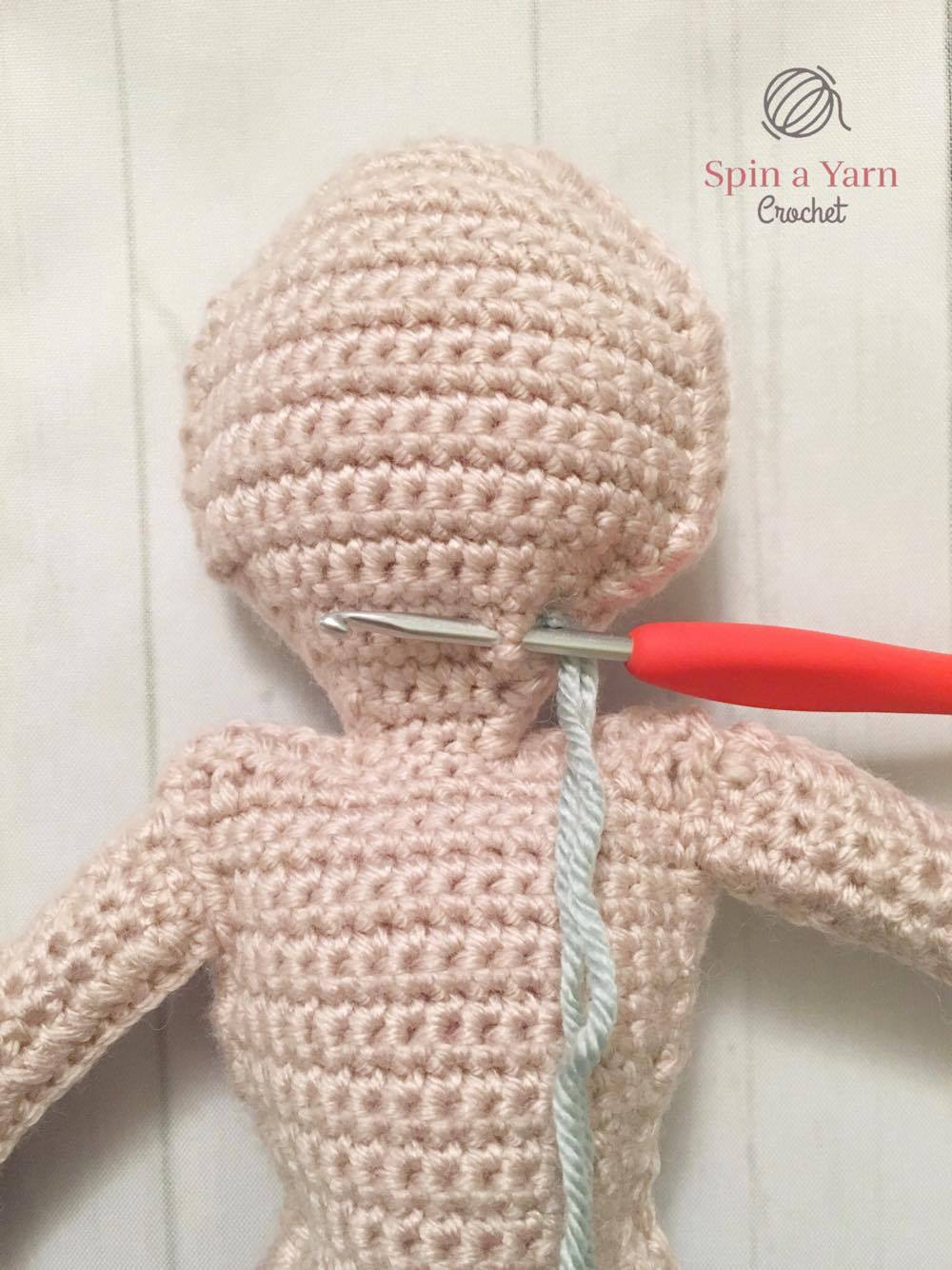 We started on the back of the head, about 6 rows up from the shoulders. We didn’t measure the exact length of the strands, as they will be different depending on whether you are attaching them to the top of the head or the bottom. We simply measured them against the mermaid to make sure they came down a few centimeters below the bottom of the tail.