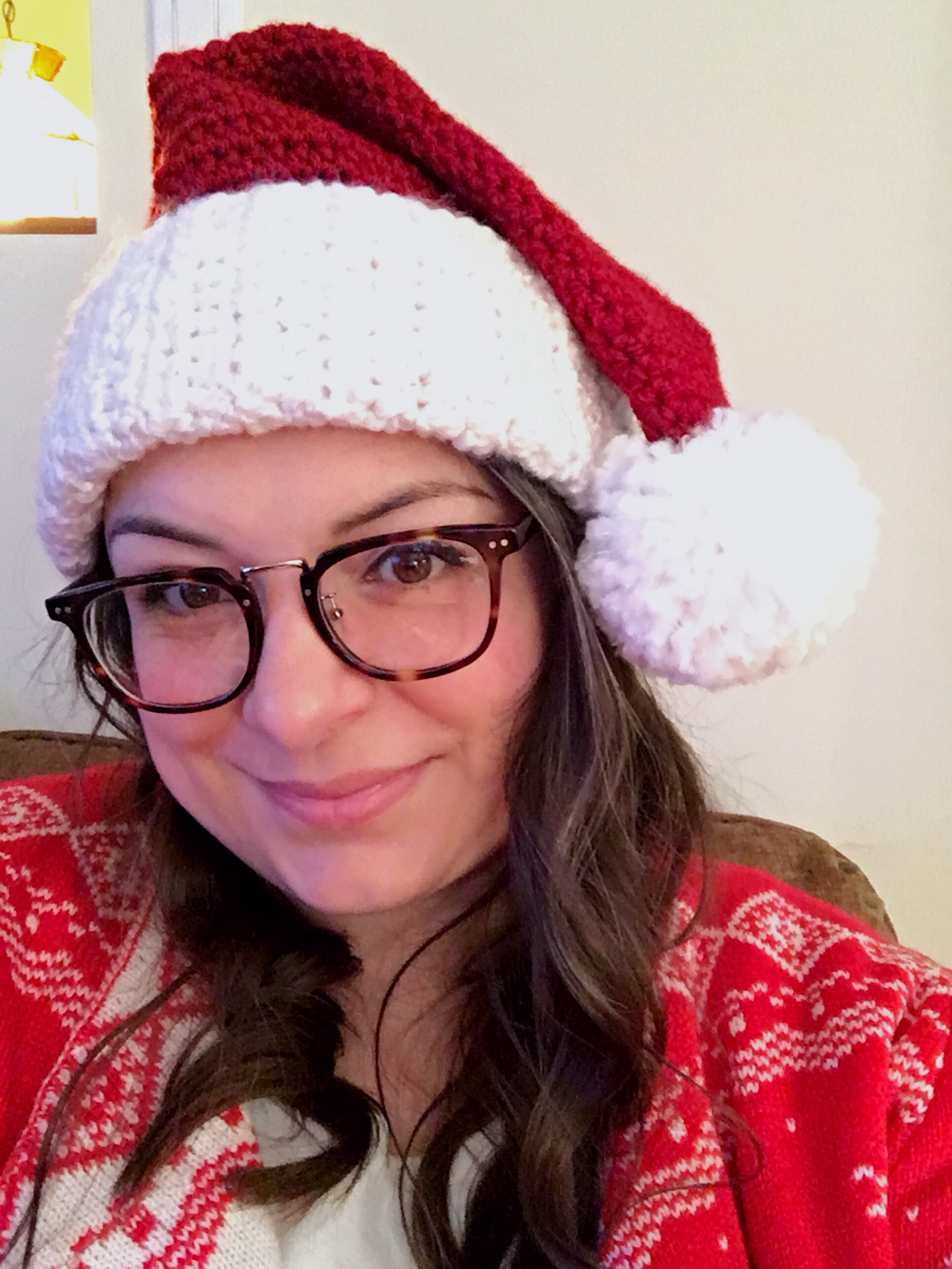 I know everyone is busy this time of year but I wanted to share this Santa Hat I made in case you were also looking to increase your holiday cheer game! It was a totally last minute project (literally finished it on Christmas Eve!) but I found myself with some time and decided a luxurious hand-crafted Santa Hat would be perfect to wear to all the holiday festivities this week. It features a thick, folded/double brim and a super fluffy pompom. But the cranberry-colored yarn is what makes this hat in my opinion, giving it a rich and classic Santa look.