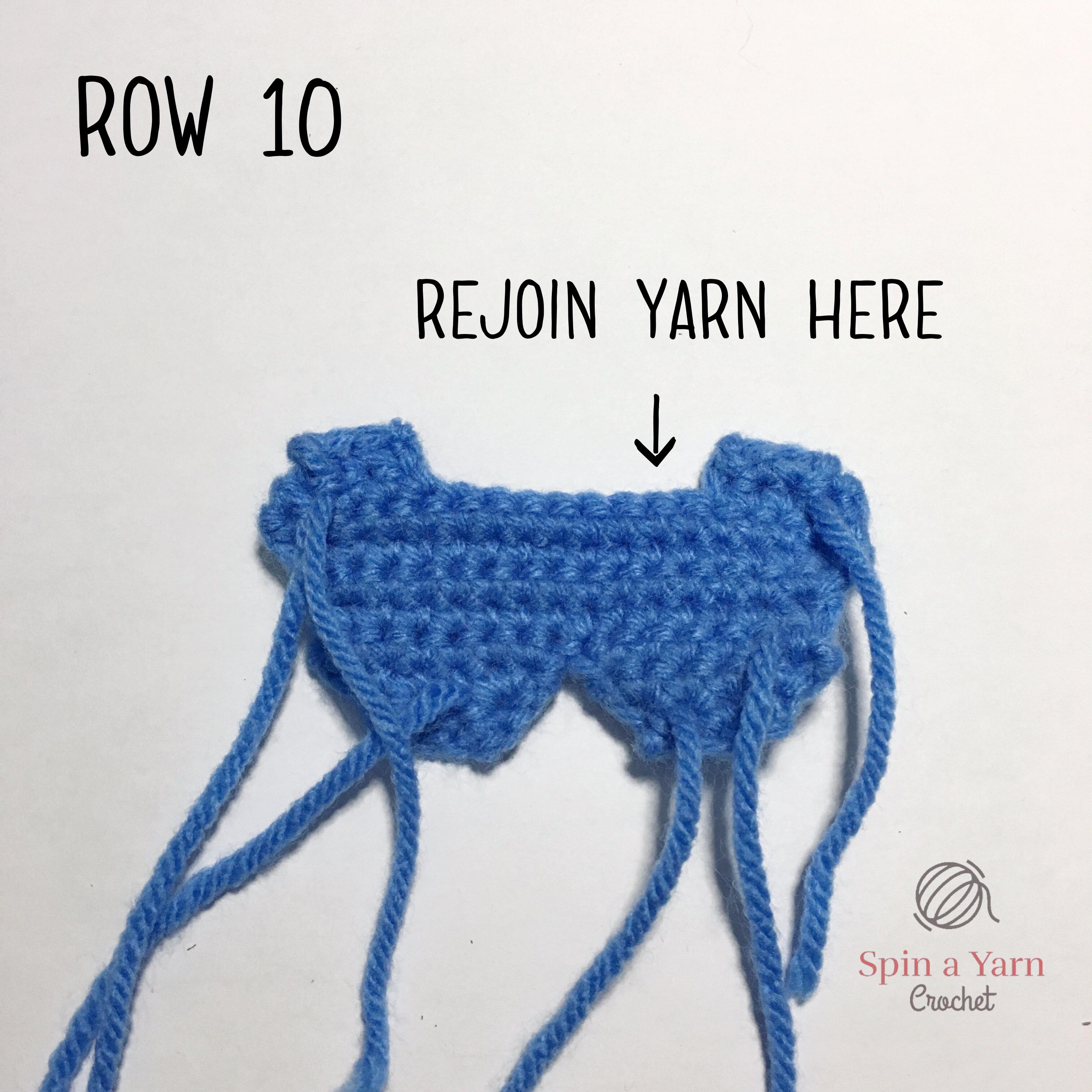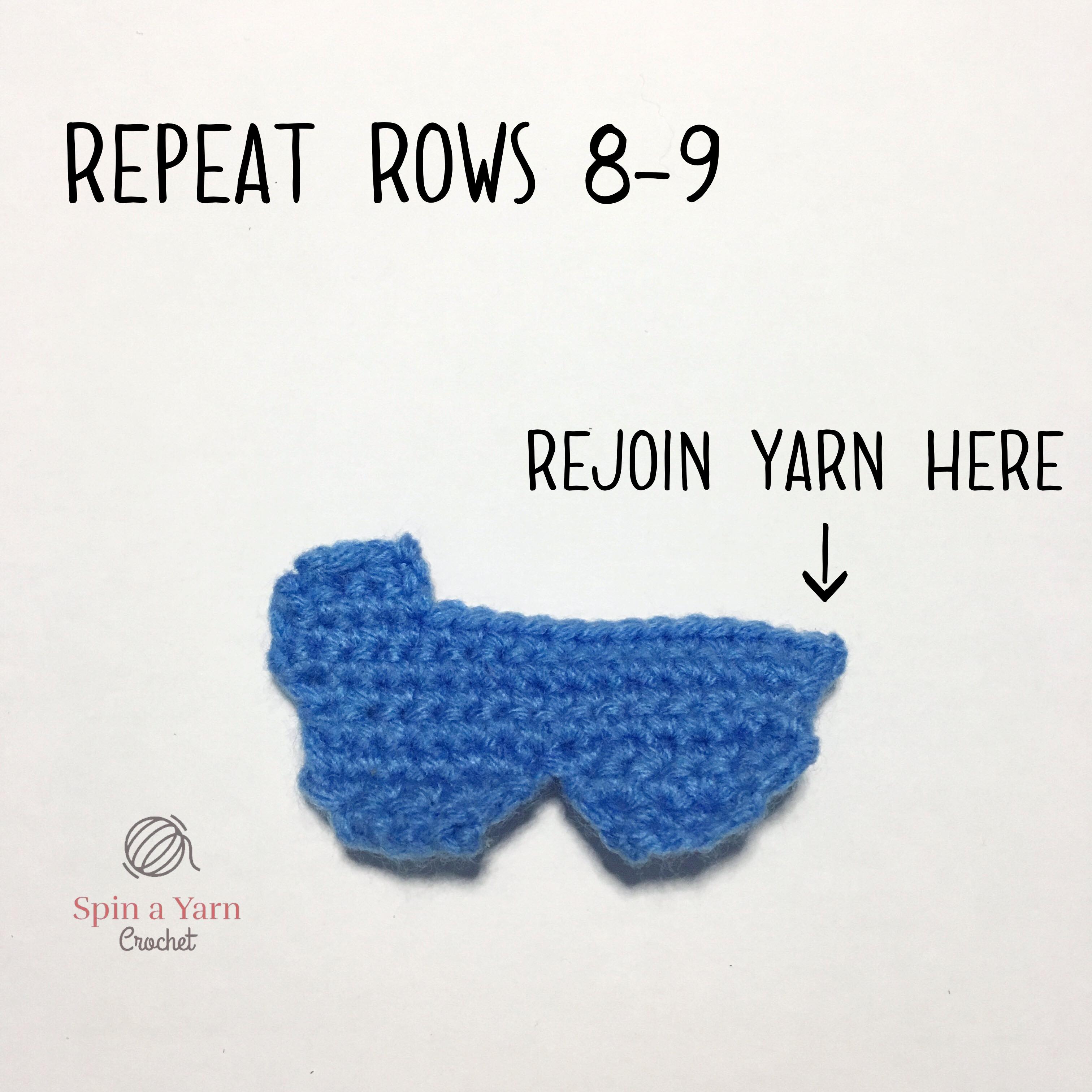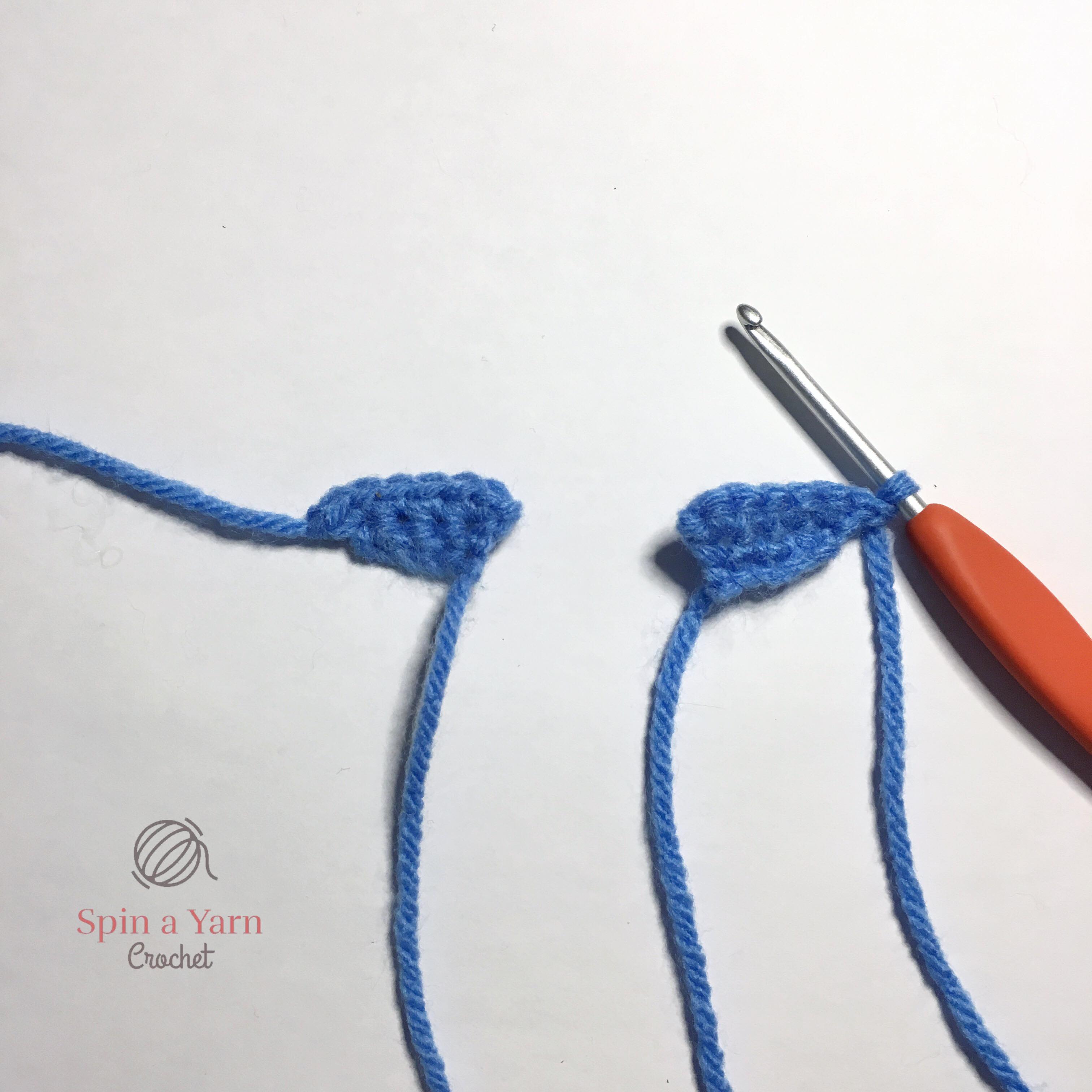 Now you have two separate pieces, as seen above. In row 3, you will crochet across the first piece on your hook and then join the second piece and continue crocheting across, joining them.