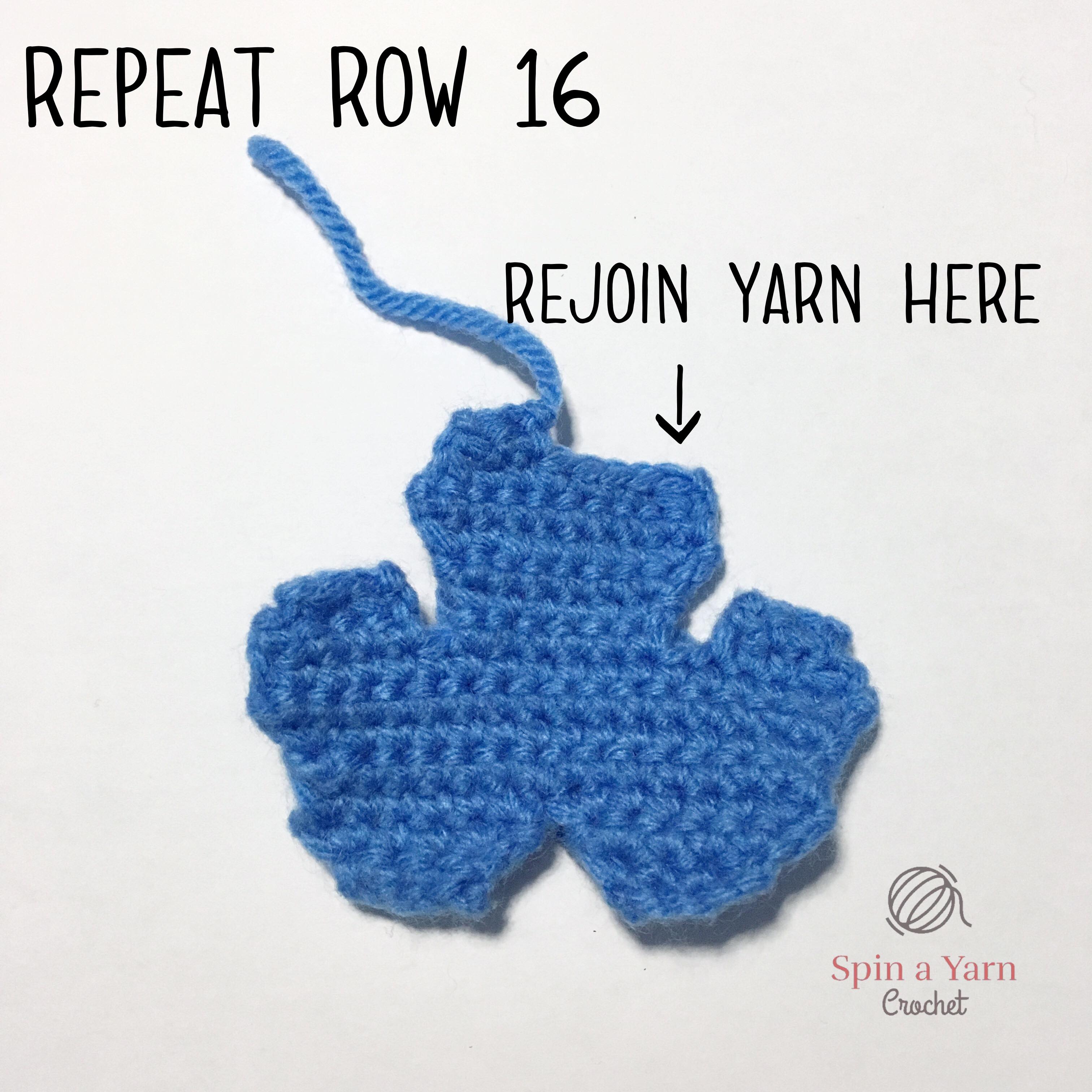 Crochet 2 sc into each of the 2 sts at the top of each leaf.
