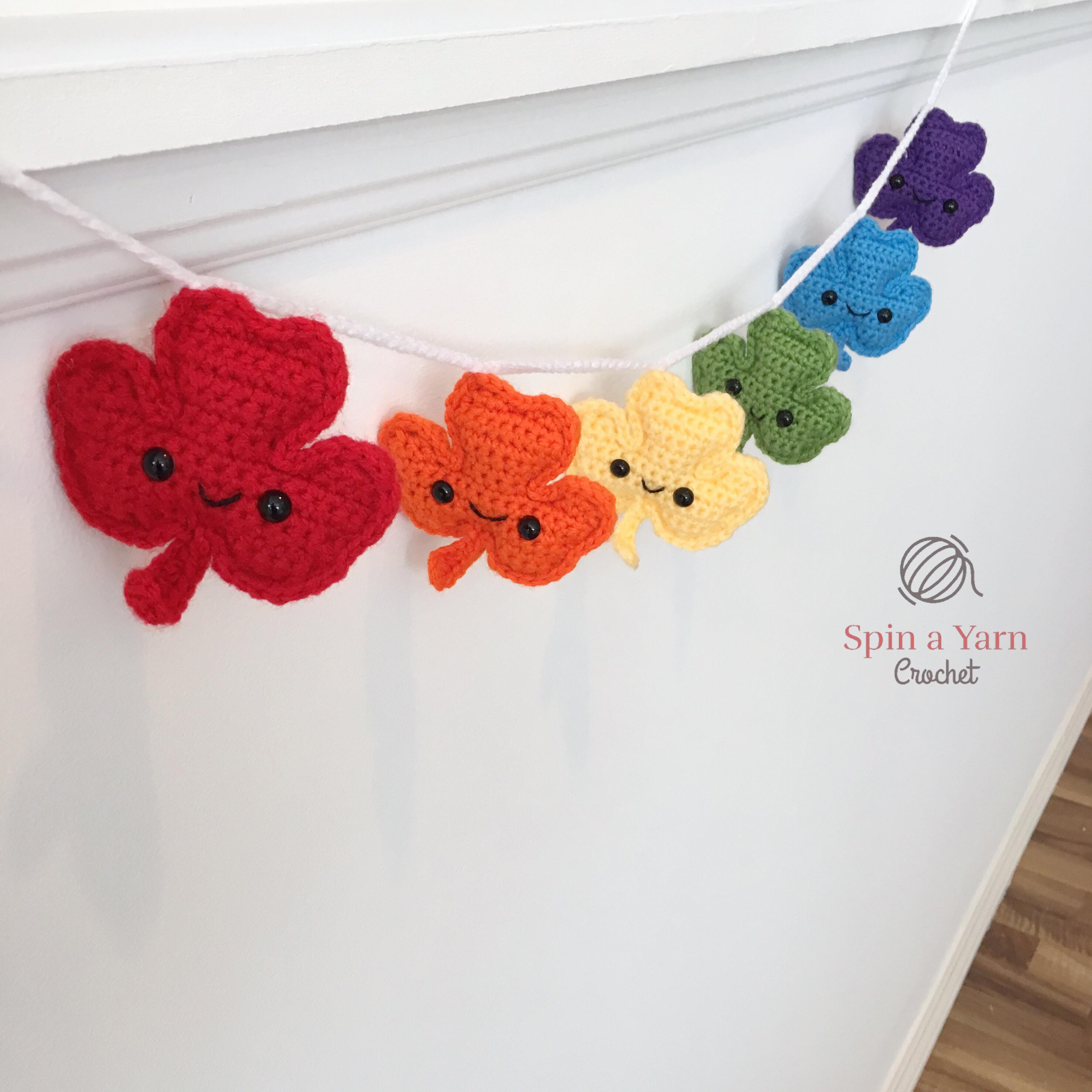 That’s it! If you want to add them to a garland, I simply chained 20 in white yarn, inserted my hook into the top of one of the leaves of a shamrock to attach it, then chained 20 more, attached the next one, and so on until I had attached them all.