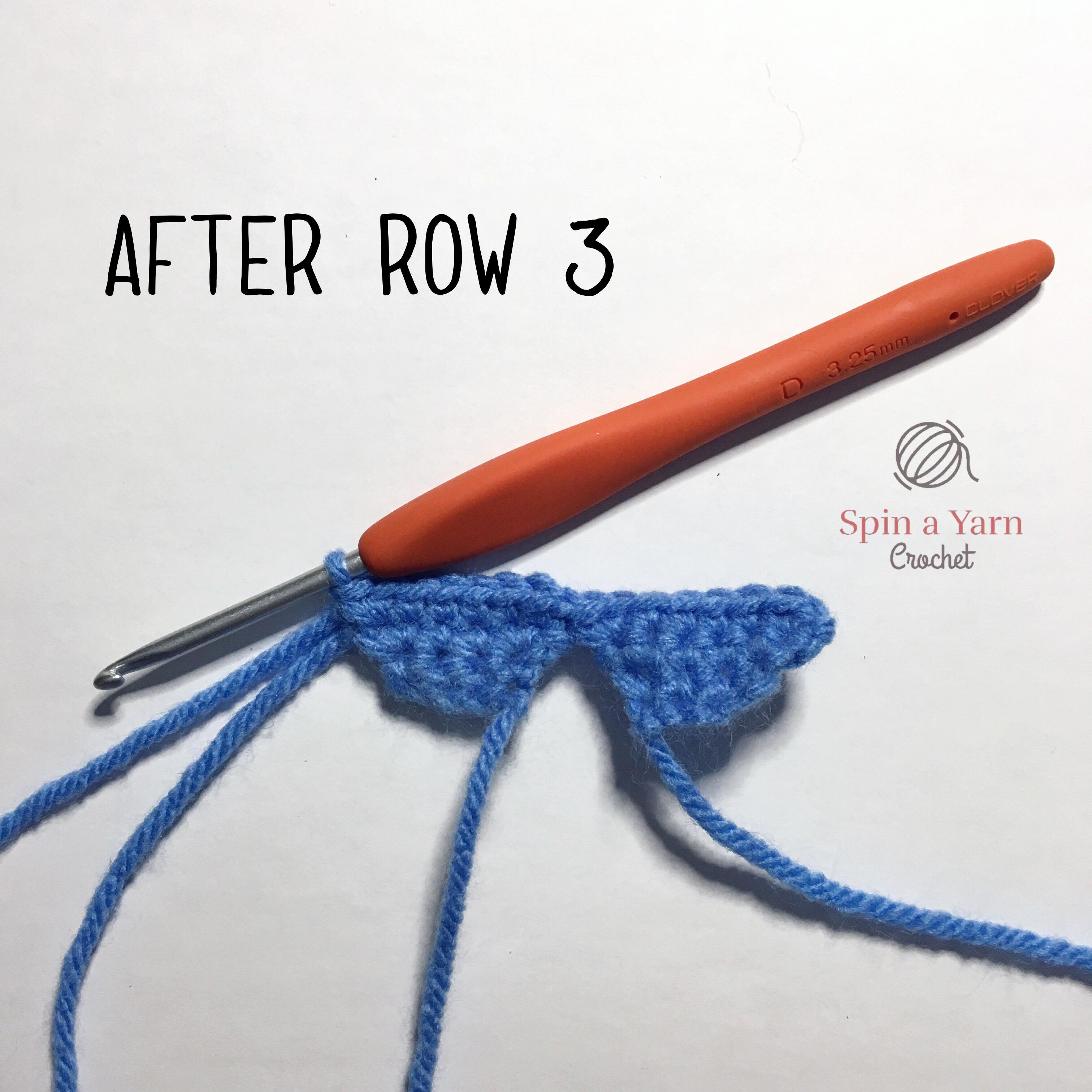 Row 3: Inc, sc 4, inc, inc, sc 4, inc (16 sts)