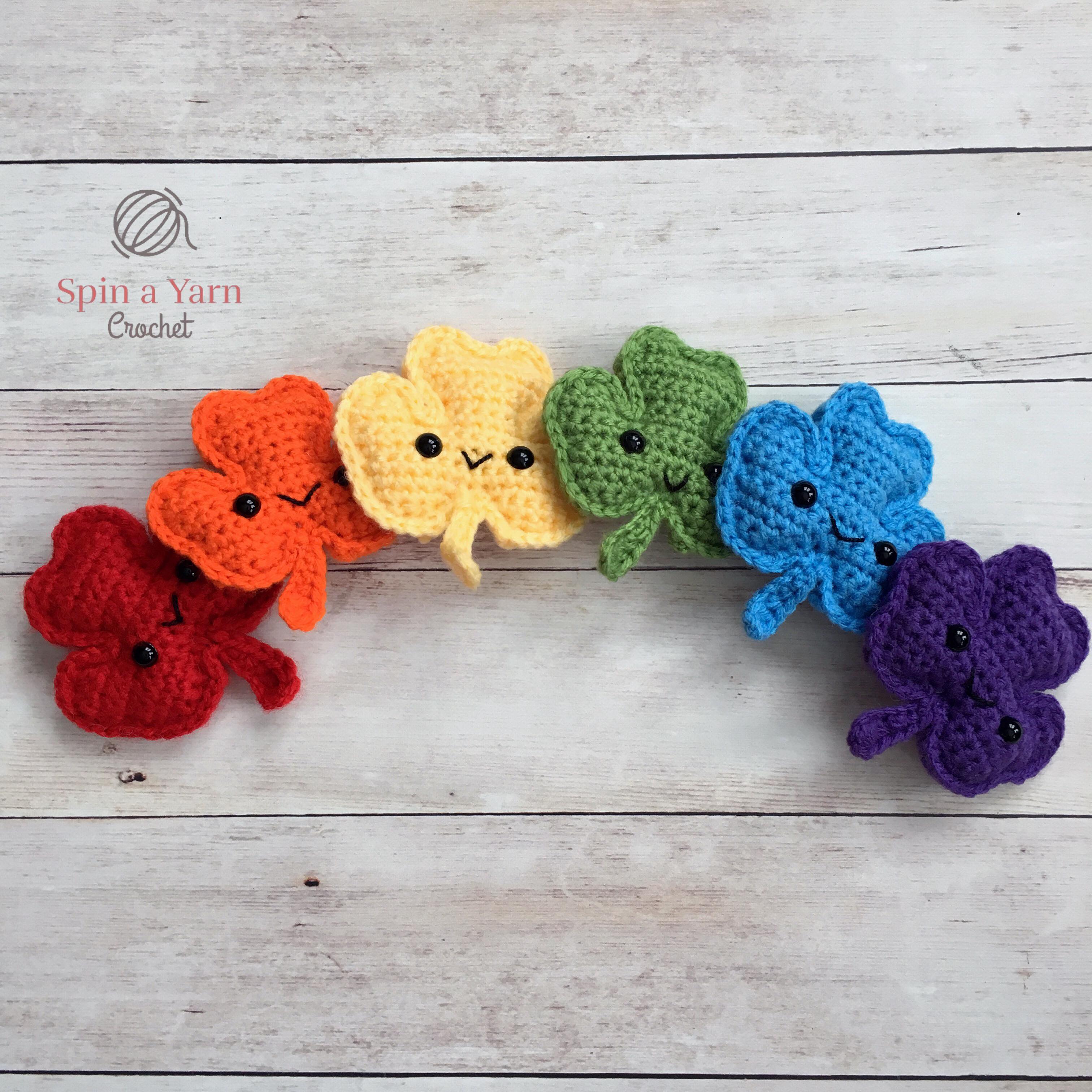 I made a bunch in rainbow colours because #potofgold, but you can make them all in green, different shades of green, or a combination of green and white. I think they are pretty darn sweet! And super quick to boot (I made all 6 of these in one afternoon/evening). The only thing I regret is not adding some happy eyes to some of these cuties to make them even sweeter (check out my video tutorial on how to crochet happy eyes on amigurumi).