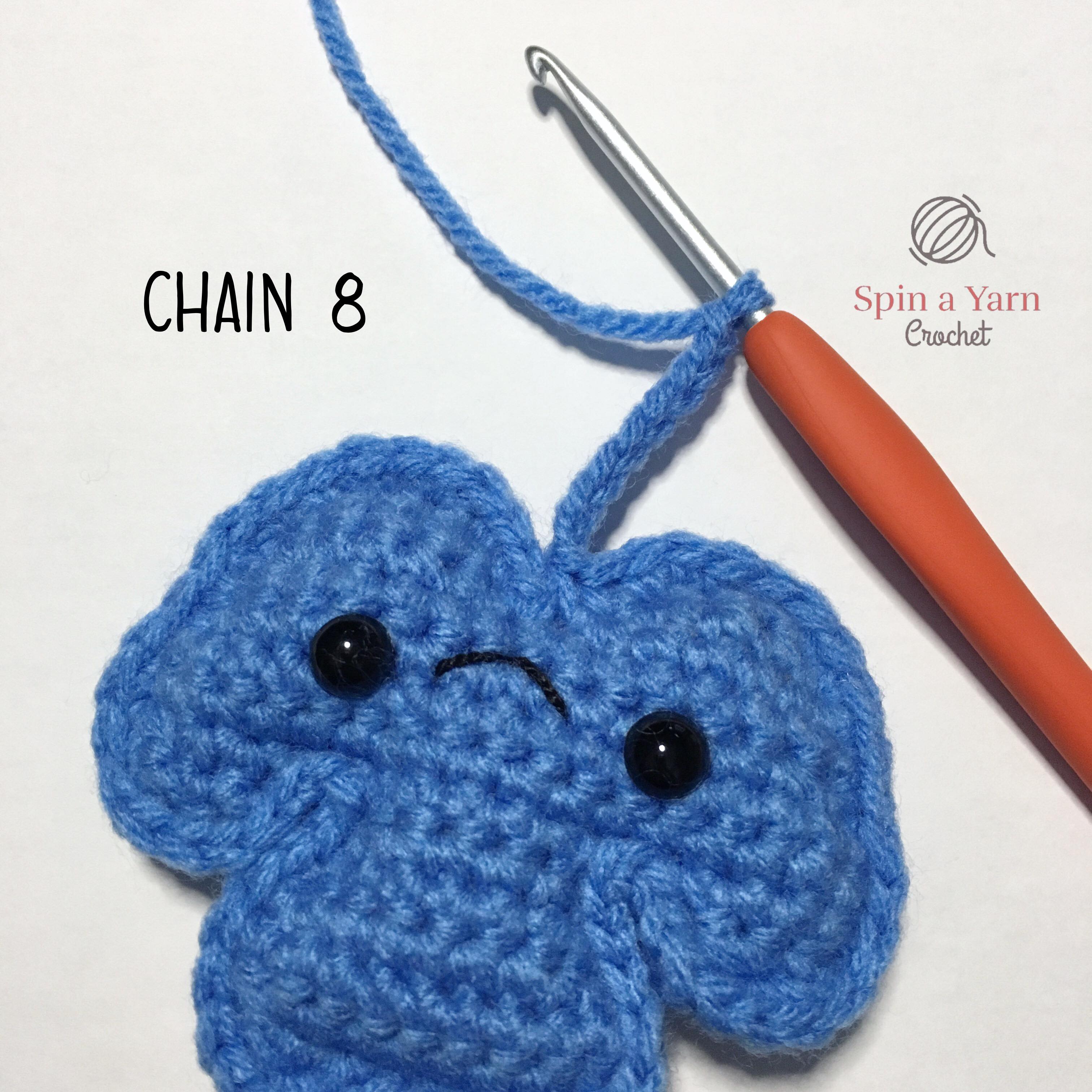 Stem: Chain 8, starting in 3rd ch from hook, dc 2, hdc 2, sc 2 along chs (6 sts).