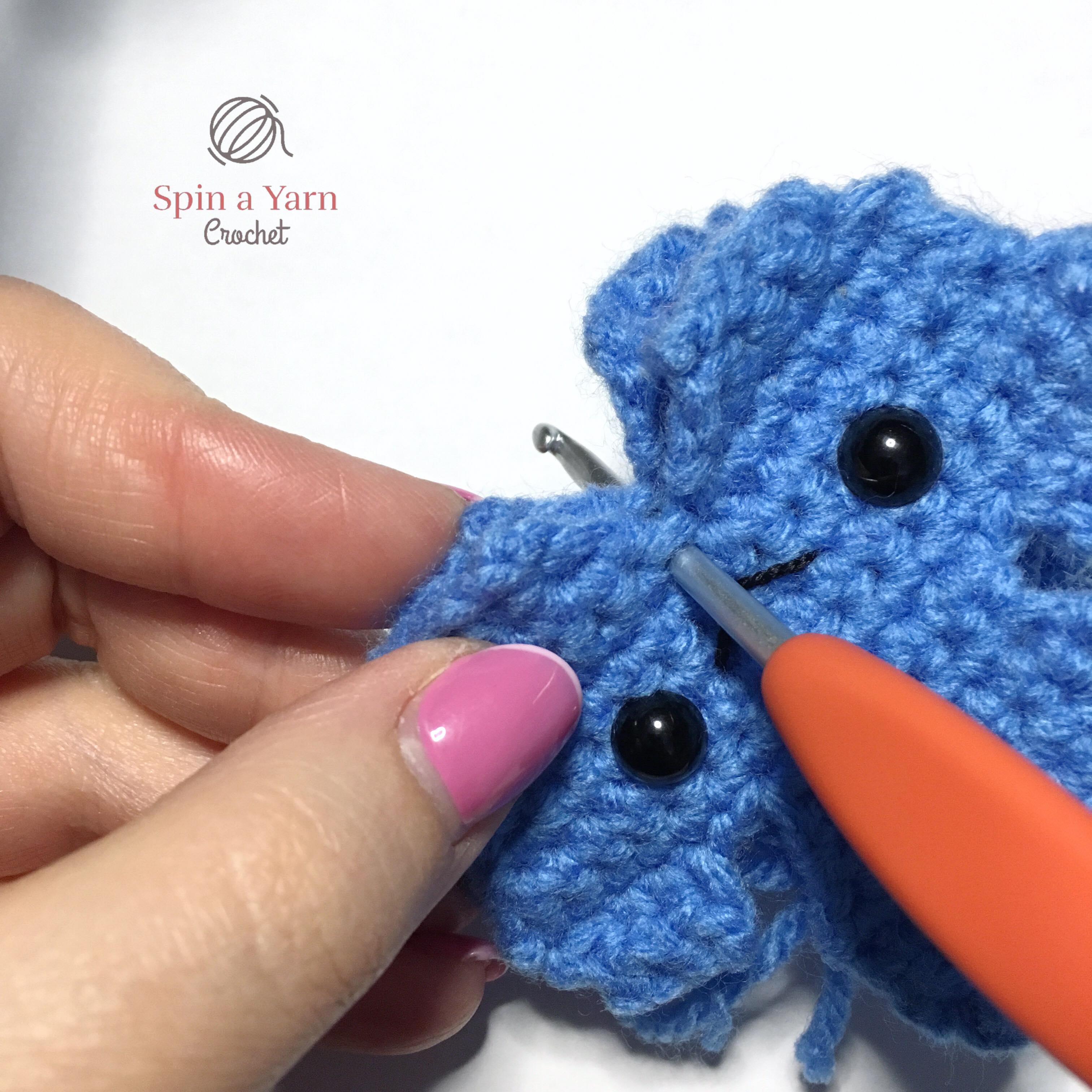 Using your tapestry needle and black crochet thread, stitch on a little mouth between the eyes.