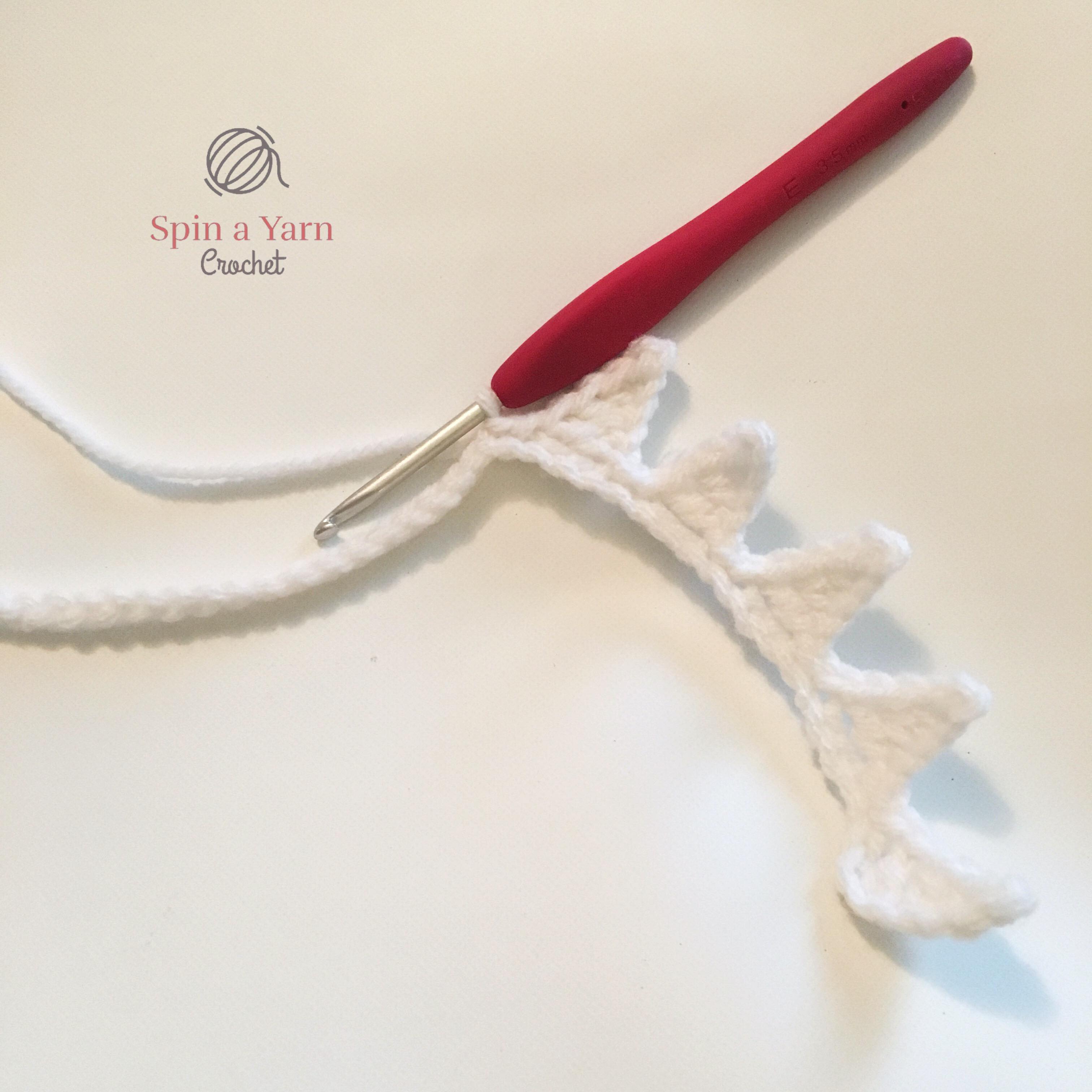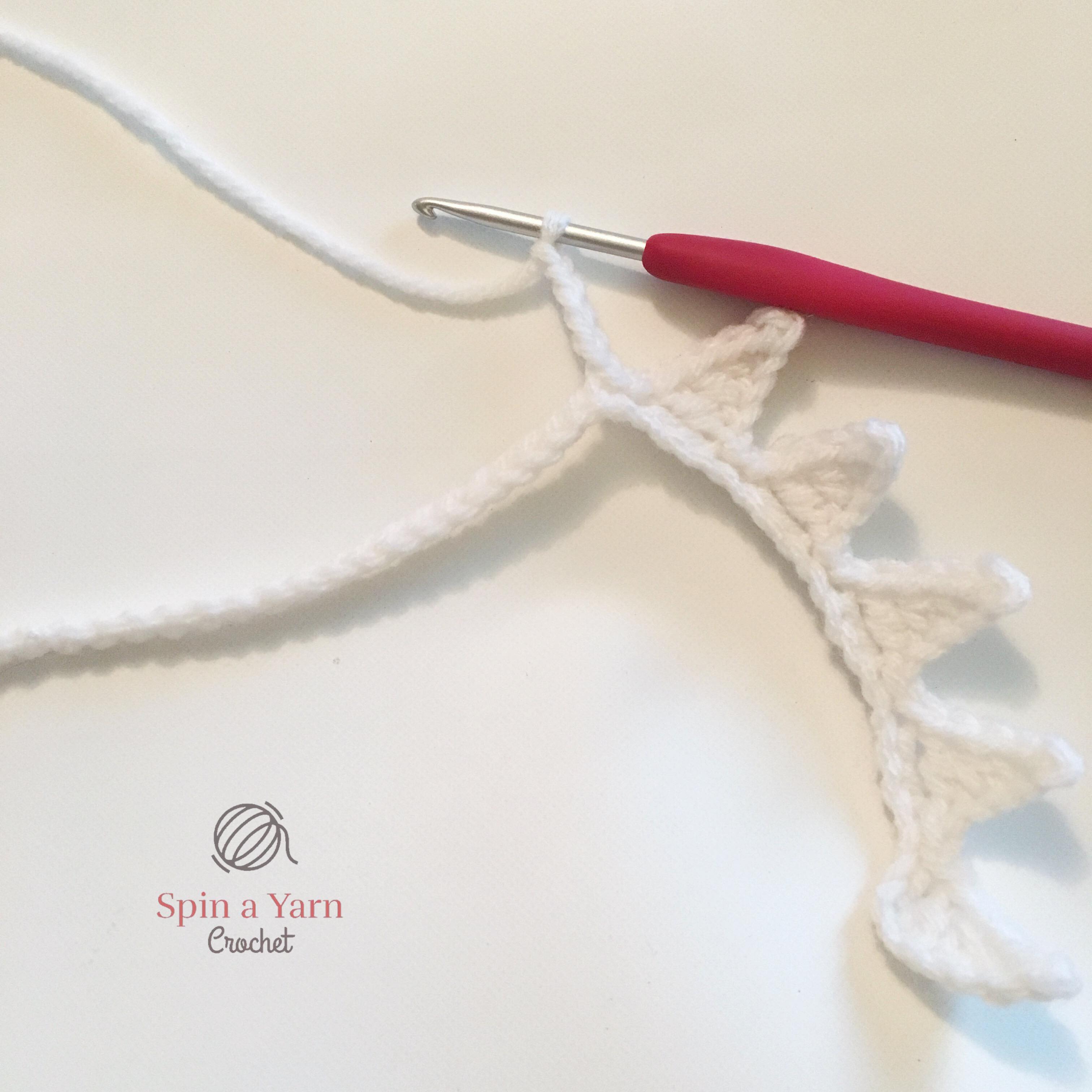 Row 1: Ch 101 + ch 7 for first tooth. Starting in 1st ch from hook, slst, sc, hdc, dc, sk 2 chs, slst in next 2 chs (1 tooth), *ch 5, slst, sc, hdc, dc, sk2 chs, slst in next 2 chs* (1 tooth), repeat from * across.