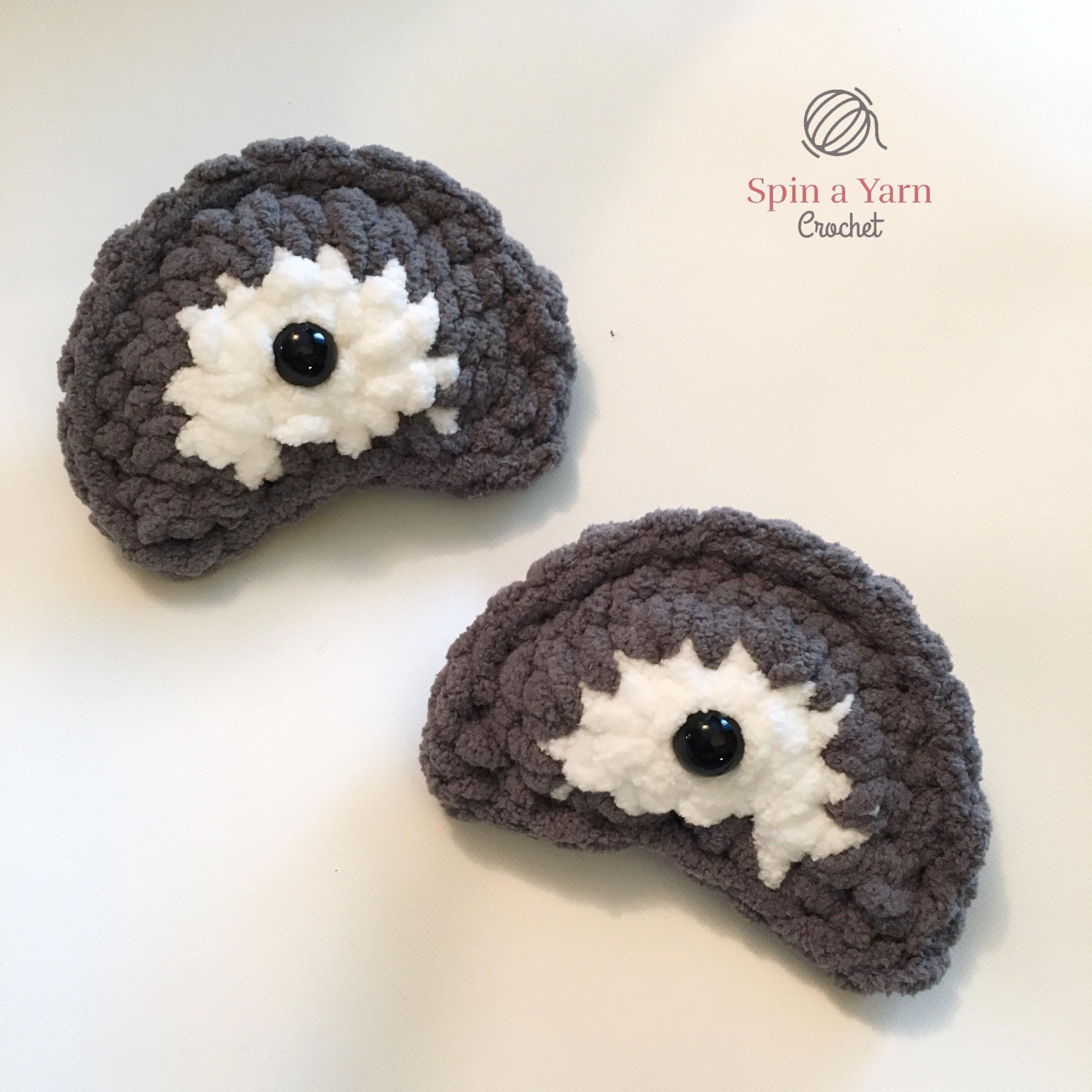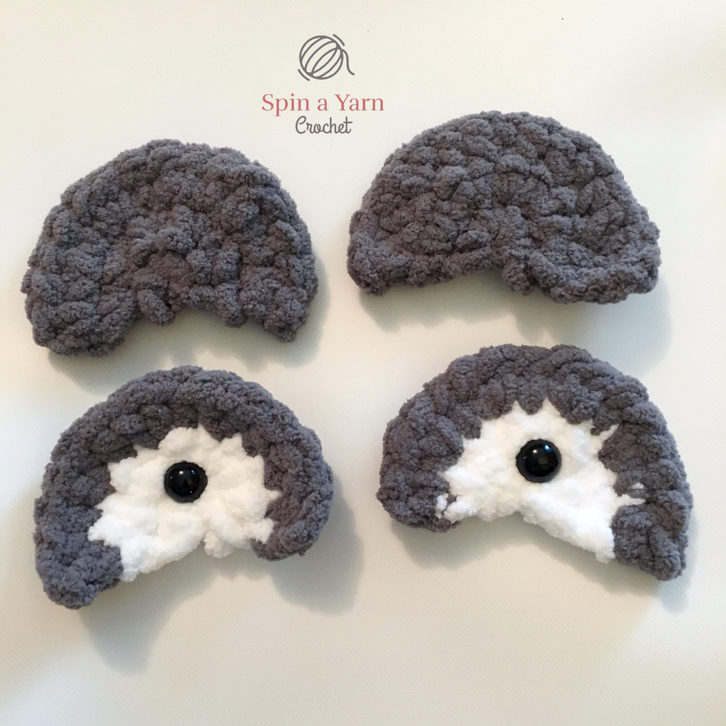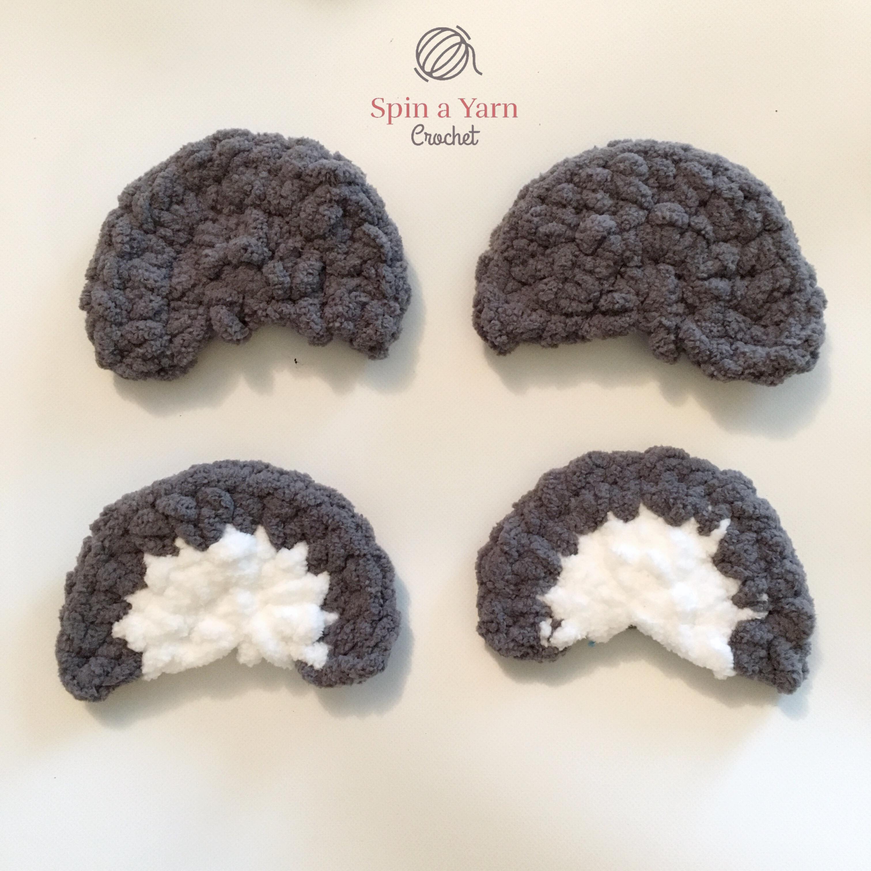 Place two panels together (i.e. use one with the white centre and one all grey), matching up all sides, then join the panels by ch 1 and sc around both panels in Dark Grey. Make sure the front of the eye is facing you as you crochet around. (Sc, ch 2, sc) in the same st at the bottom of the semi-circle (i.e. in the corners of the flat edge). Stuff lightly when you’ve crocheted about two-thirds of the way around. Continue crocheting around. Slst to first st to close. Tie off and poke the yarn tails back inside the piece. Repeat for second eye.