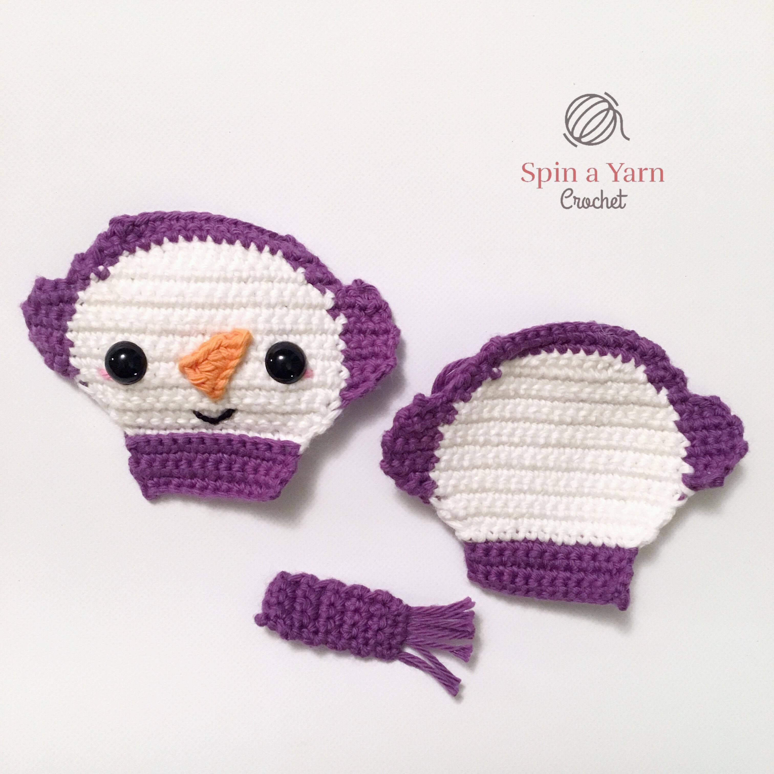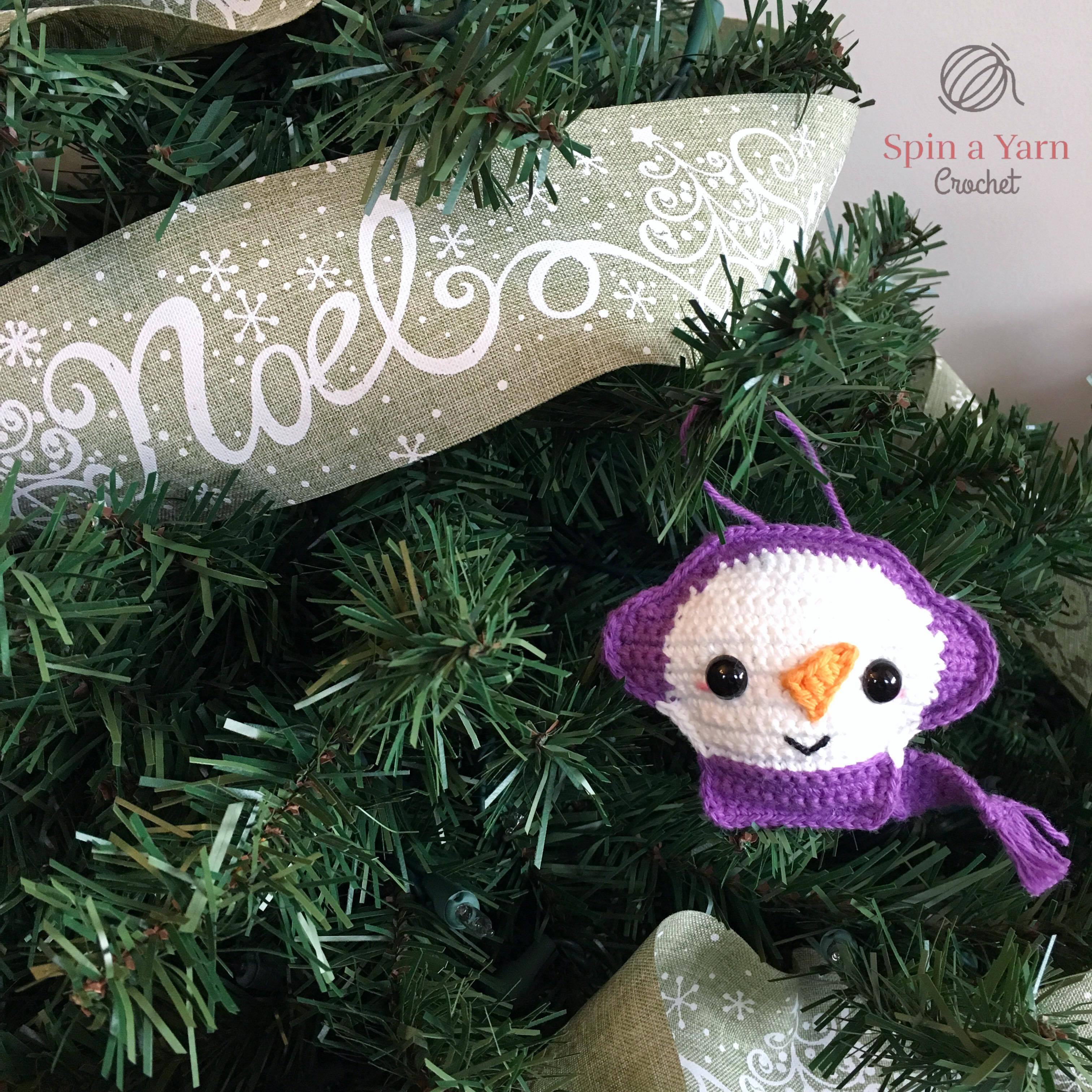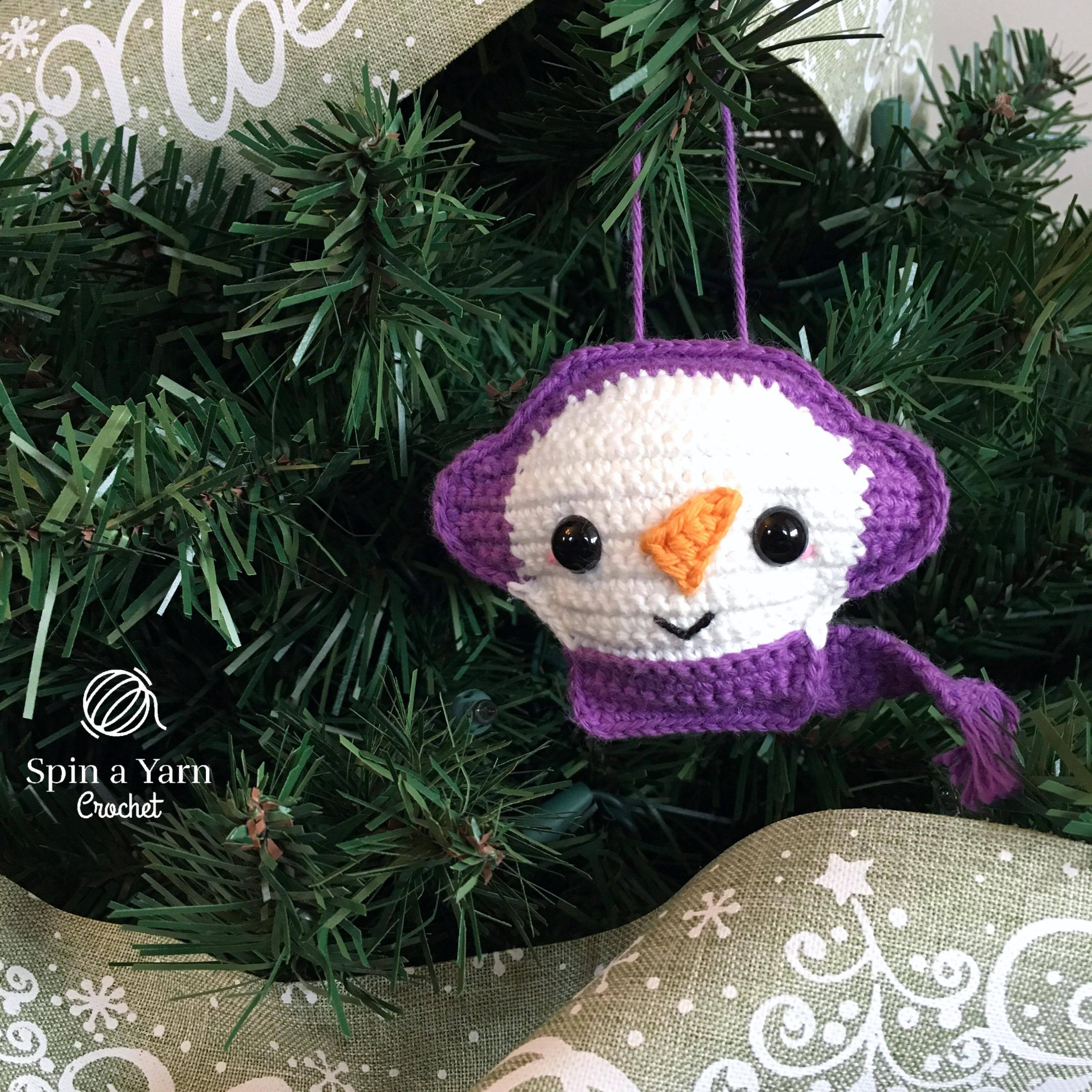 Crochet all the way down and around your snowman. You will need to switch to white yarn when you get to the face, and back to purple again when you get to the scarf.