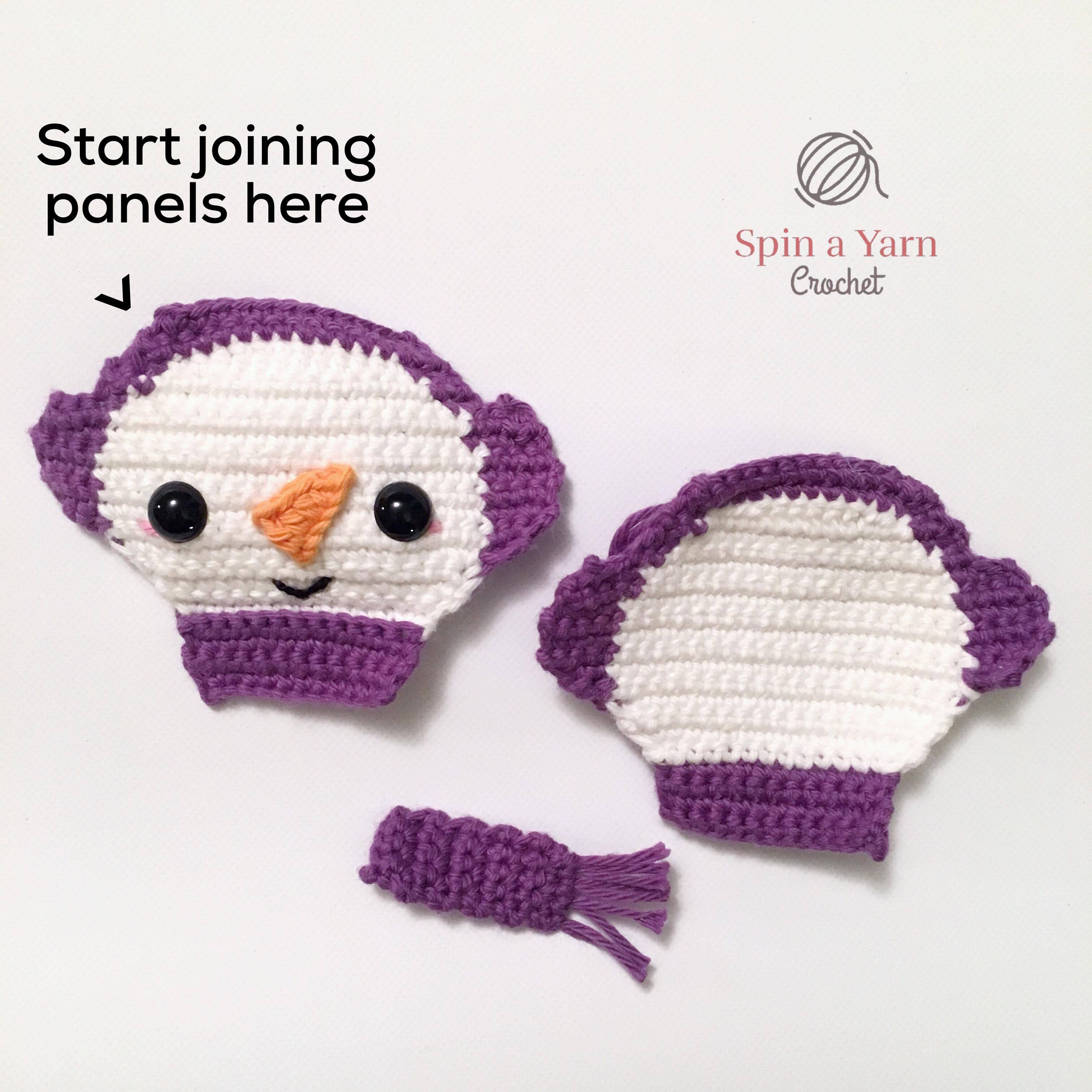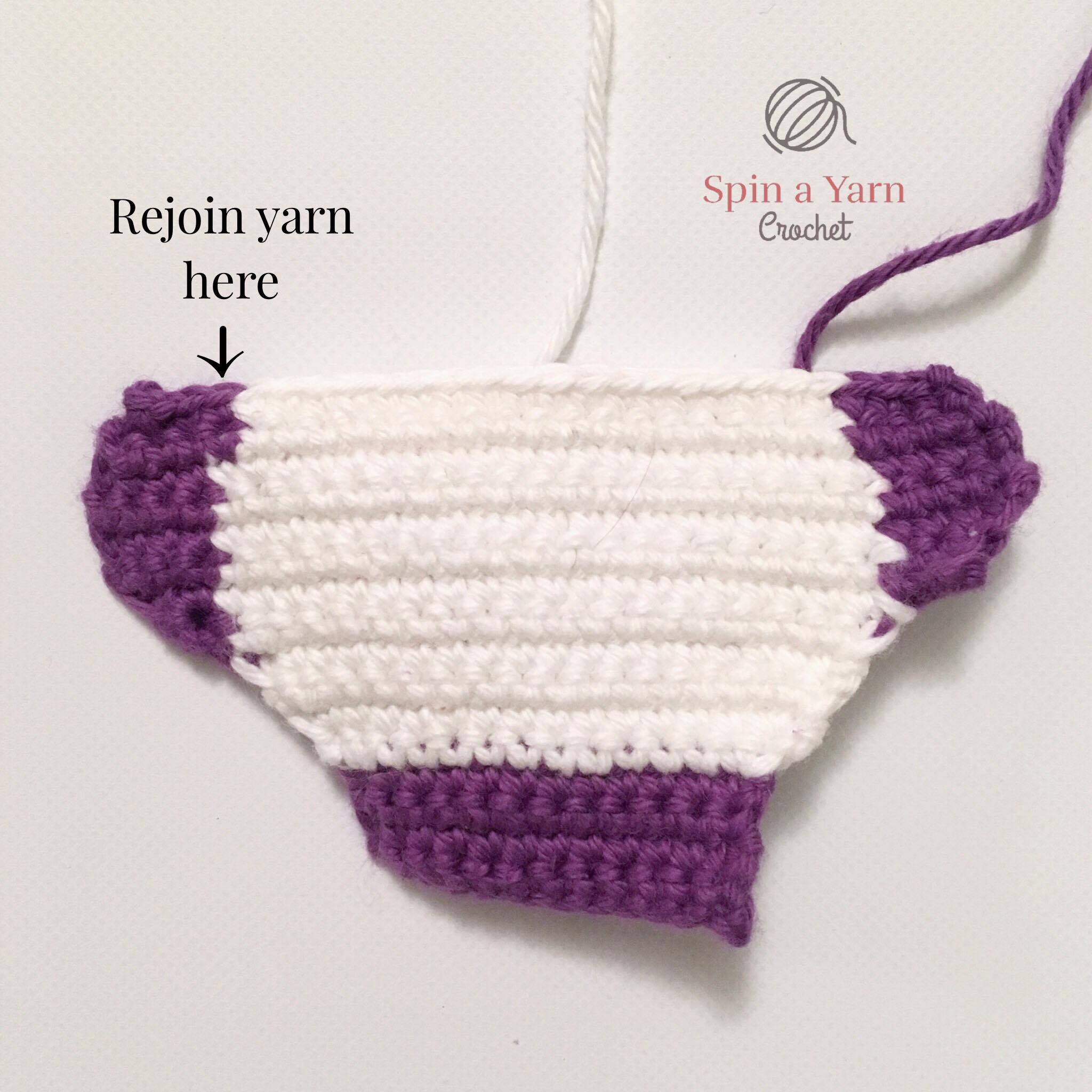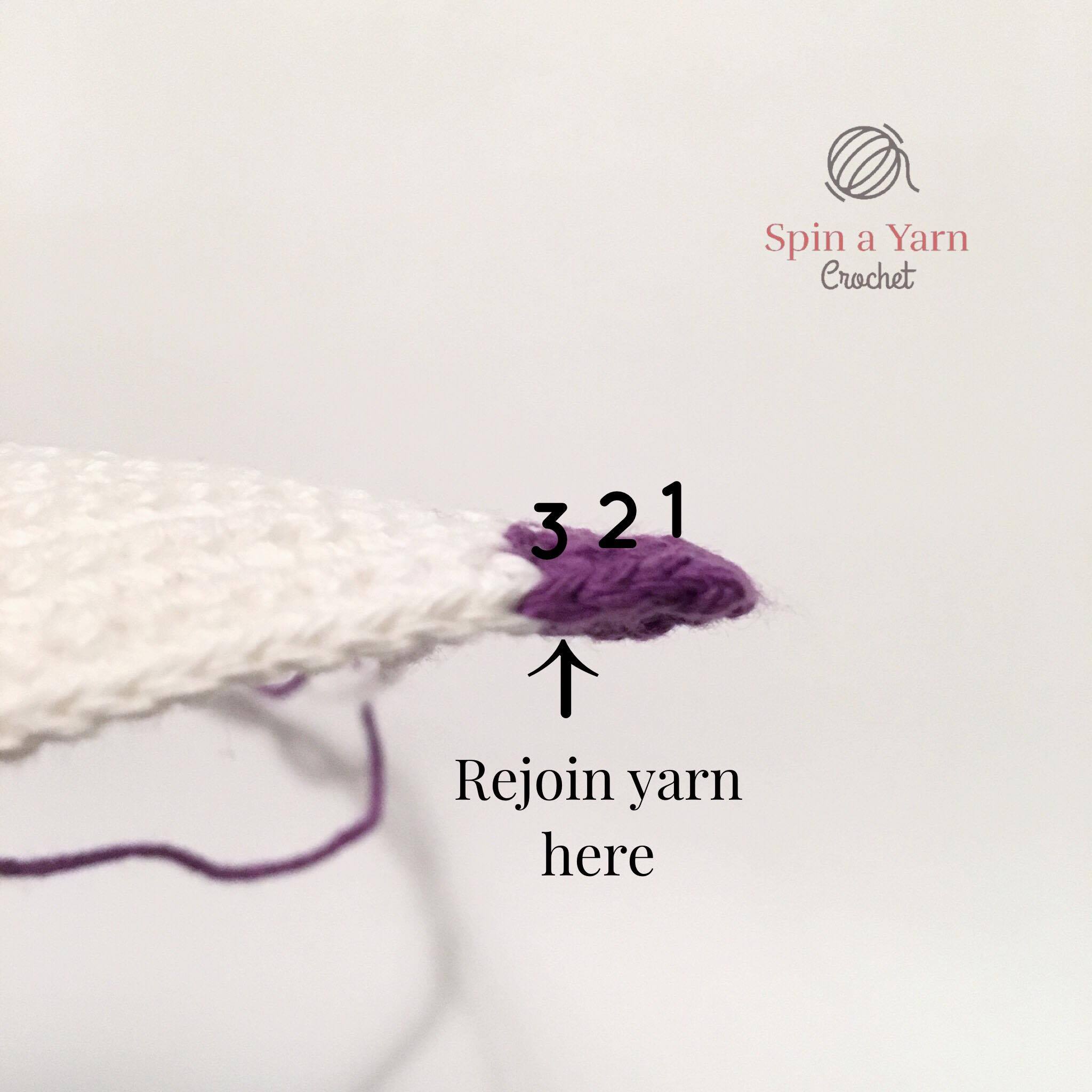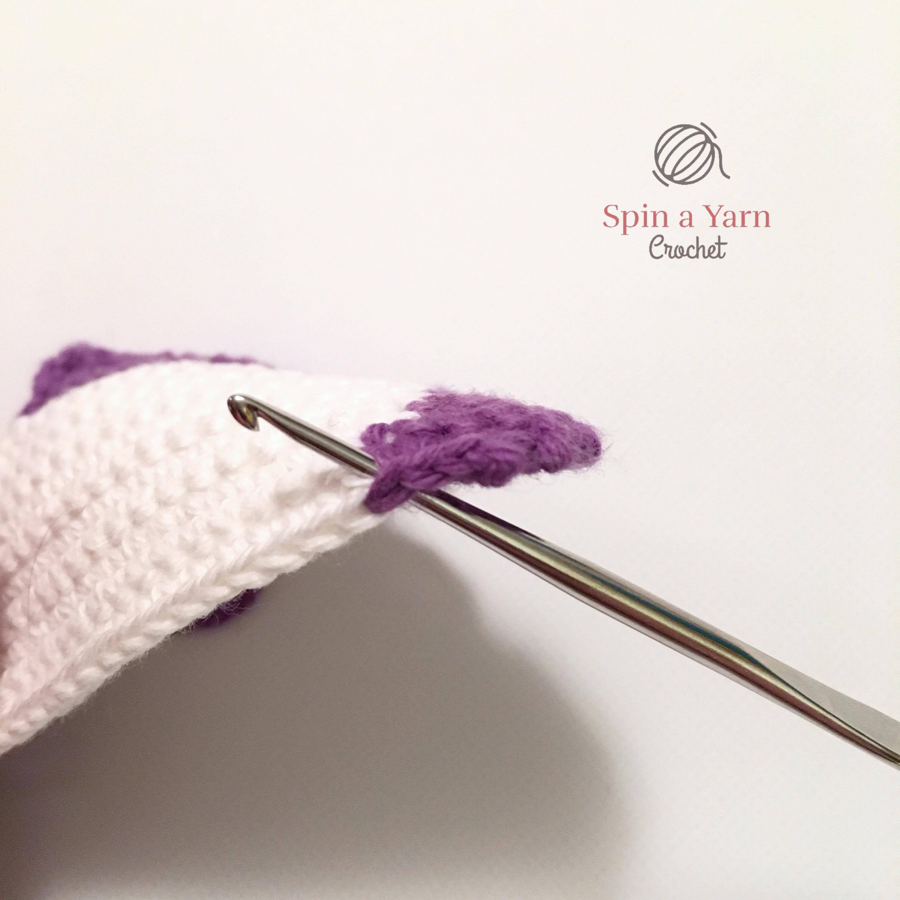 Everything is worked in single crochet stitches. So, in order to indicate the colour-changes, I have omitted the usual “sc” in front of the stitch counts in any lines with colour-changes and I’ve used the associated colour letter instead. For example, “Pdec” means to work a sc decrease in purple yarn. “P4, W1” means to work the next 4 sc in purple and the next 1 sc in white, and so on.