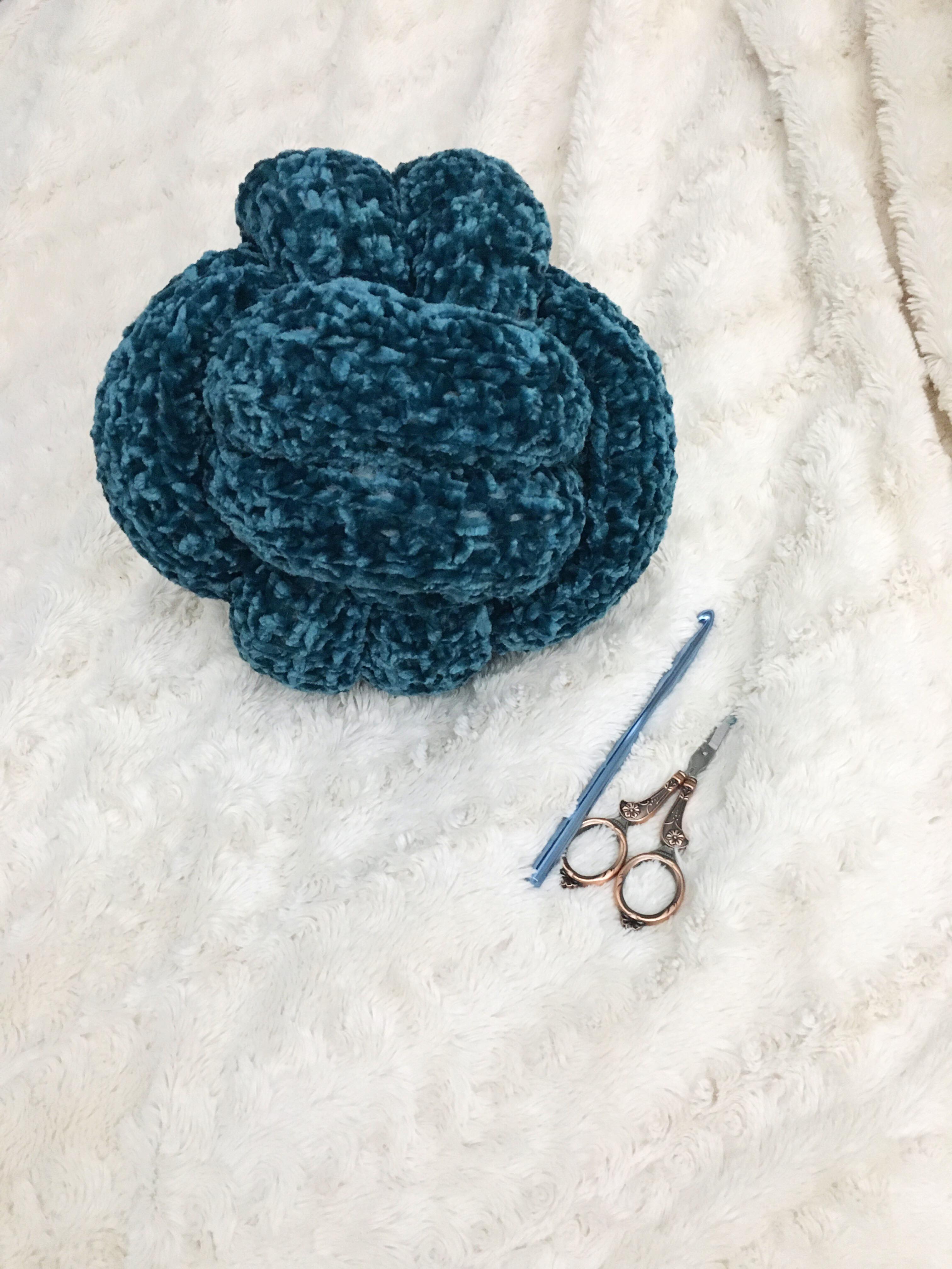 The pillow, as it turns out, is genius in its simplicity. It is essentially one giant panel, which is then seamed into a tube (and stuffed) and knotted together (that’s where the magic happens!) That being said, I really appreciate the planning that clearly went into this pattern to ensure that the yarn weight, guage, hook size, stitch, and length all came together in a very precise way to make the tube the *perfect* length and shape to knot into a flawless pillow at the end.